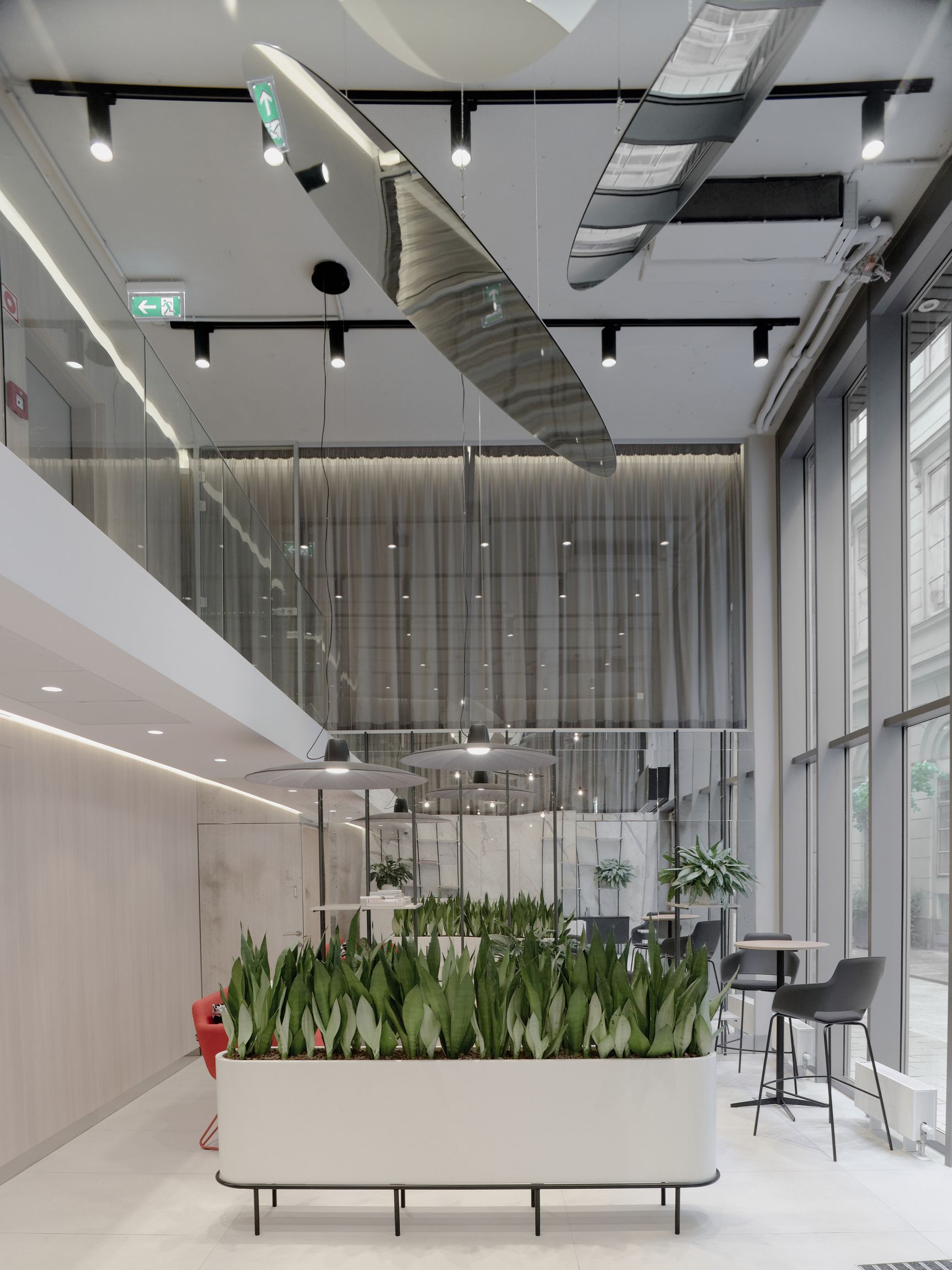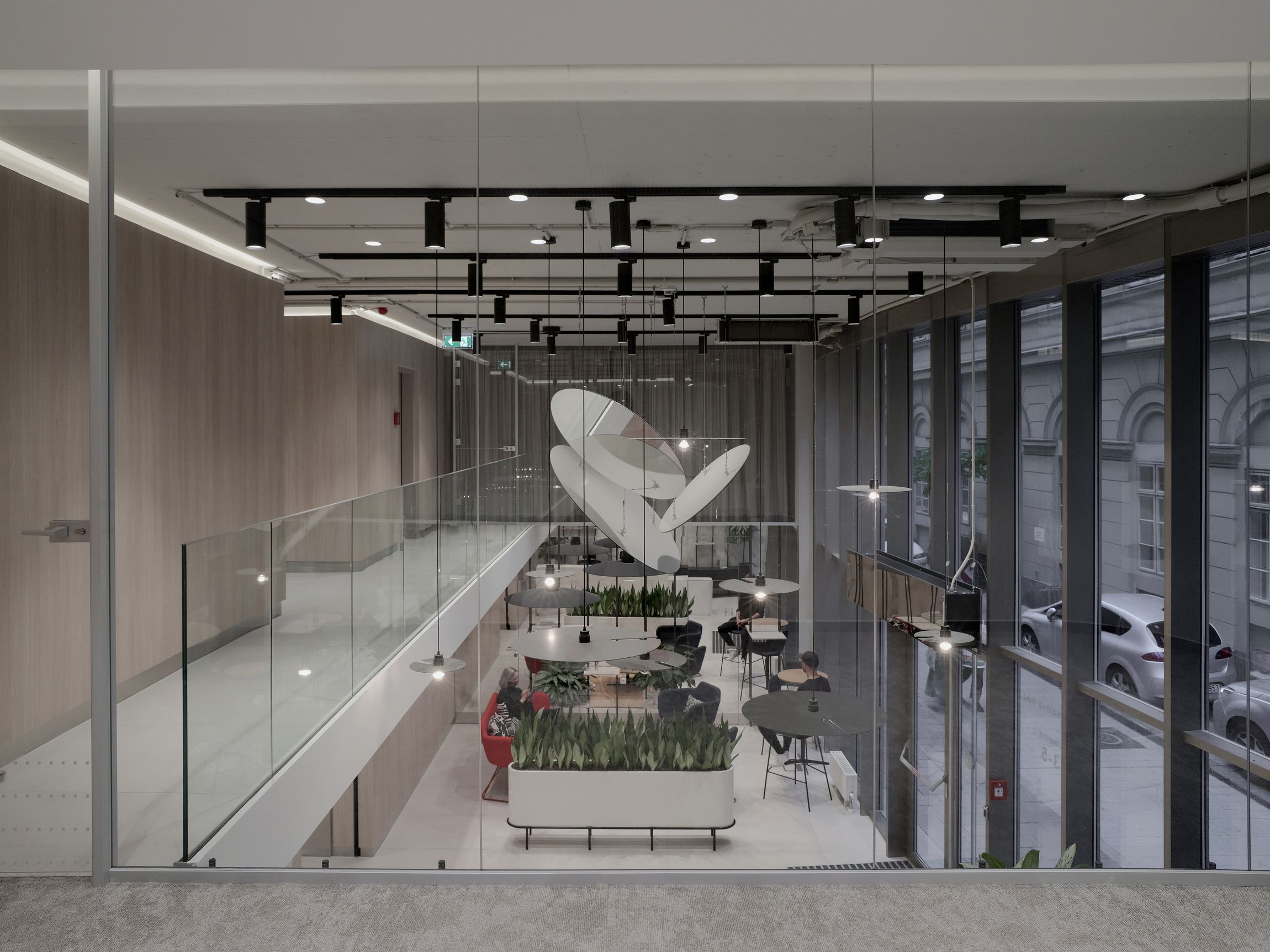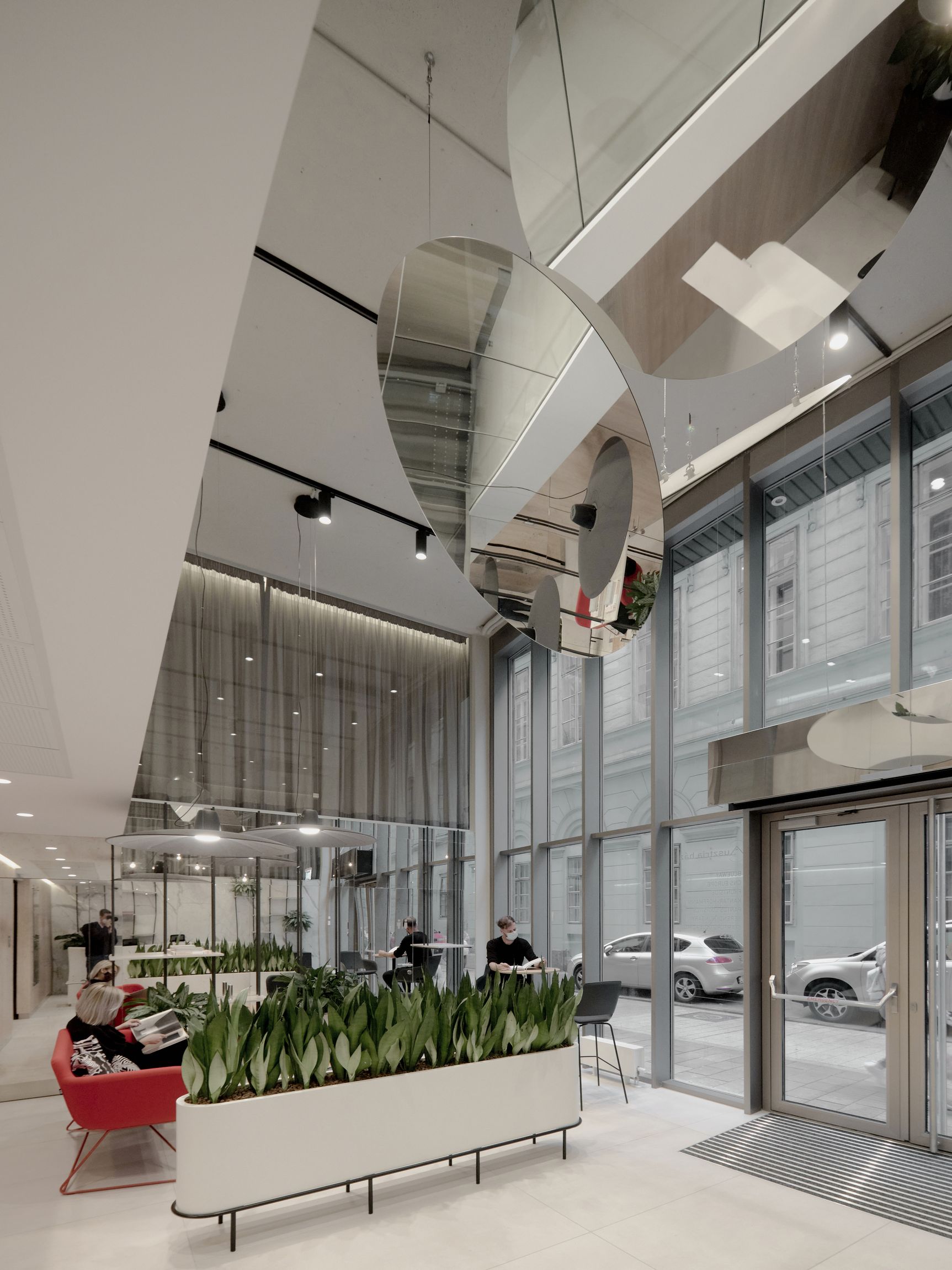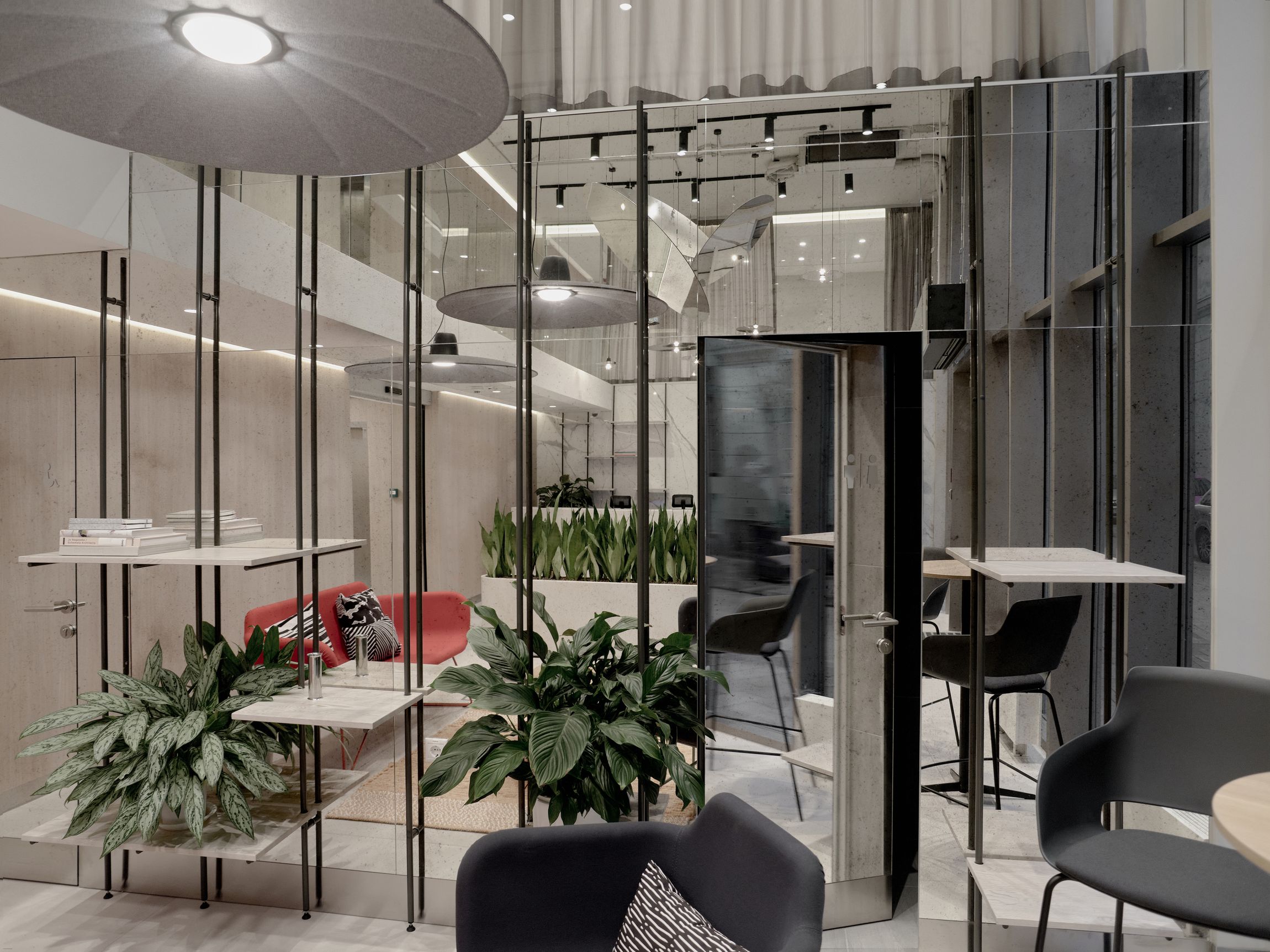 The main expectation was to create an open space, visible from the street. We freed up the room with transparency where possible, removed the shading from the facade and the suspended ceiling to gain a feeling of more space. We also used mirrors and reflective surfaces to virtually enlarge the place. We added a mini bar to the reception to serve the colleagues in the buildings, and provided more seats for meetings or informal gatherings. We adjusted different light solutions for the different times of the day. We also built in sound-proof and acoustically absorbent elements to soften echoing.