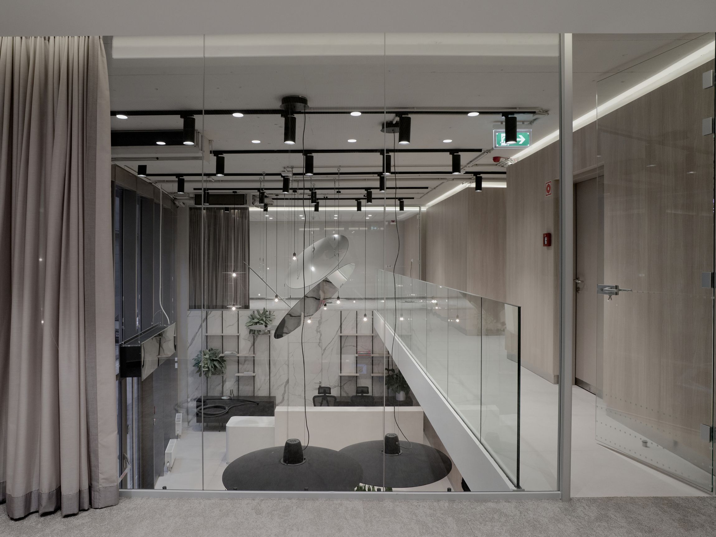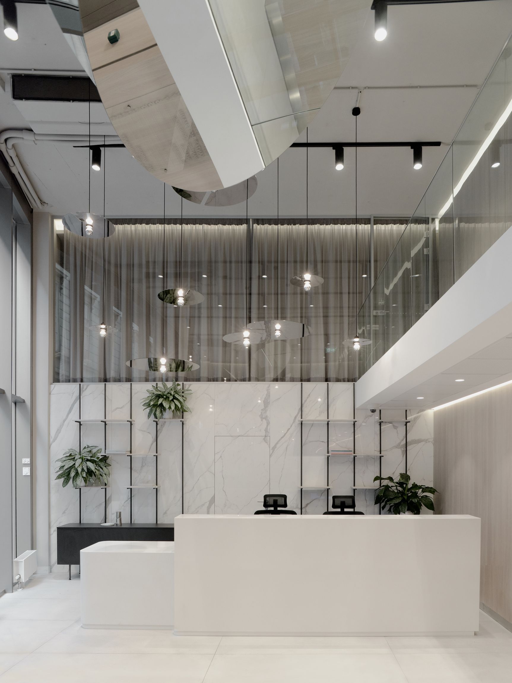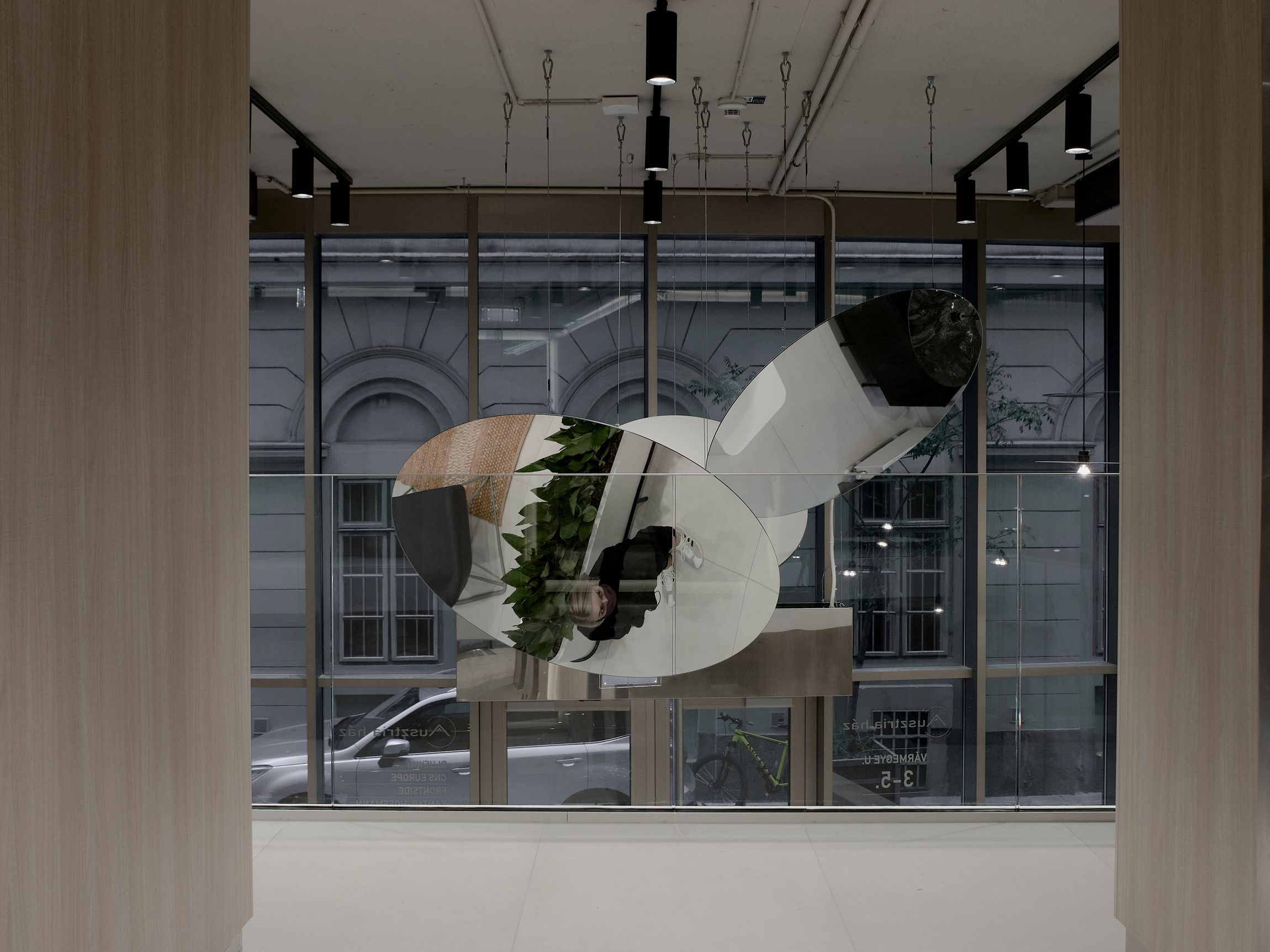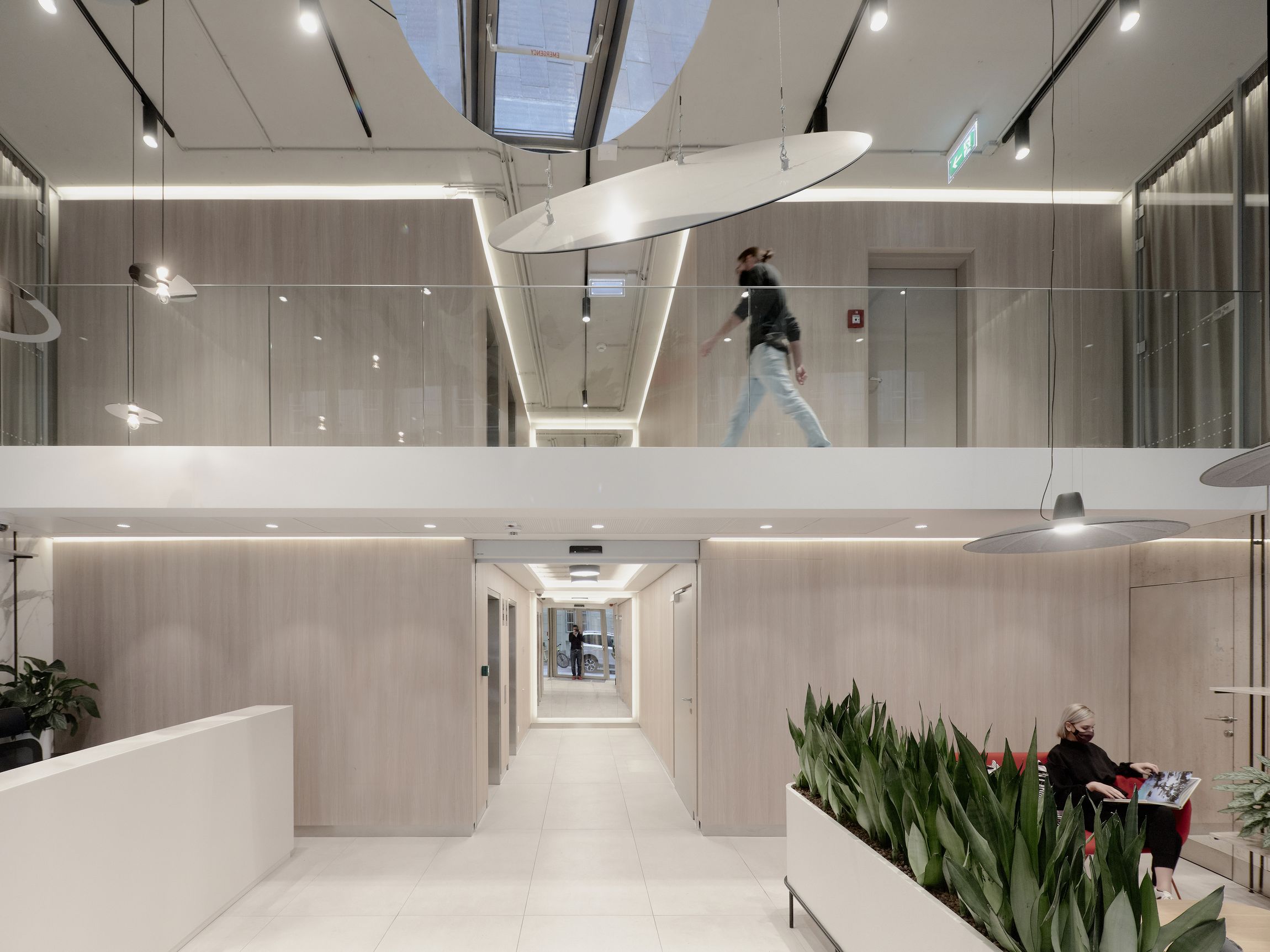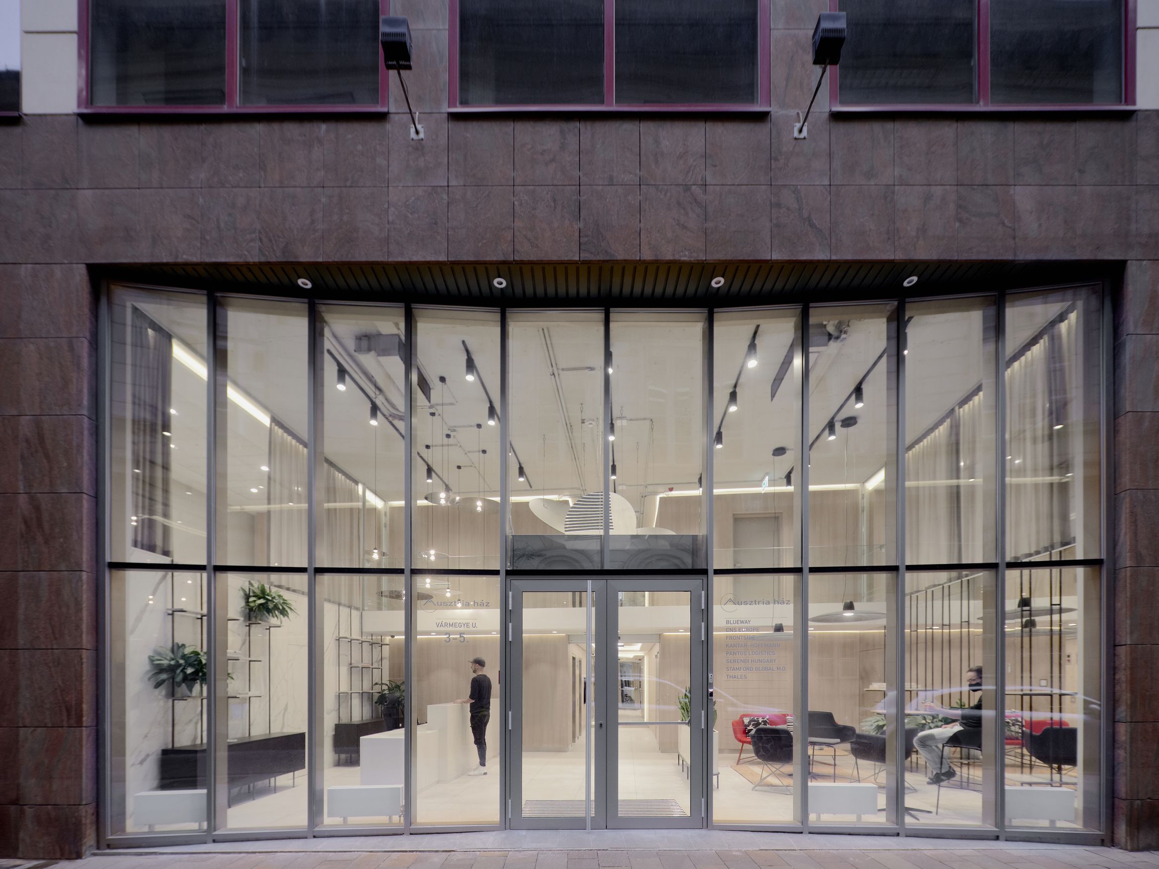 The main expectation was to create an open space, visible from the street. We freed up the room with transparency where possible, removed the shading from the facade and the suspended ceiling to gain a feeling of more space. We also used mirrors and reflective surfaces to virtually enlarge the place. We added a mini bar to the reception to serve the colleagues in the buildings, and provided more seats for meetings or informal gatherings. We adjusted different light solutions for the different times of the day. We also built in sound-proof and acoustically absorbent elements to soften echoing.