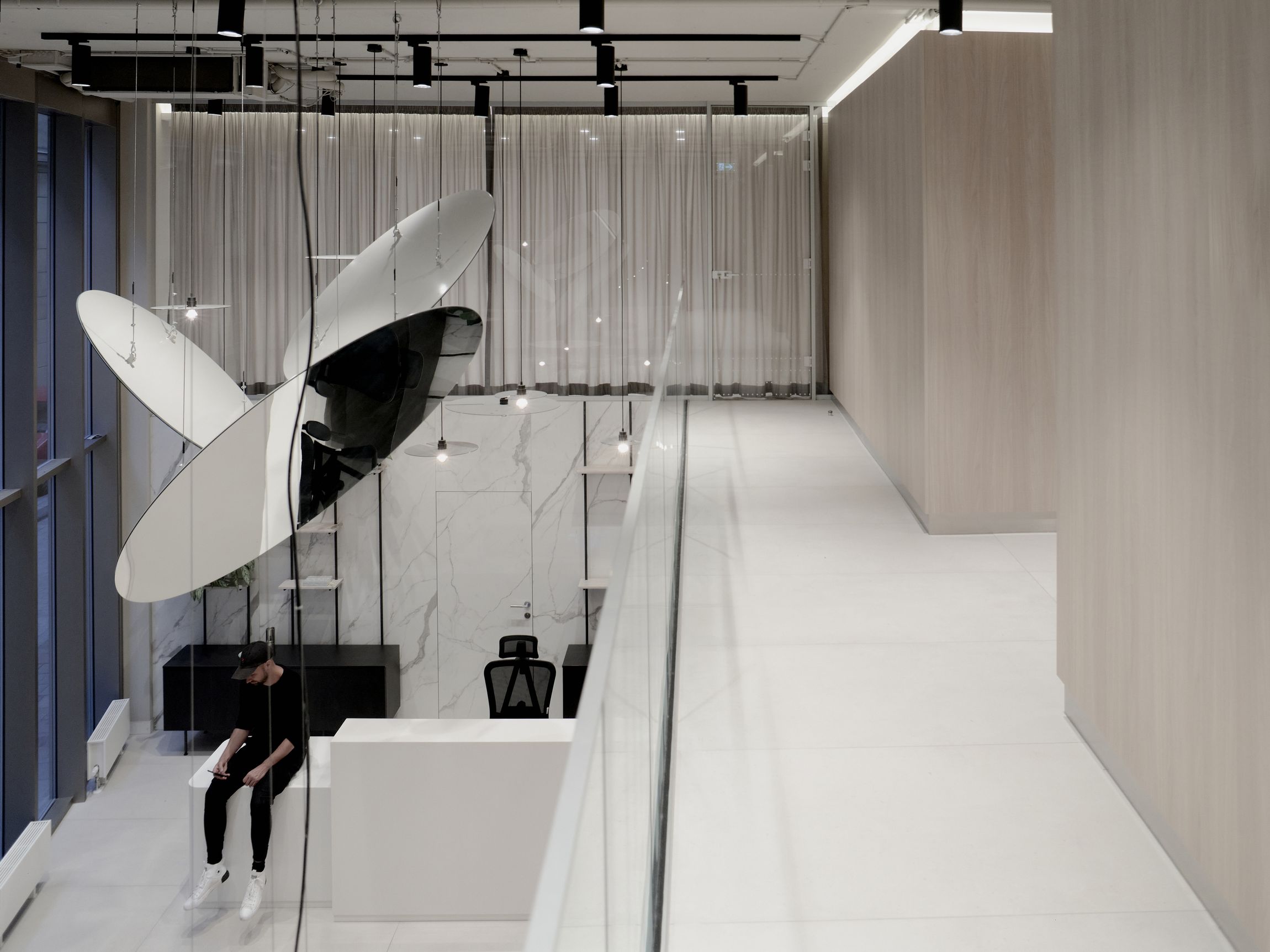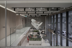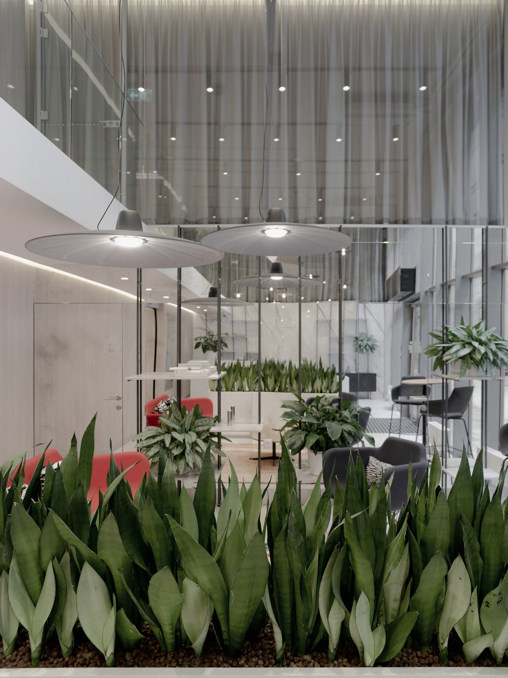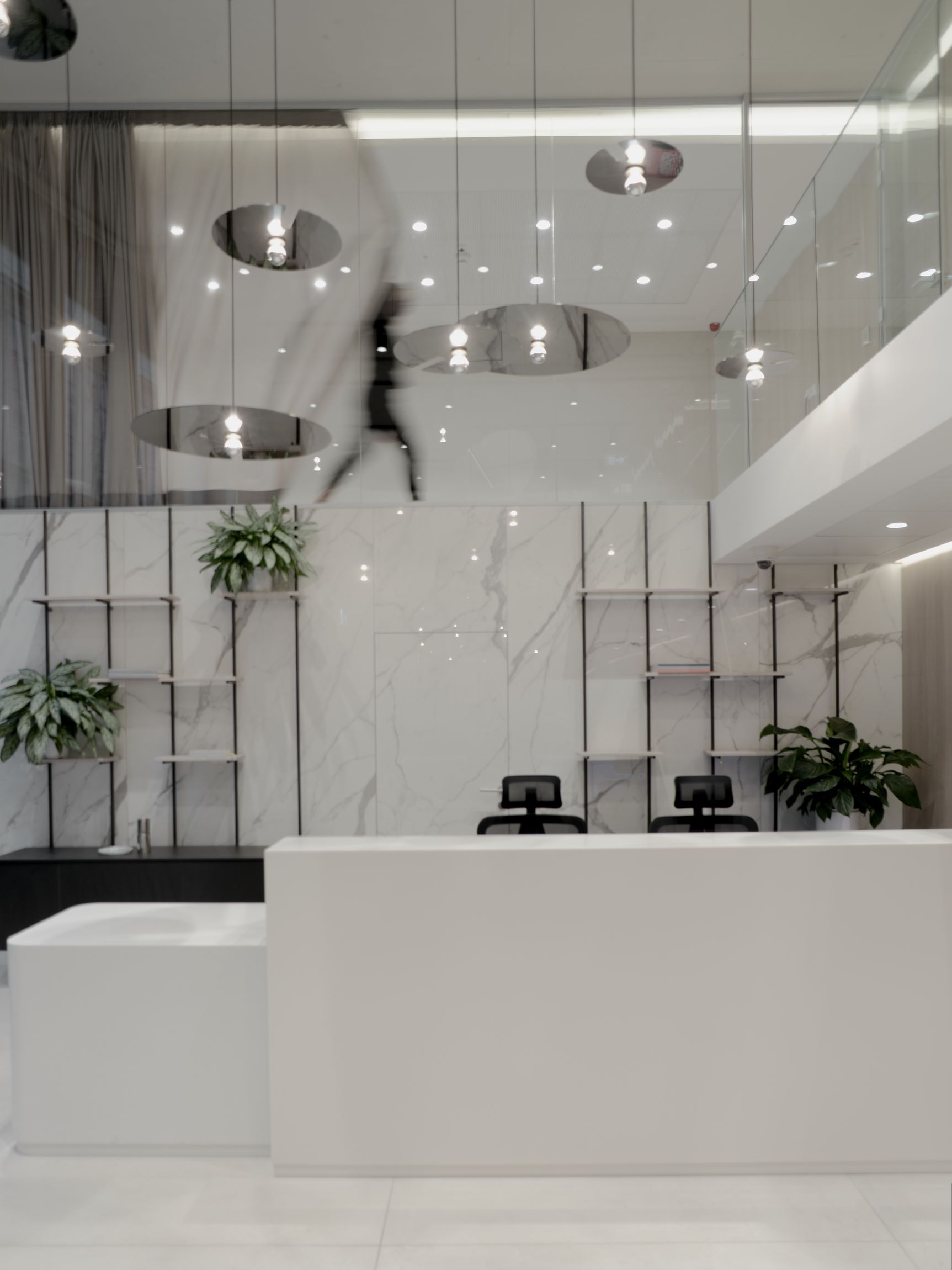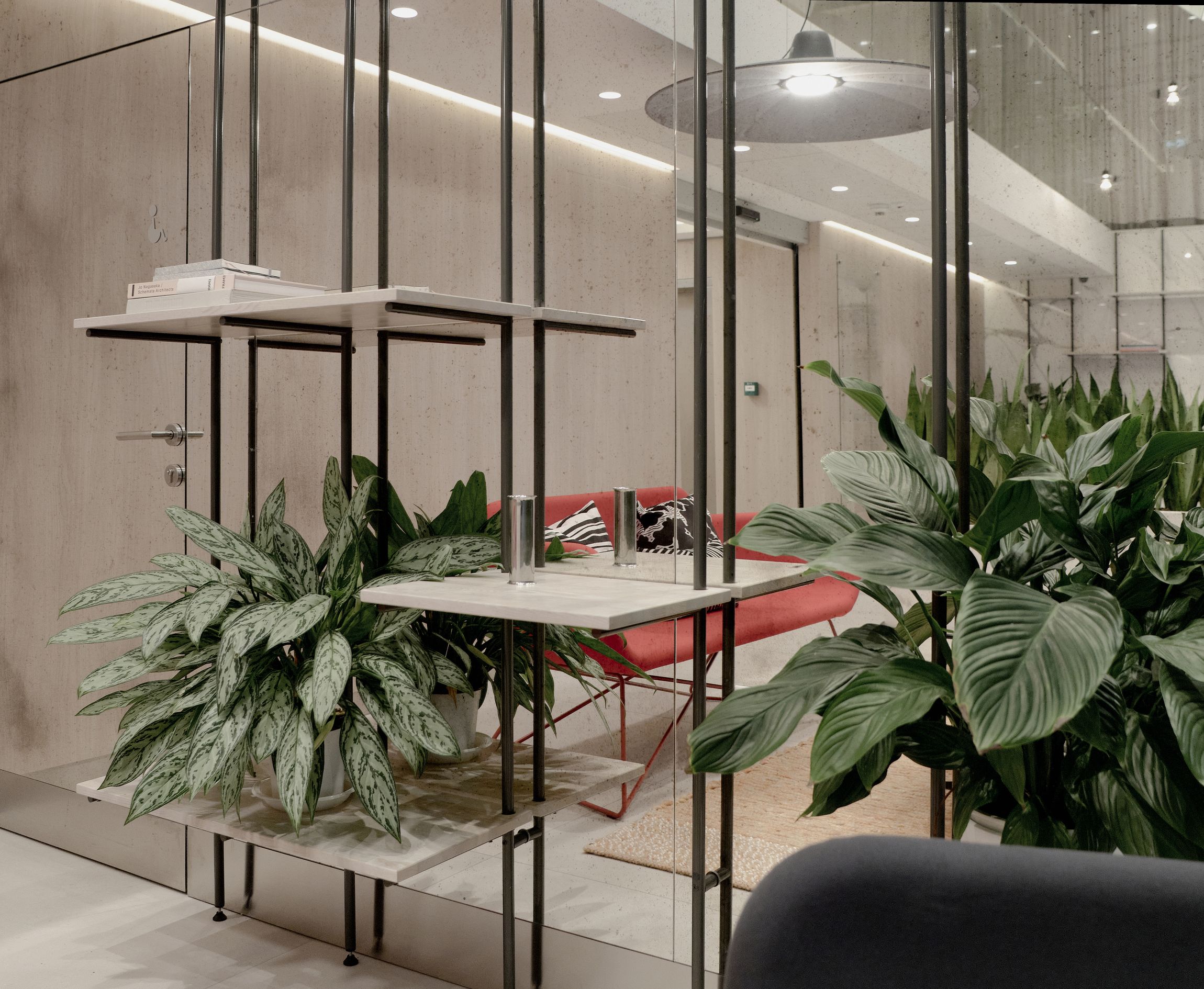 The main expectation was to create an open space, visible from the street. We freed up the room with transparency where possible, removed the shading from the facade and the suspended ceiling to gain a feeling of more space. We also used mirrors and reflective surfaces to virtually enlarge the place. We added a mini bar to the reception to serve the colleagues in the buildings, and provided more seats for meetings or informal gatherings. We adjusted different light solutions for the different times of the day. We also built in sound-proof and acoustically absorbent elements to soften echoing.