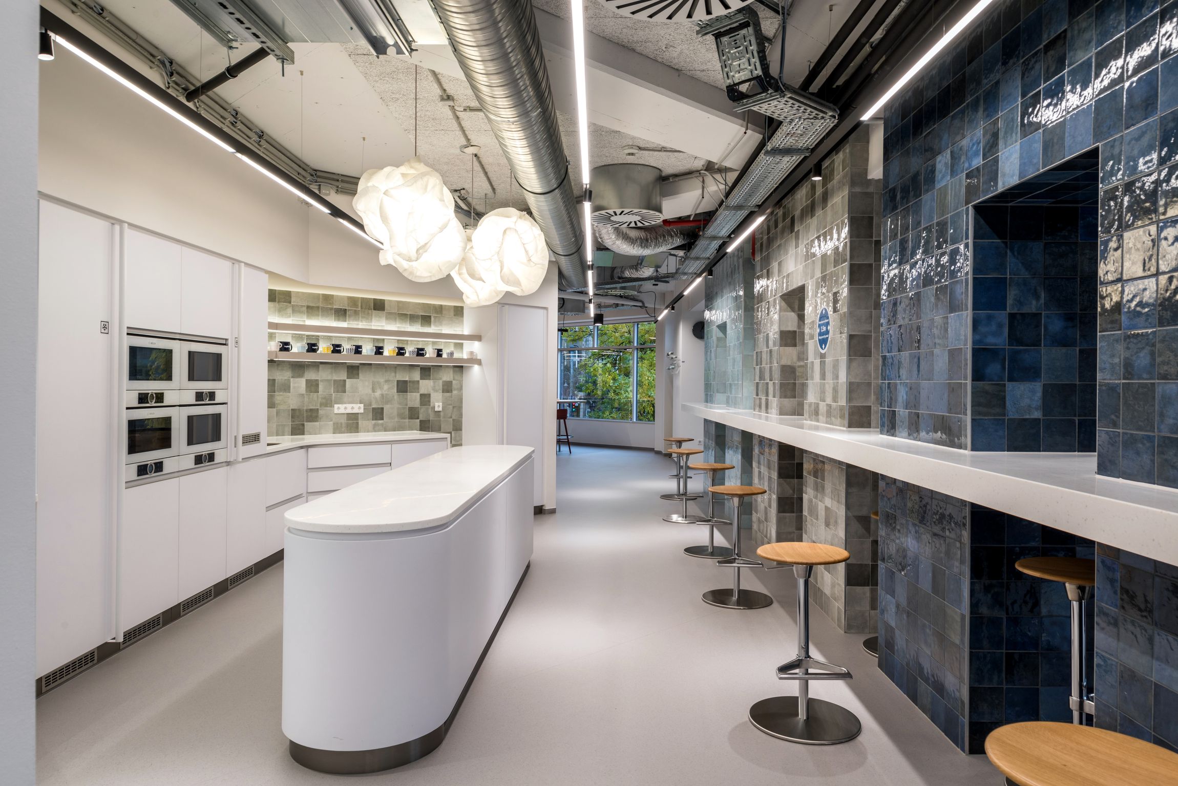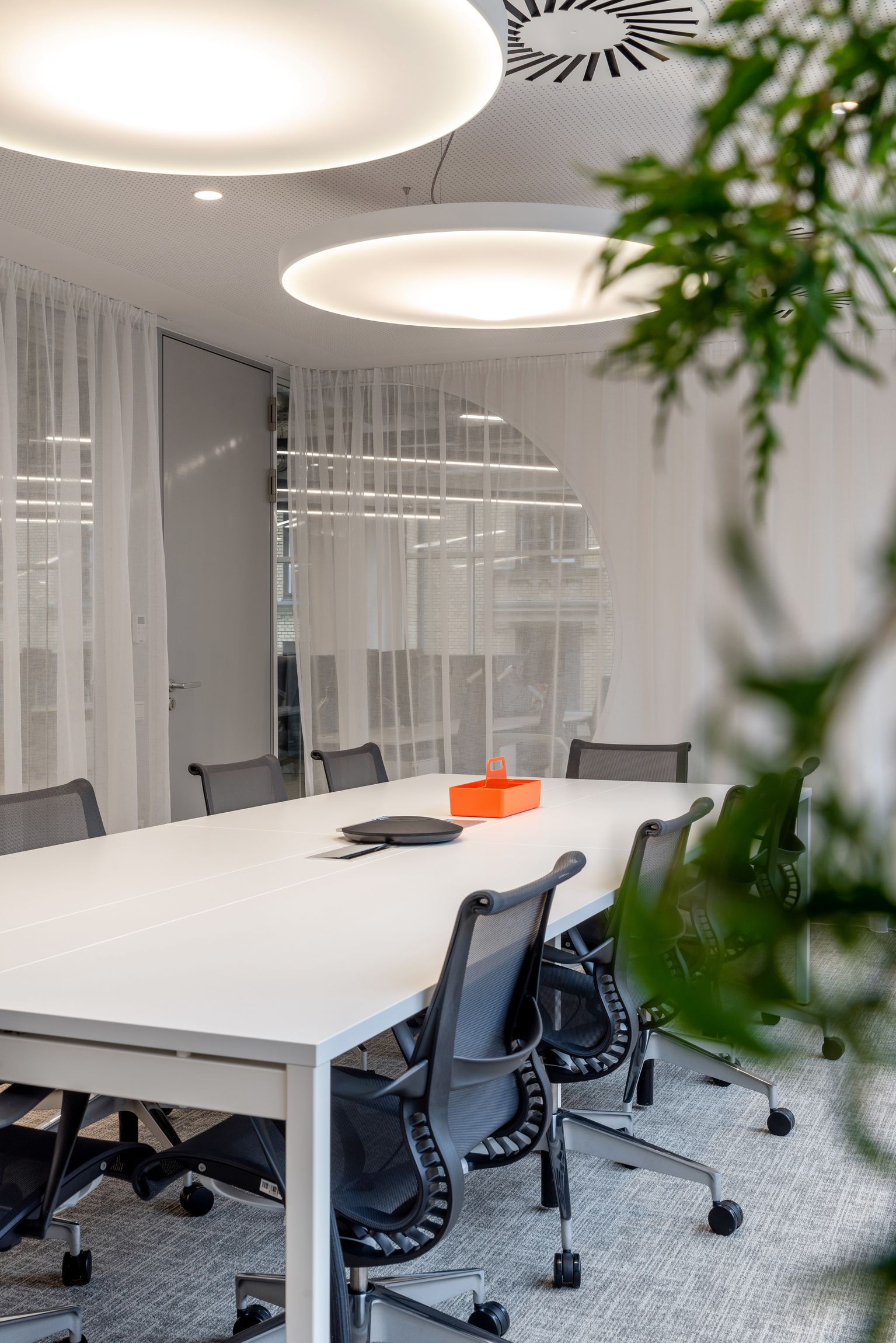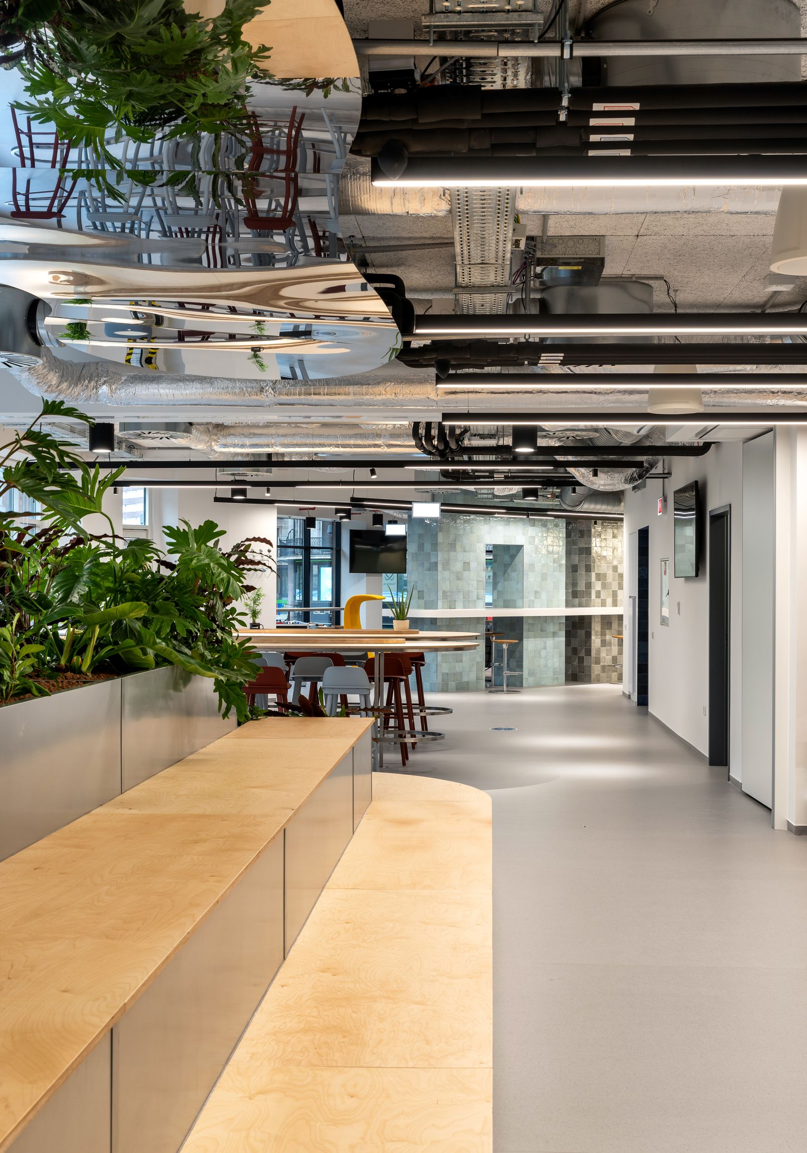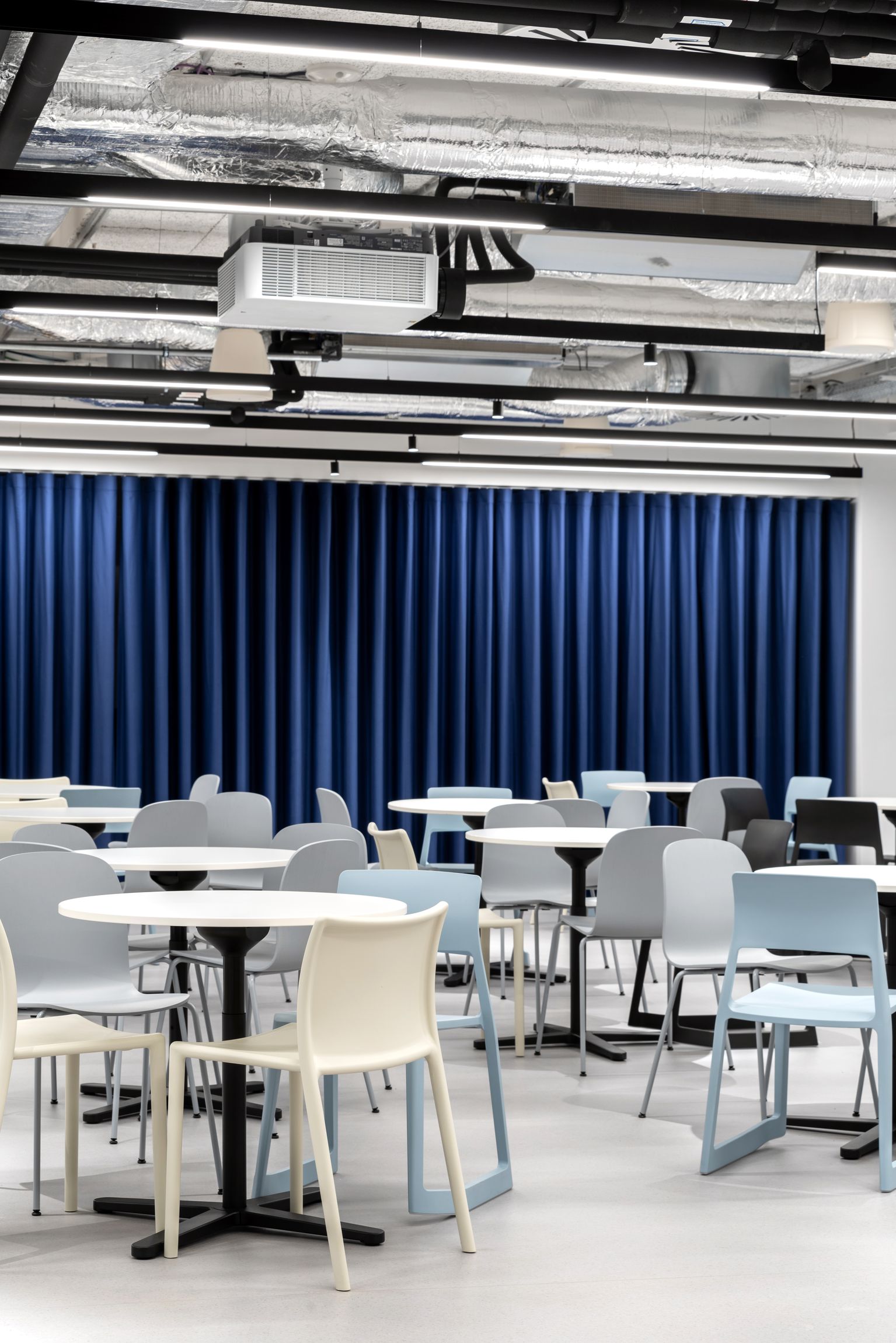 We designed an efficient open space layout, where the community areas are well separated, and follow the shape of clouds, over the sea of workstations. The researchers are situated in a relaxed area while the busy spaces look towards the streets. The glazed walls of the free-standing elements in the space (meeting room, phone booth, etc.), the mirrors in the washrooms, the hanging decoration over the community-amphitheatre all follow the metaphor of clouds.