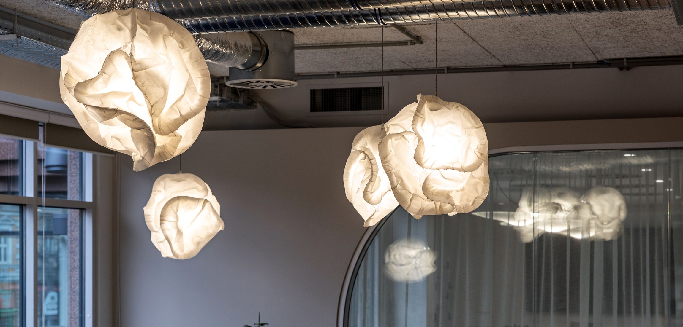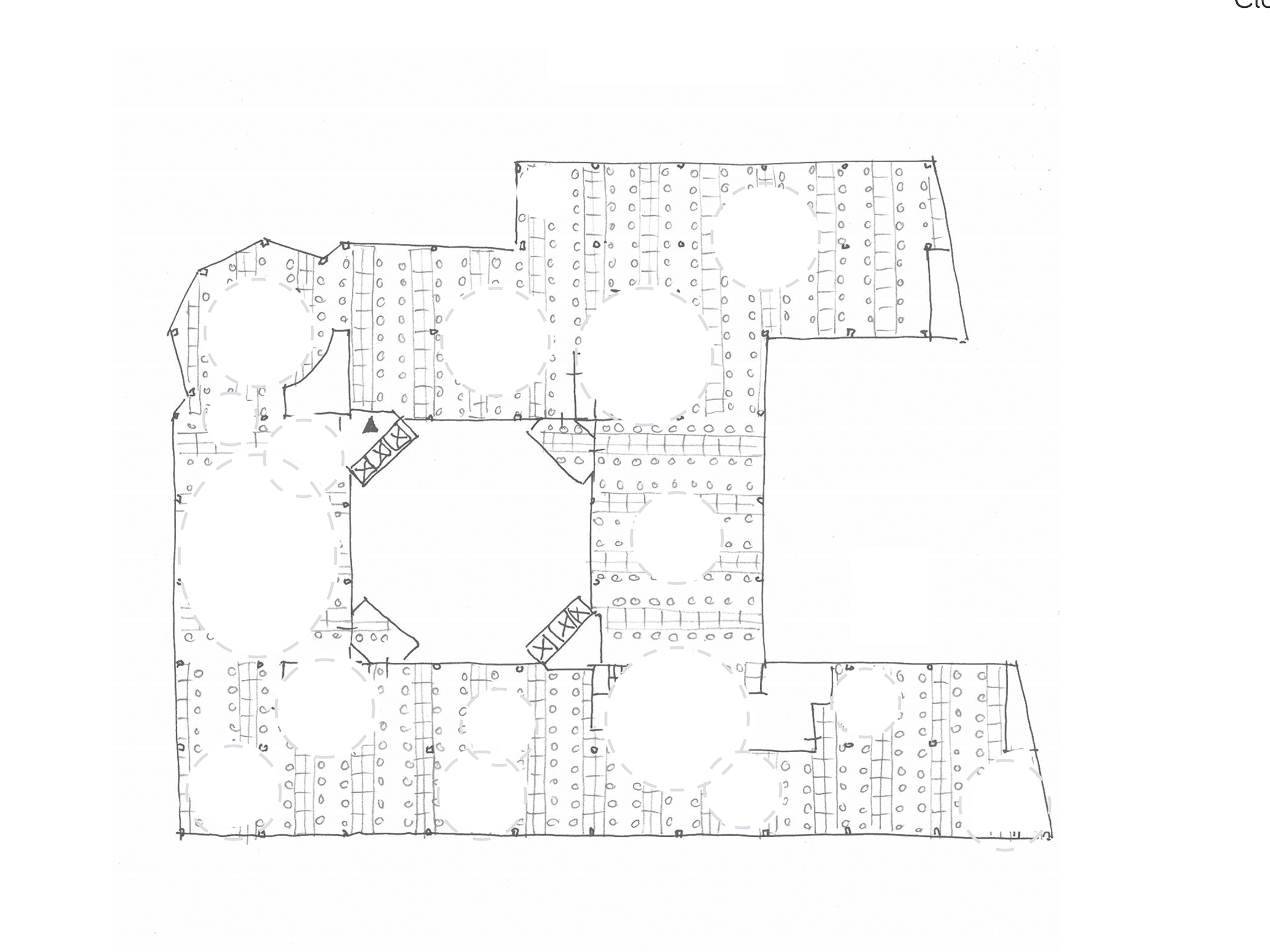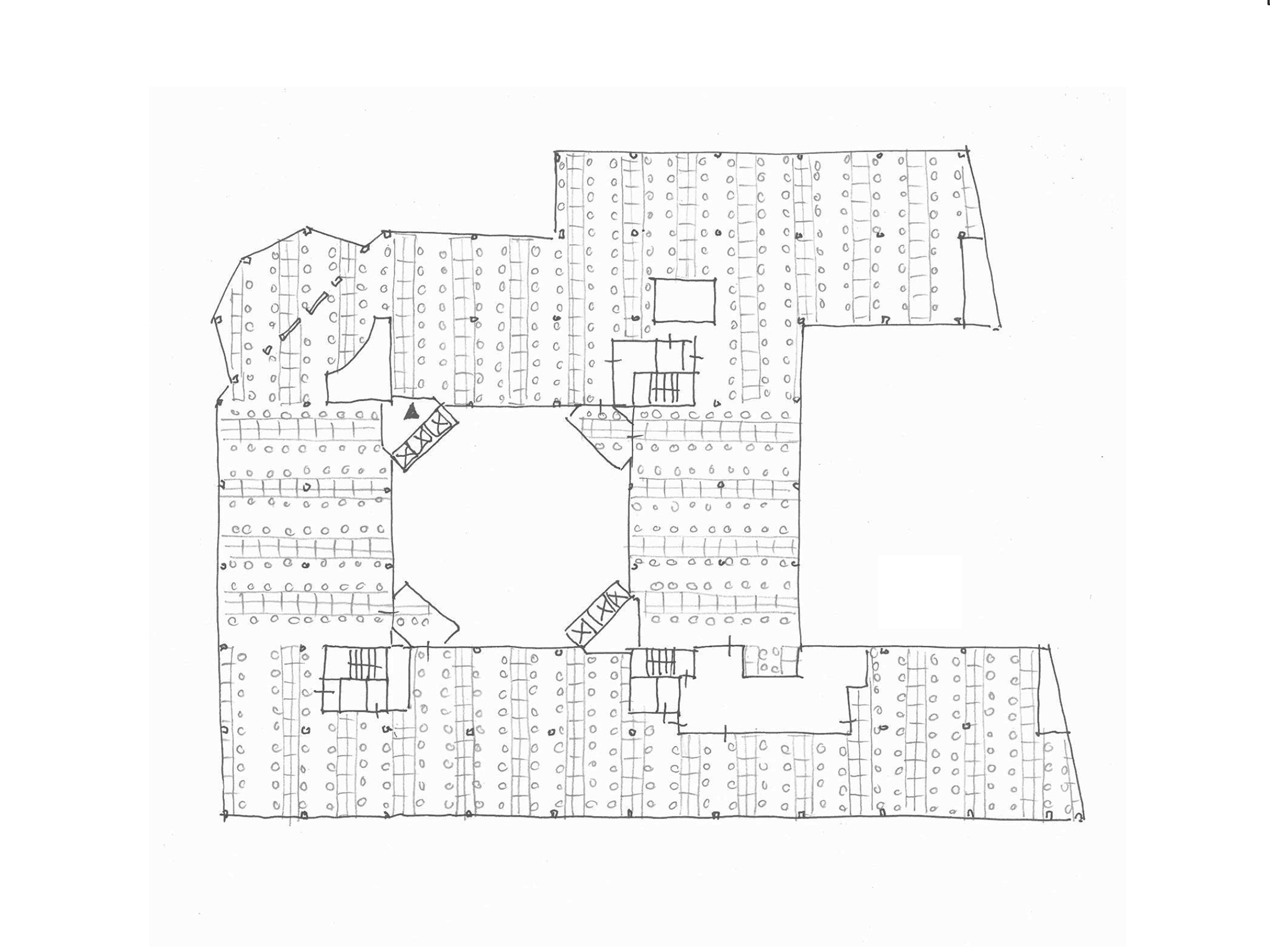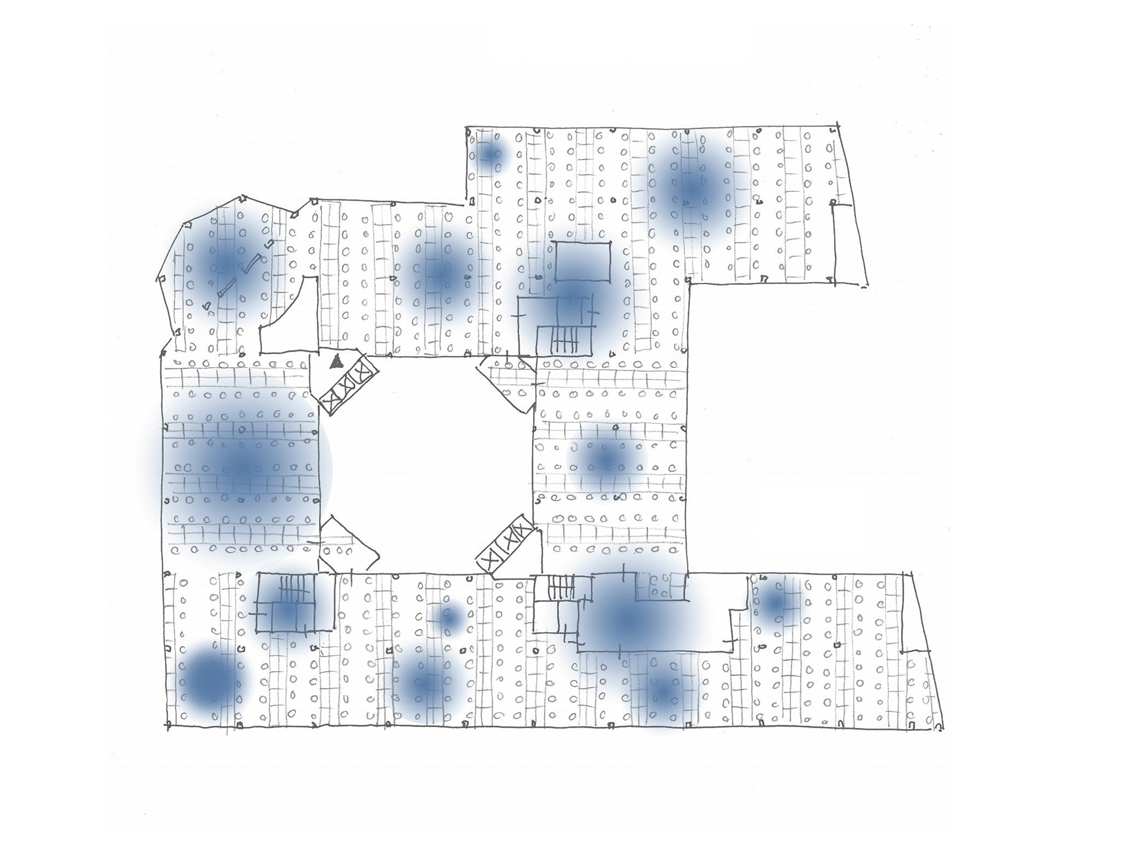 We designed an efficient open space layout, where the community areas are well separated, and follow the shape of clouds, over the sea of workstations. The researchers are situated in a relaxed area while the busy spaces look towards the streets. The glazed walls of the free-standing elements in the space (meeting room, phone booth, etc.), the mirrors in the washrooms, the hanging decoration over the community-amphitheatre all follow the metaphor of clouds.