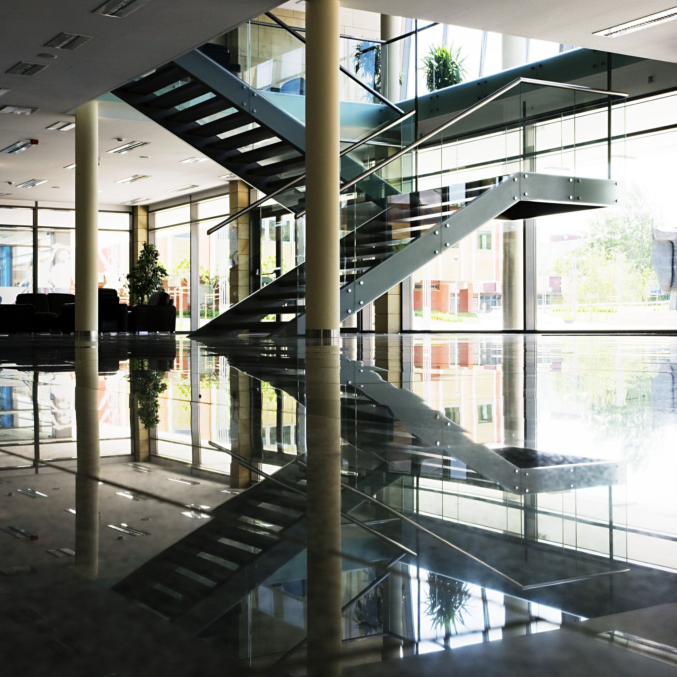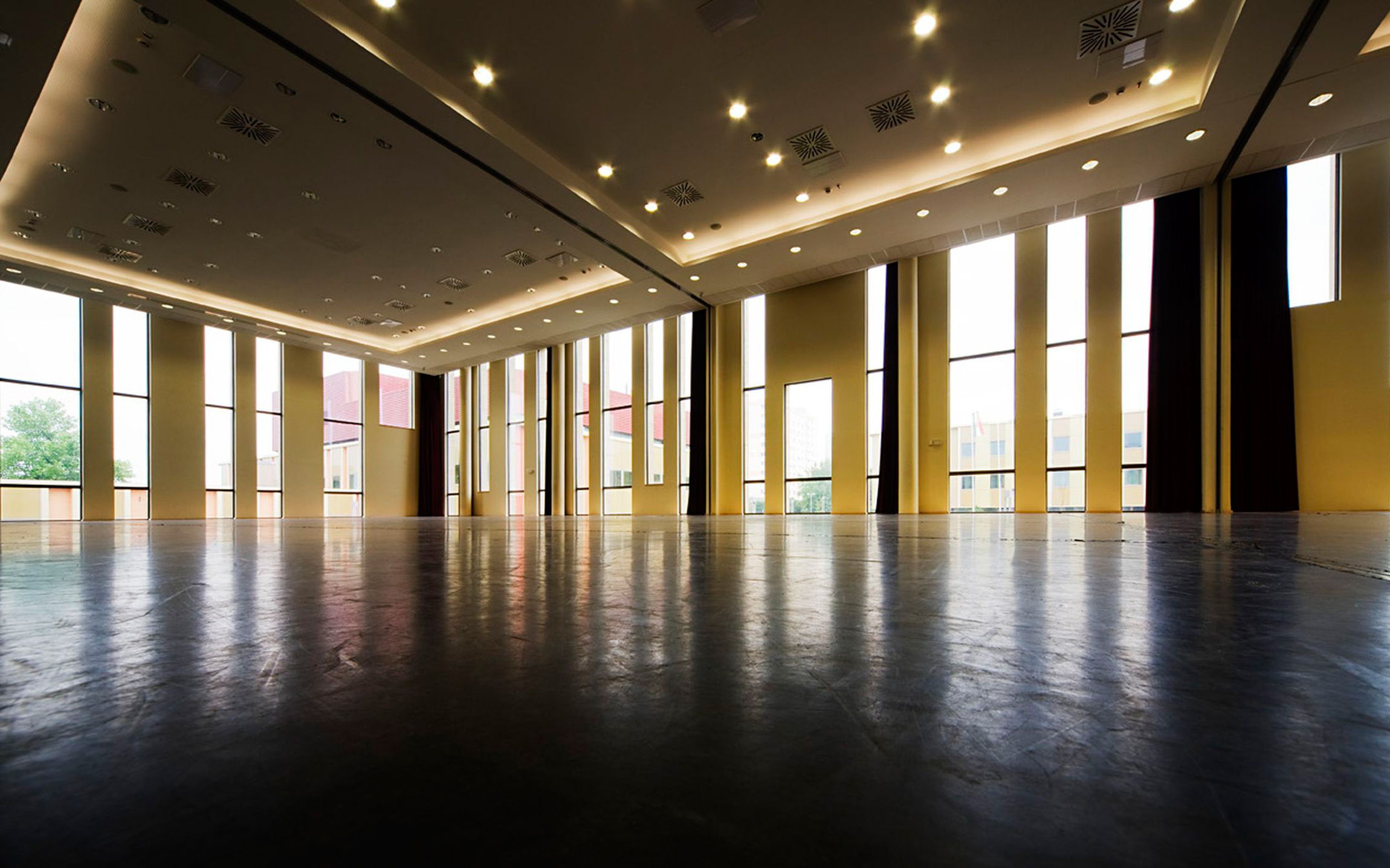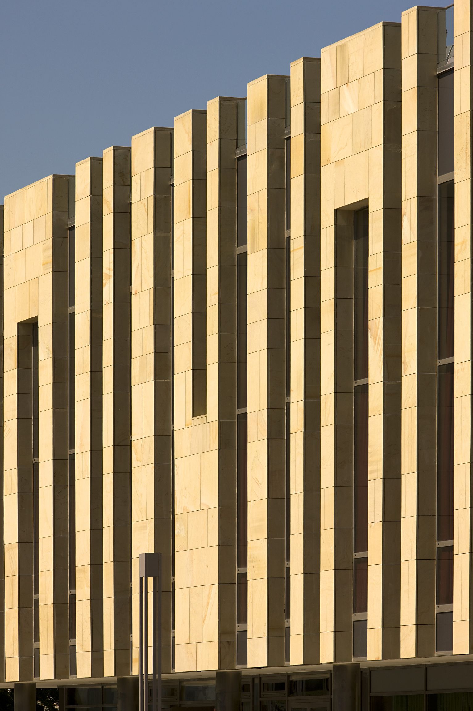 The middle of the building is the main public access, covered with a slightly slanted glass wall that mirrors the square during the day, when the interior is used less. The rest of the facade required fewer openings due to its multi-functionality: it was used as a conference room, a dance hall, and served other functions too. There are bigger random cuts that reflect the different heights of the surrounding panel buildings. The whole main facade is covered with Spanish sandstone with a colour that matches its neighbours. Different tones amplify the collage-like appearance of the surface. To loosen up the big volume, its ground floor makes a step back to create a floating effect. The pavement made of black granite runs under the building.