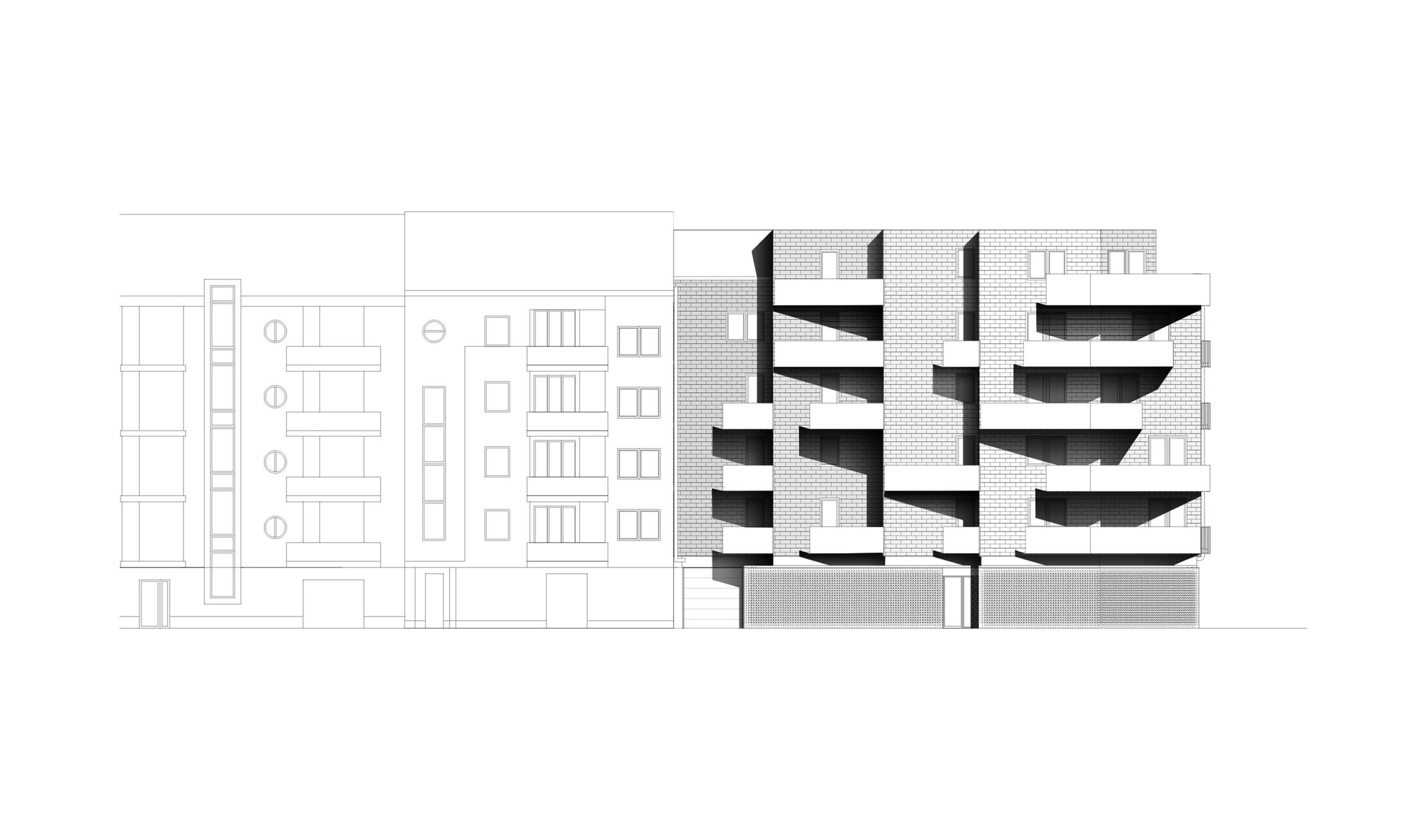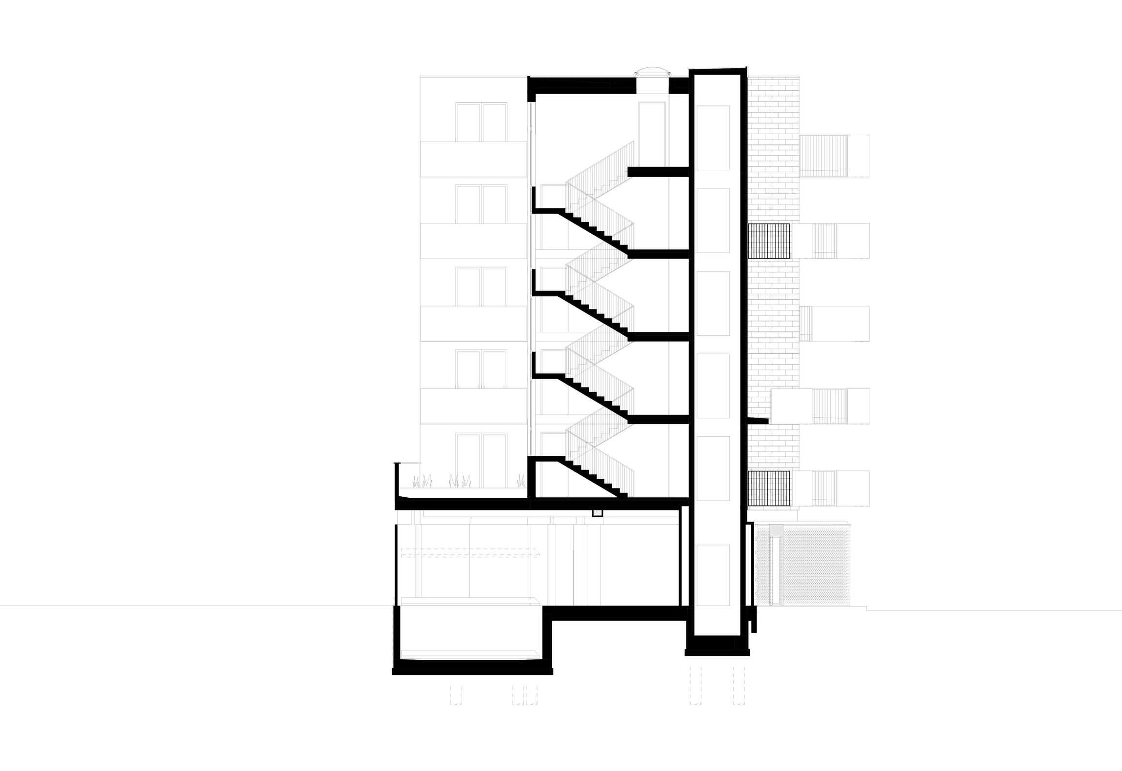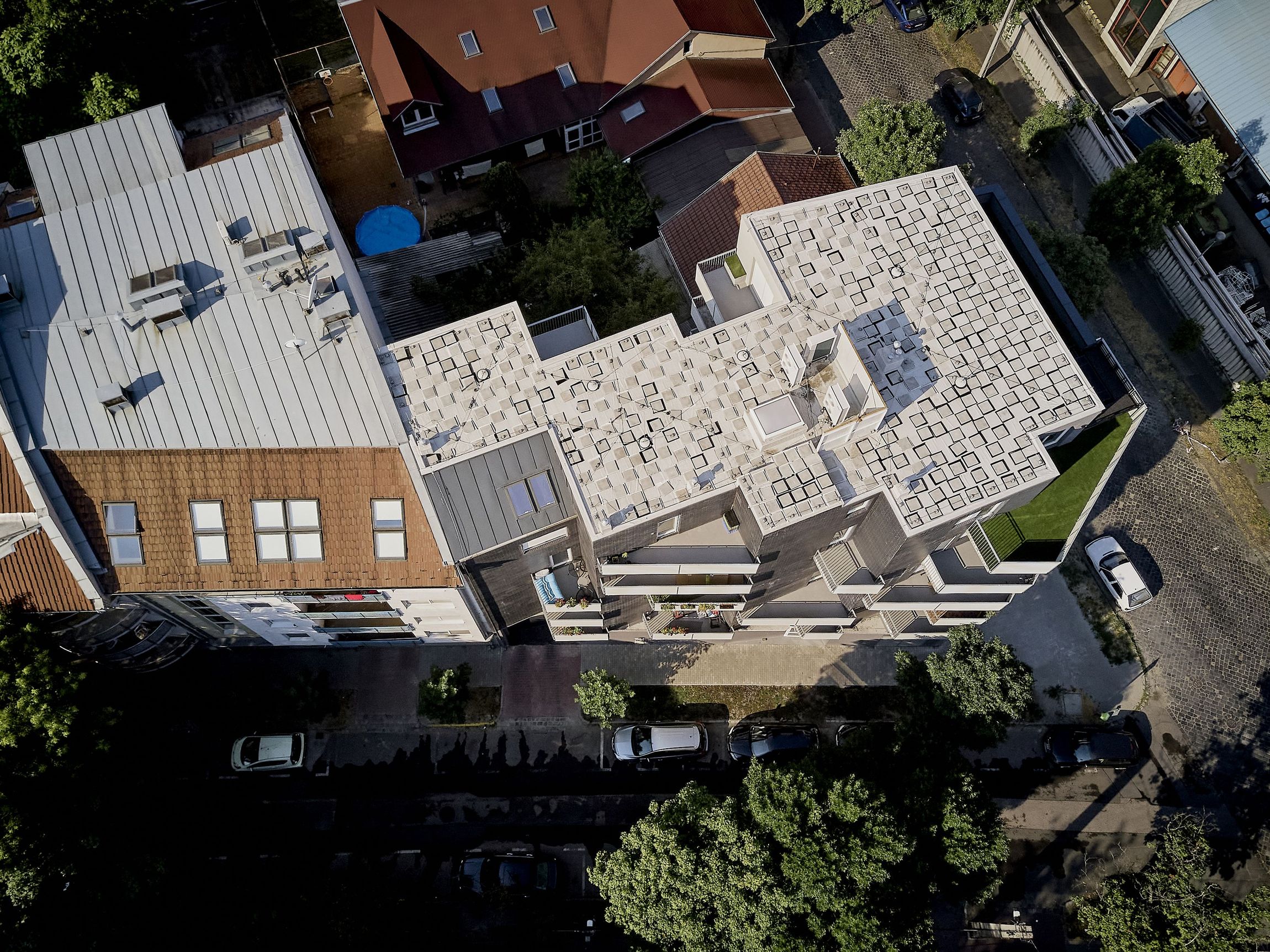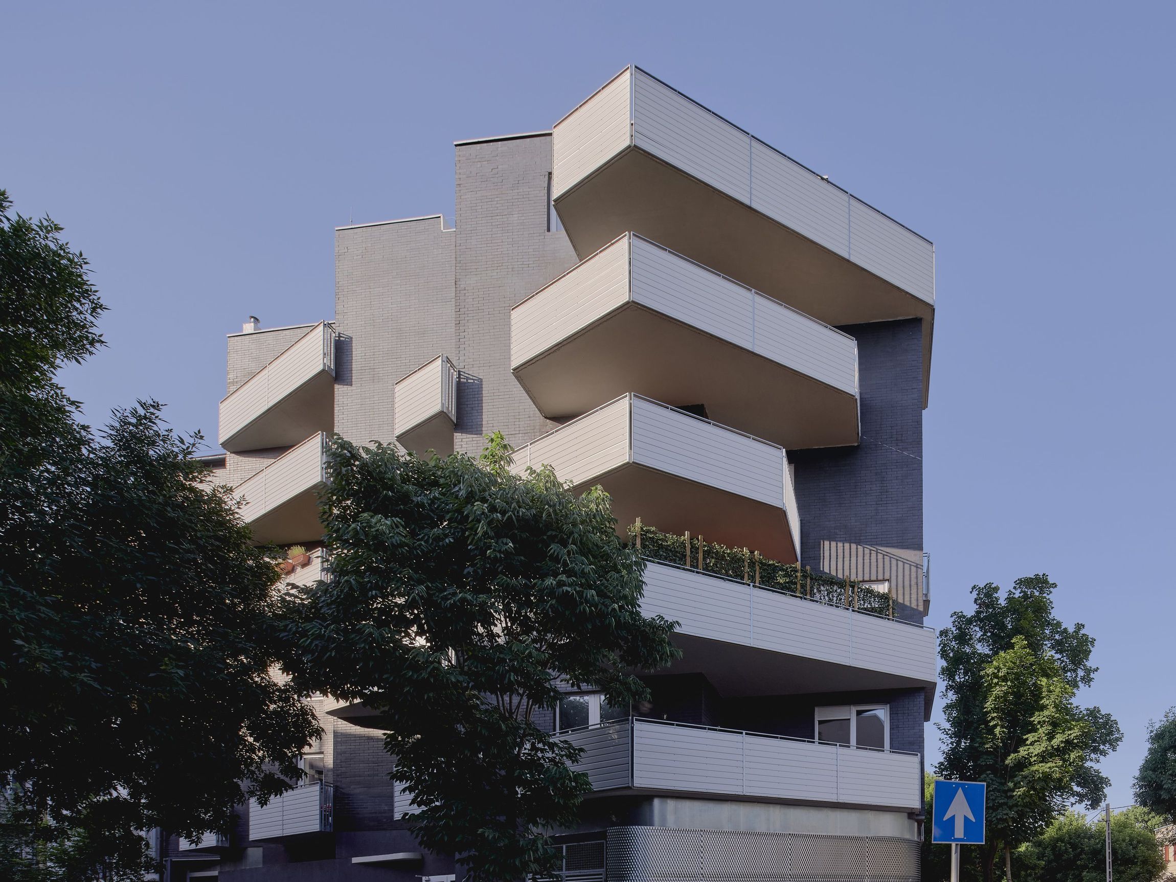 The walls have been given a dark brick cladding, a reference to the industrial past and architecture of the district. The front parapets of the balconies are white-clad, so they are in contrast with their background. The irregular length and location of the terraces create a playful image, and the shorter façade at the corner gains a unique character. Each balcony has its own identity, on the one hand as they are being used differently by the residents, and on the other hand by their geometrical distinctions.