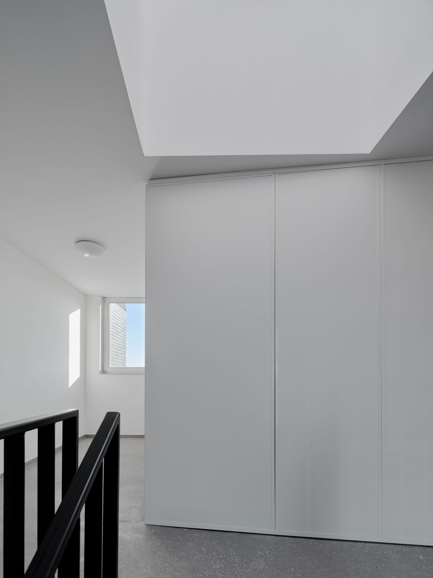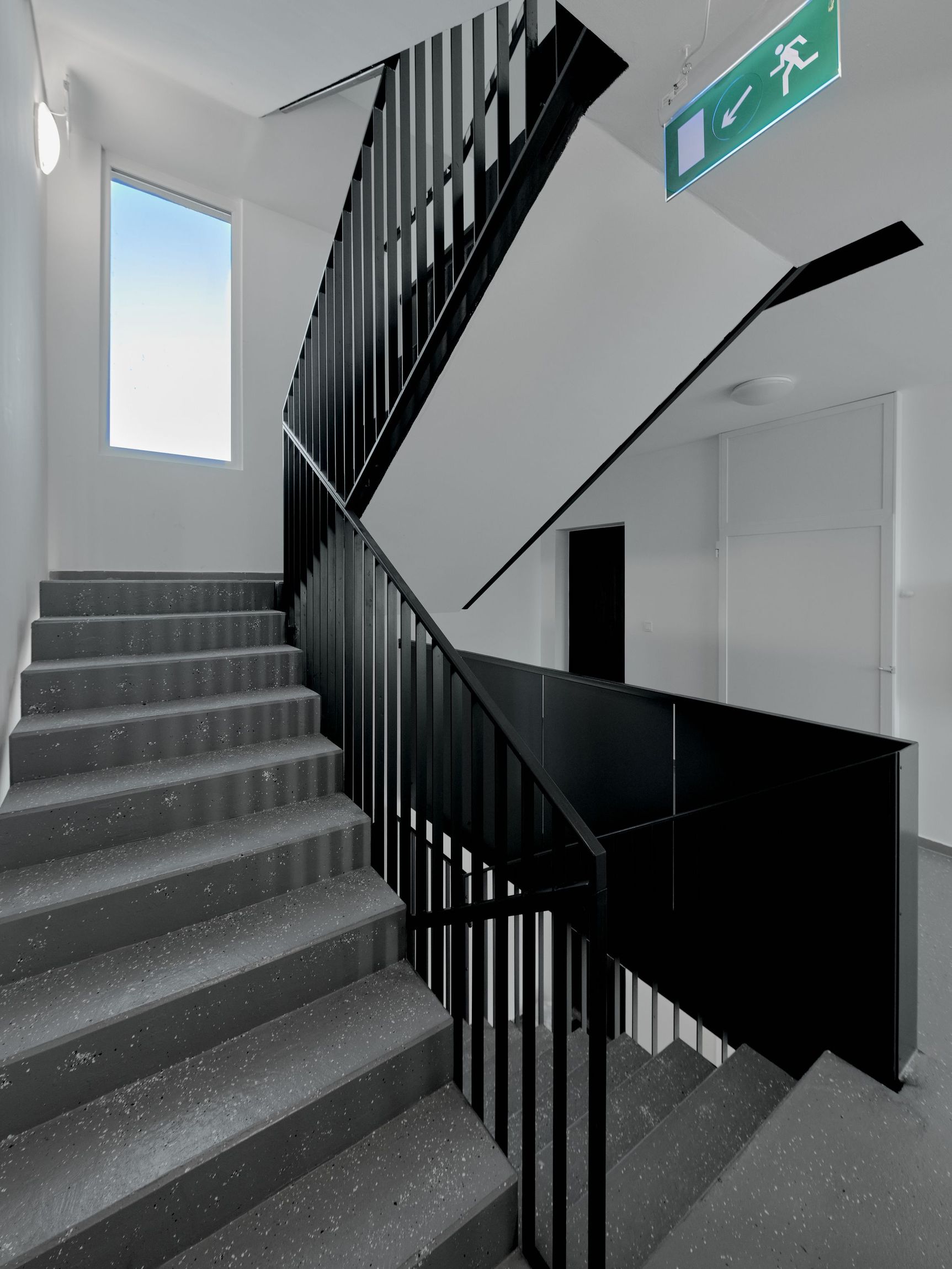 In the interior we developed a minimalist design. Beside the black railing bars and grey granular resin floor, all surfaces are white. We have provided the corridors with large glass surfaces looking both the courtyard and the road, so it fills up the space with natural light and provides vistas to the garden and to the street during the day.