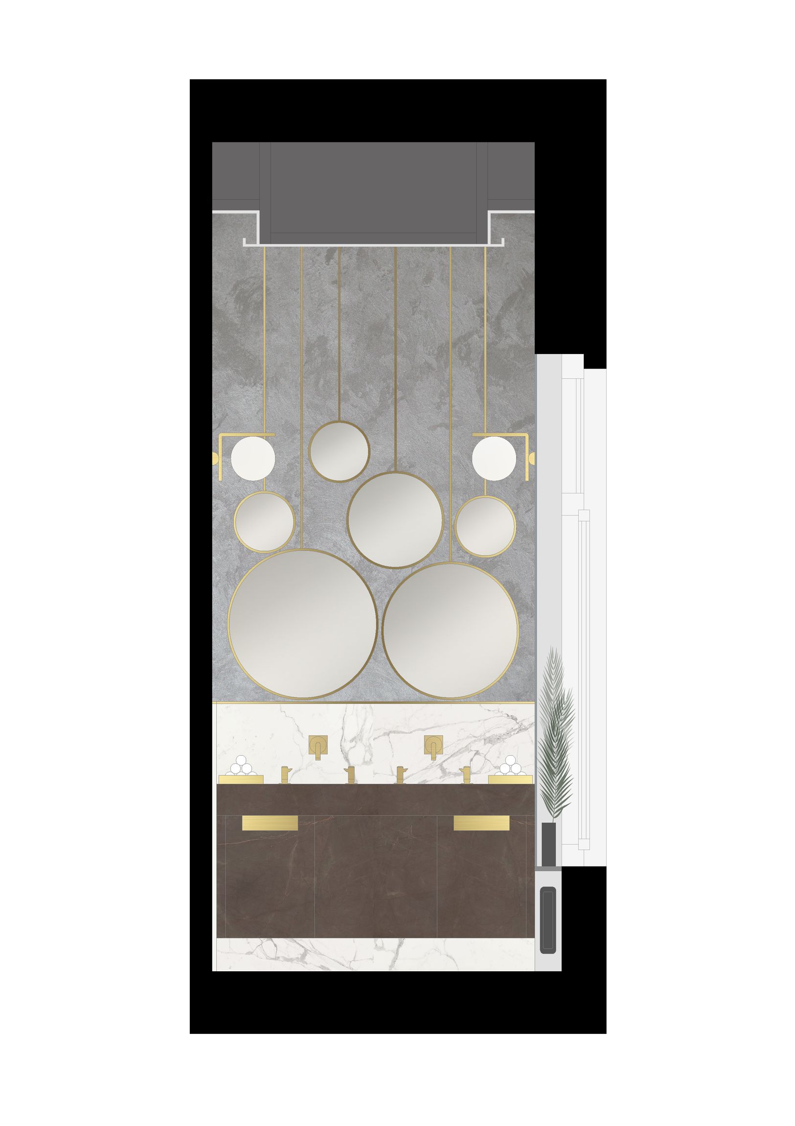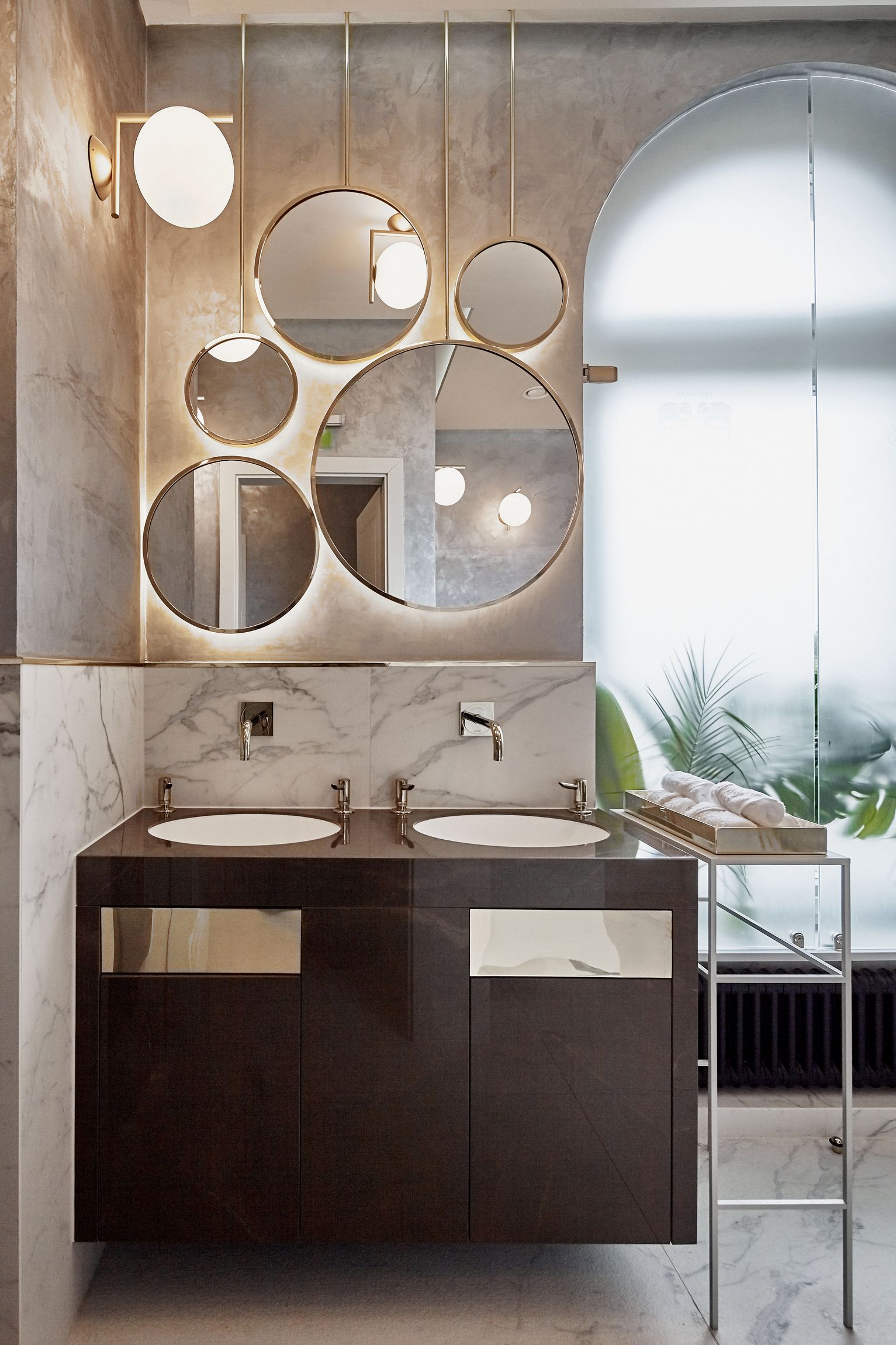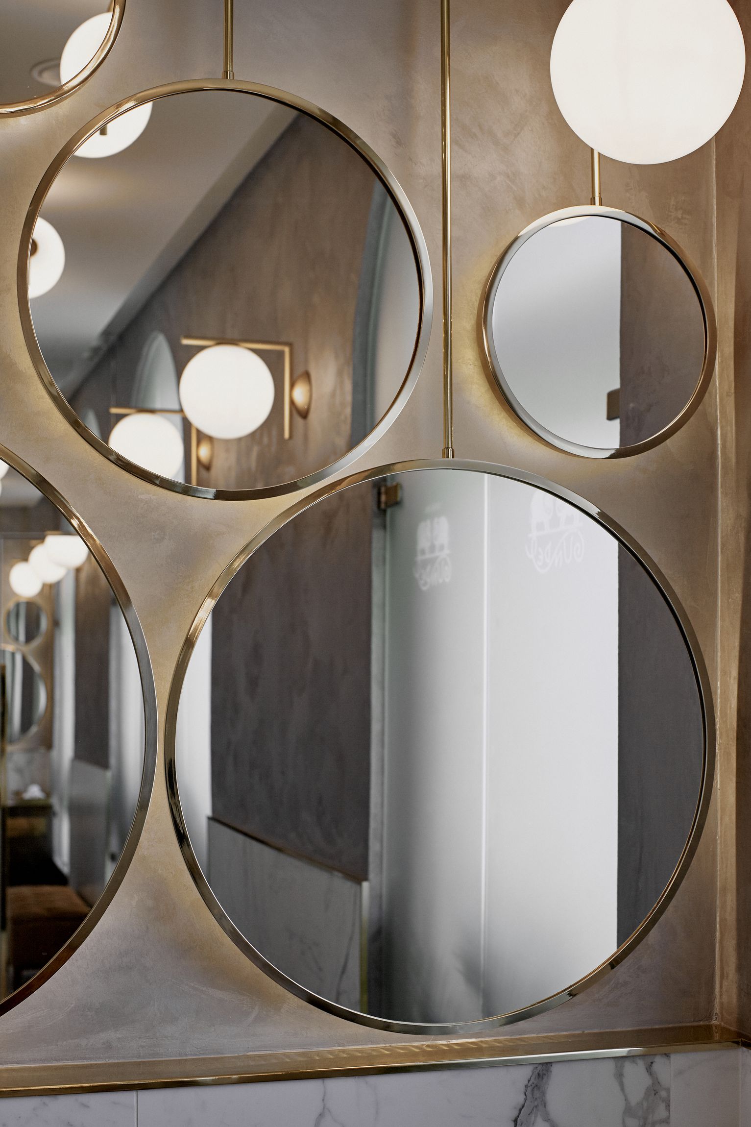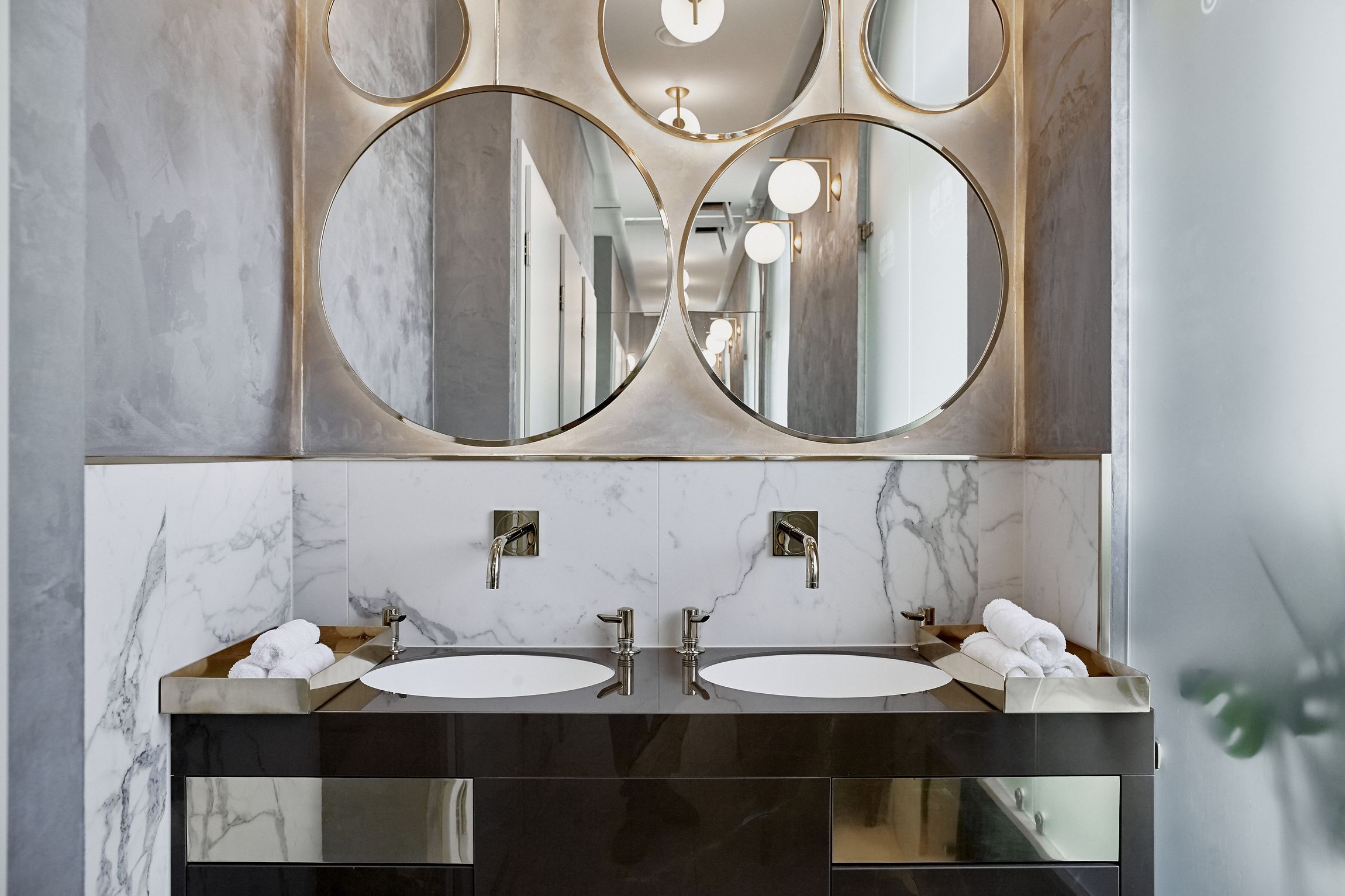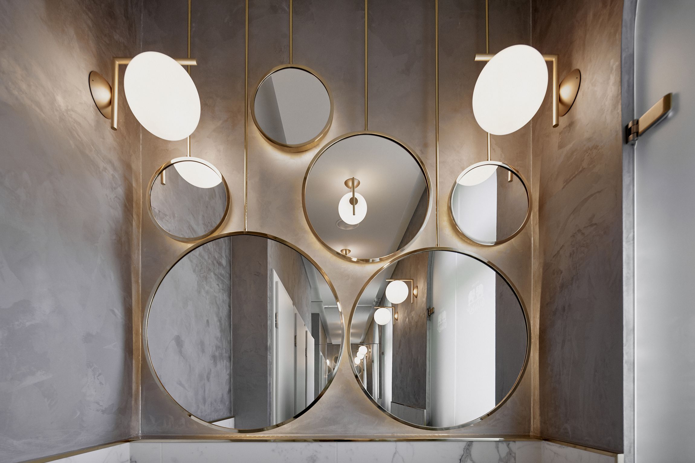A mosdótál feletti tükrök megformálásához egy metaforát használtunk fel. A feltörő friss forrás buborékos vizének hatása cseng vissza a változatás méretű és véletlenszerűen elhelyezett, kör alakú tükrök elrendezésében. A két mosdóblokk közös előtere a legkisebb tér, itt egy virtuális végtelen folyosót alakítottunk ki a két végfal teljes tükörrel való beborítása során.