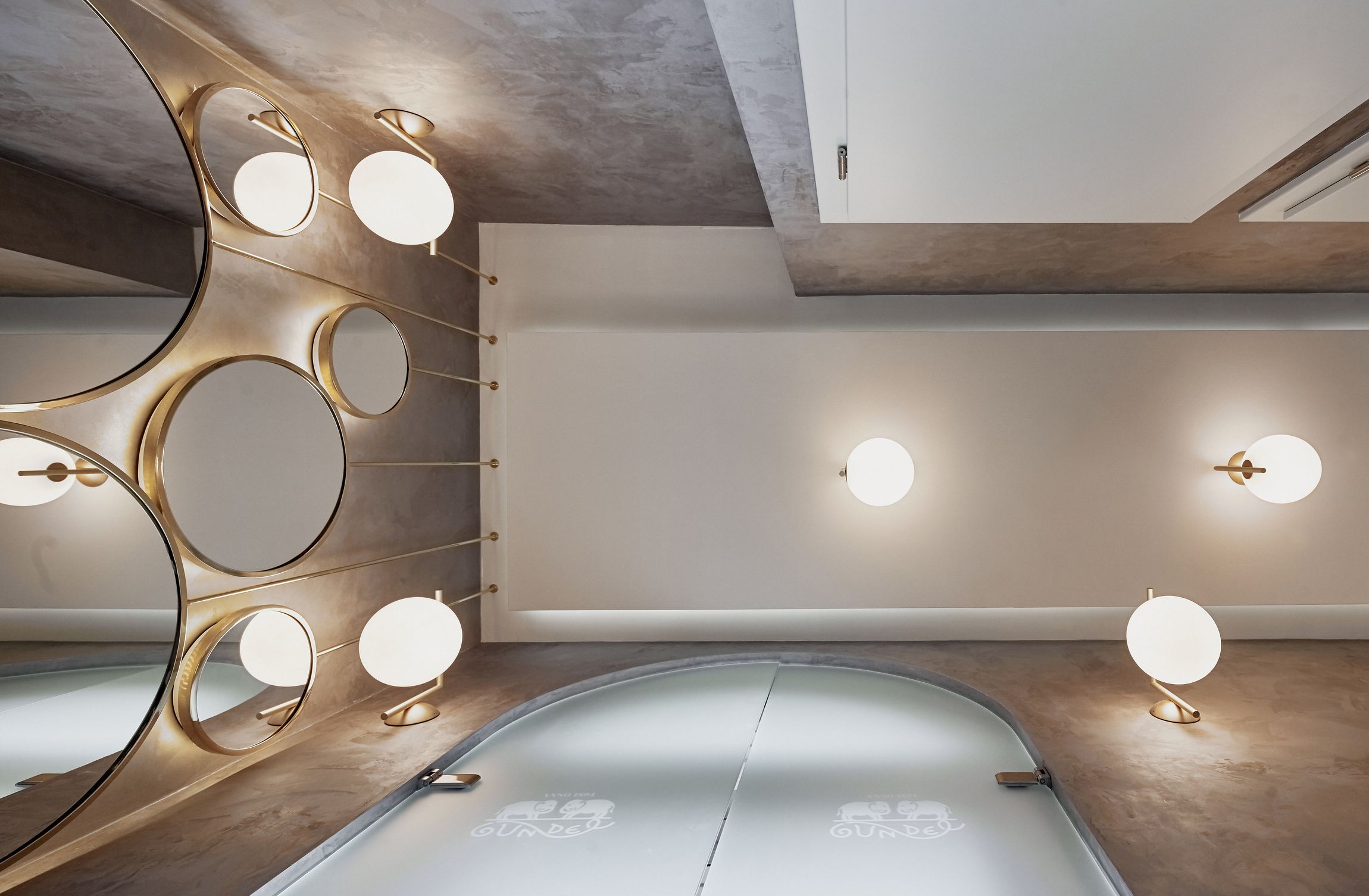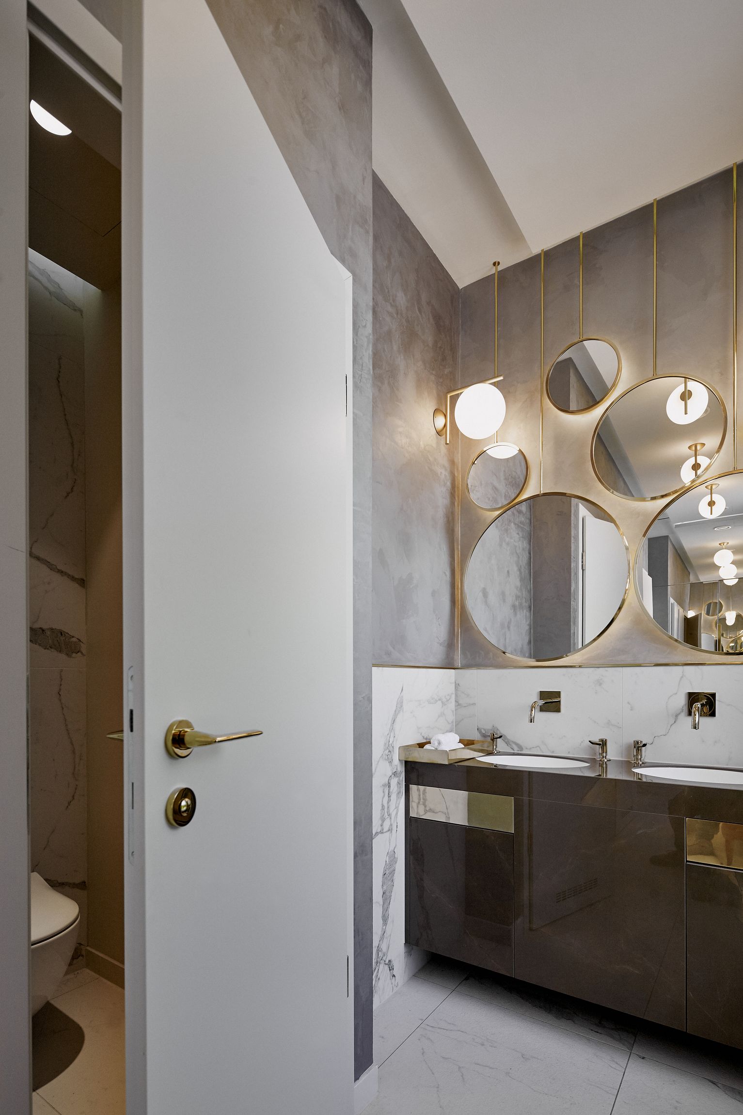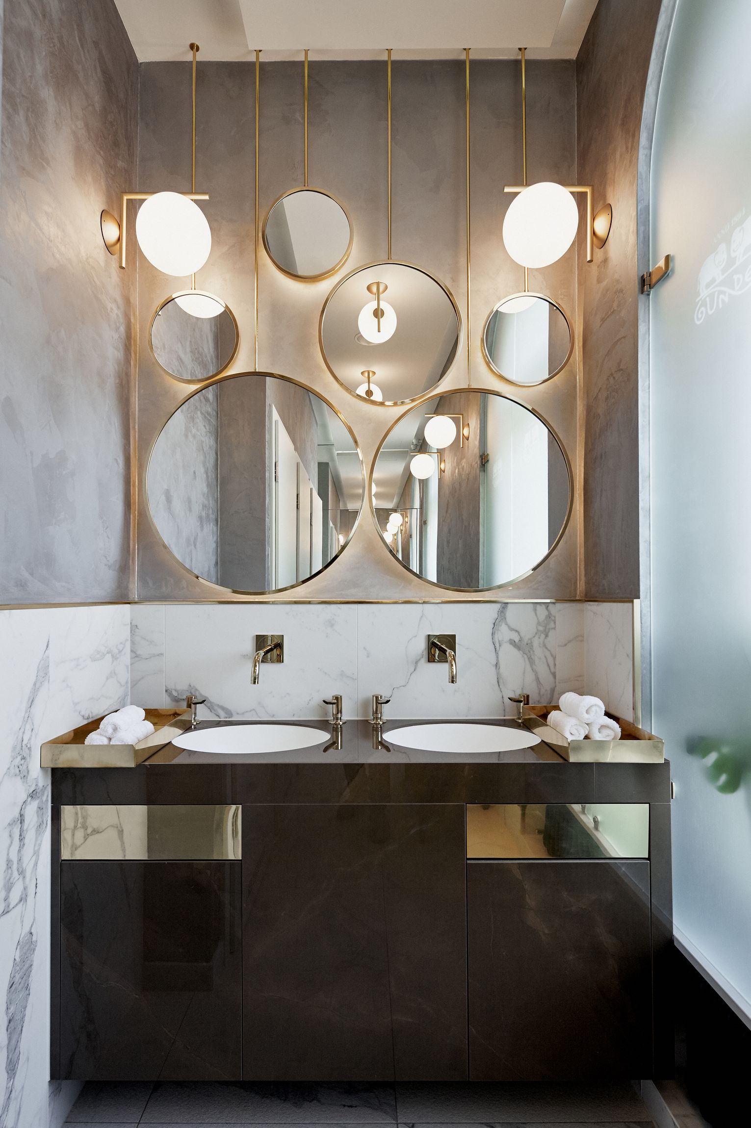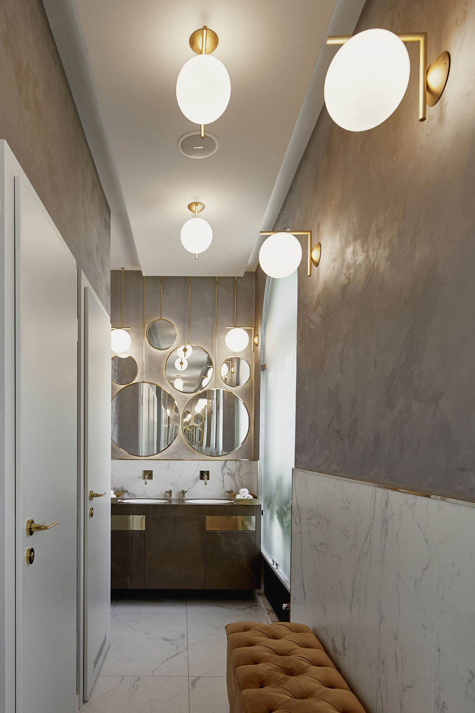 A mosdótál feletti tükrök megformálásához egy metaforát használtunk fel. A feltörő friss forrás buborékos vizének hatása cseng vissza a változatás méretű és véletlenszerűen elhelyezett, kör alakú tükrök elrendezésében. A két mosdóblokk közös előtere a legkisebb tér, itt egy virtuális végtelen folyosót alakítottunk ki a két végfal teljes tükörrel való beborítása során.