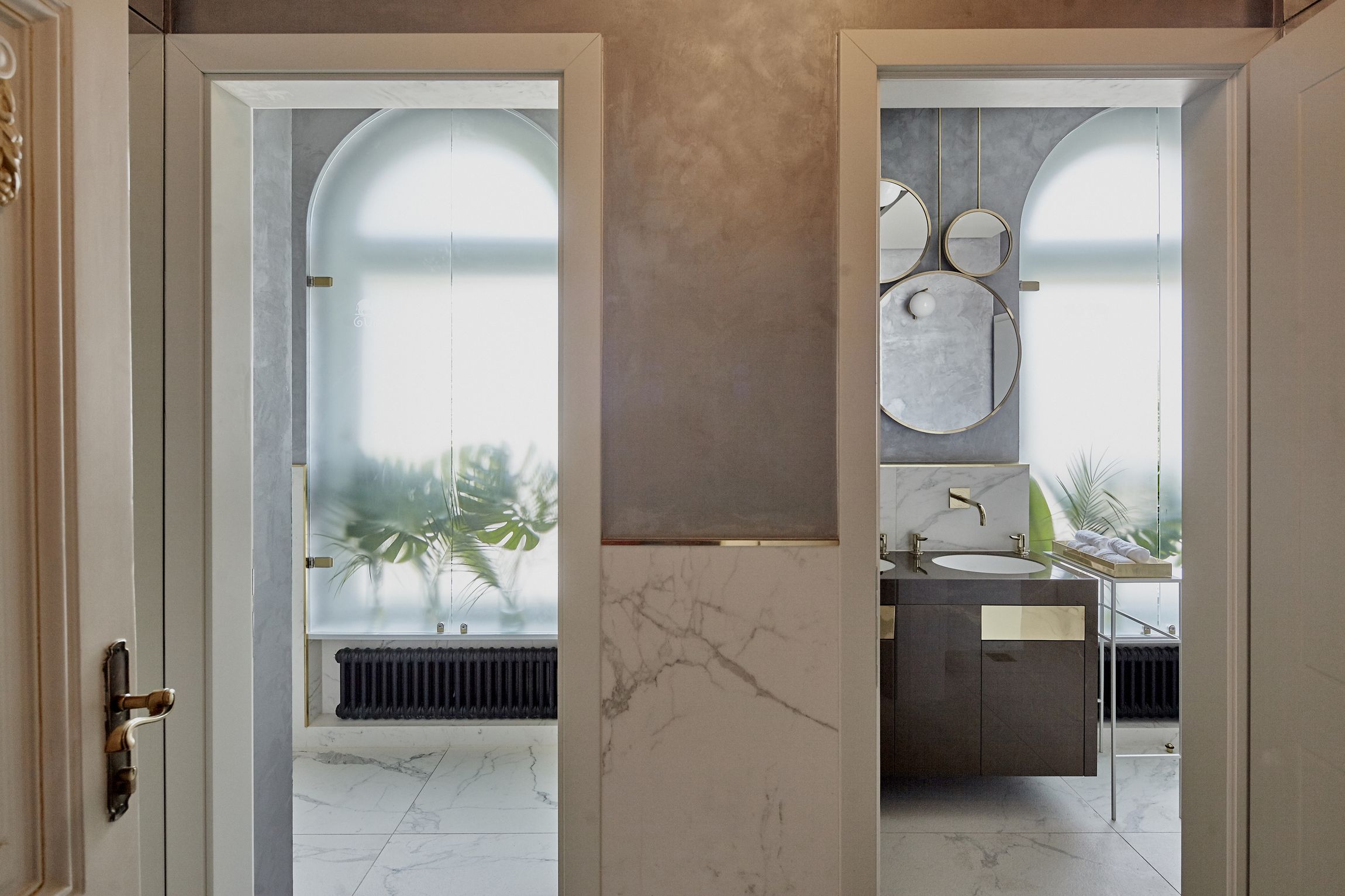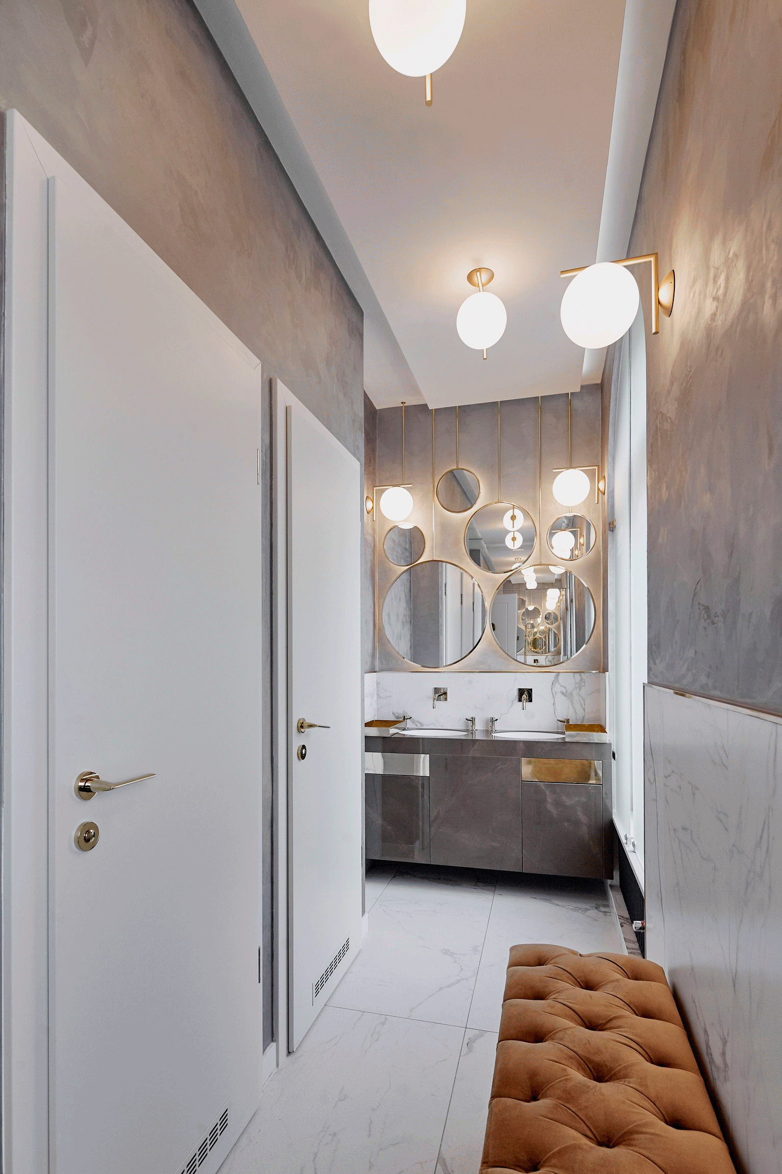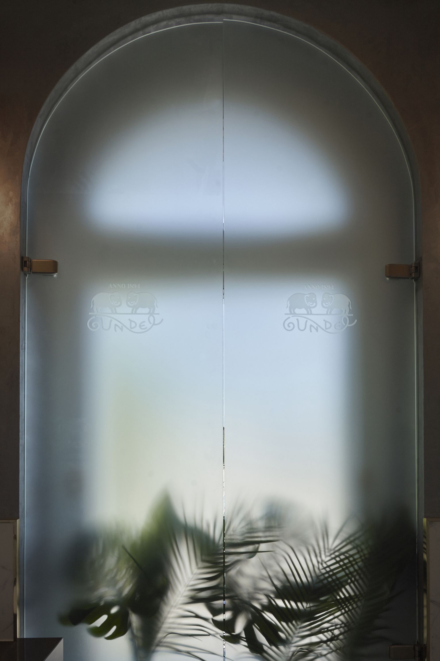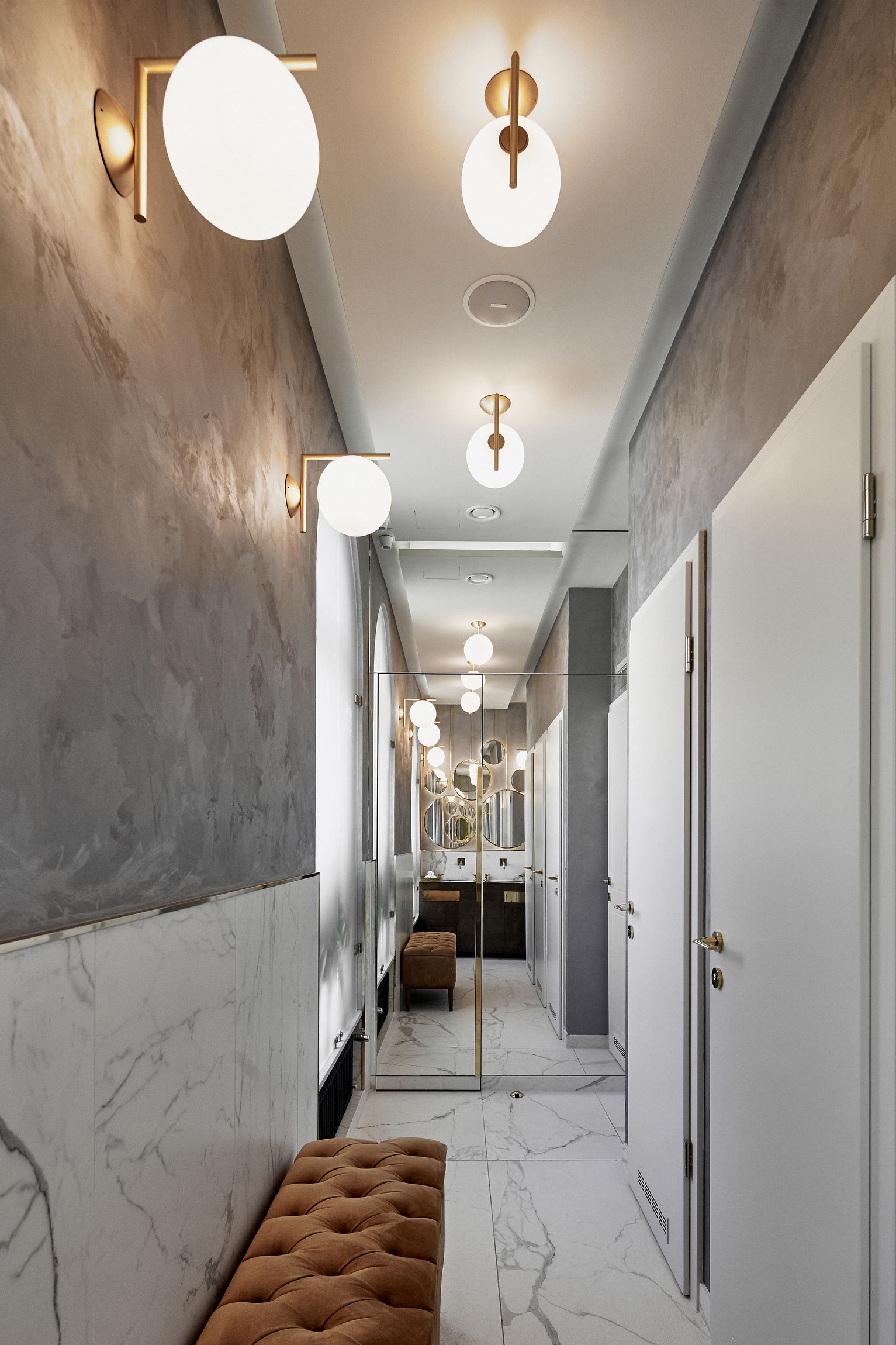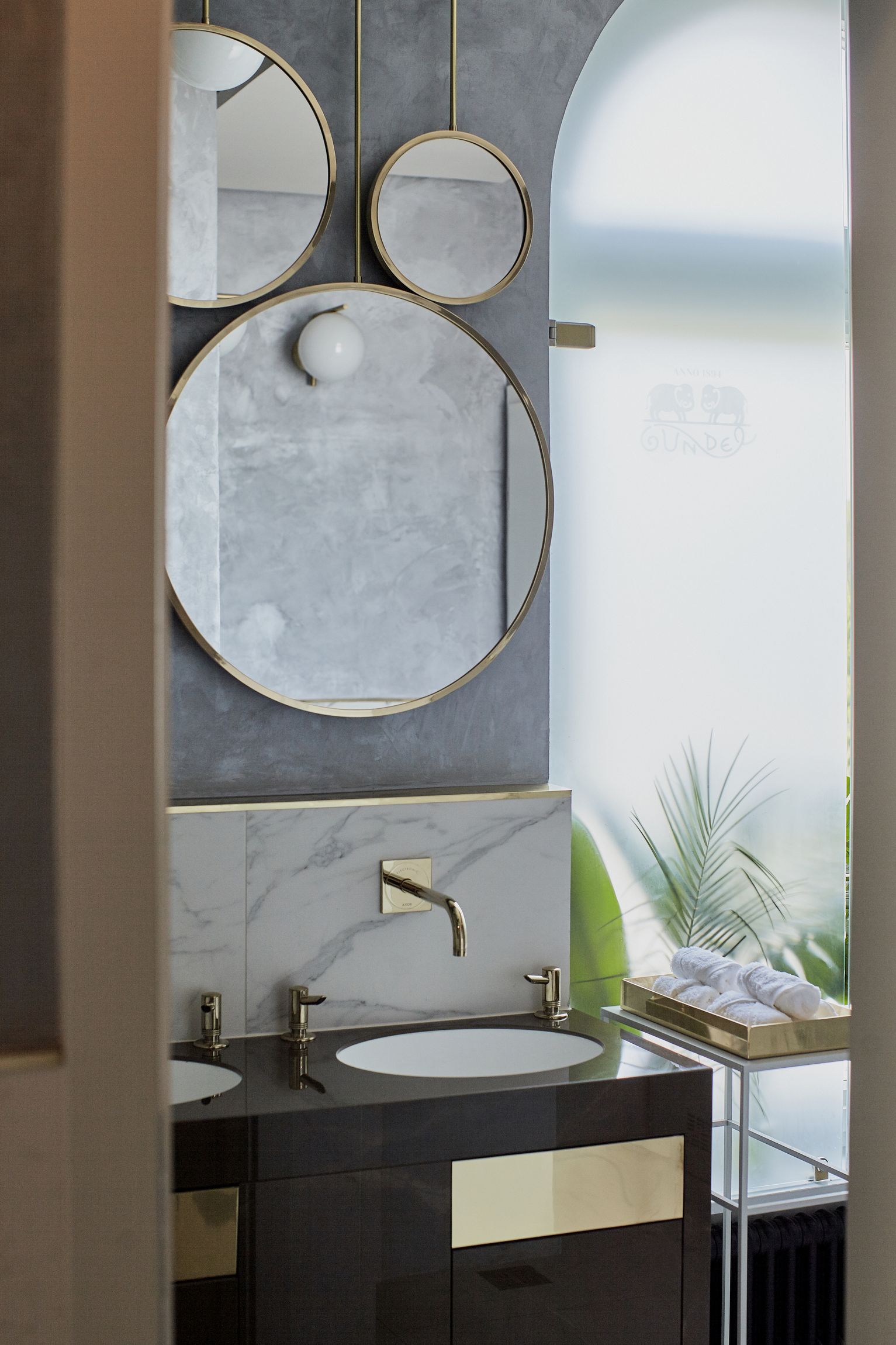 A mosdótál feletti tükrök megformálásához egy metaforát használtunk fel. A feltörő friss forrás buborékos vizének hatása cseng vissza a változatás méretű és véletlenszerűen elhelyezett, kör alakú tükrök elrendezésében. A két mosdóblokk közös előtere a legkisebb tér, itt egy virtuális végtelen folyosót alakítottunk ki a két végfal teljes tükörrel való beborítása során.