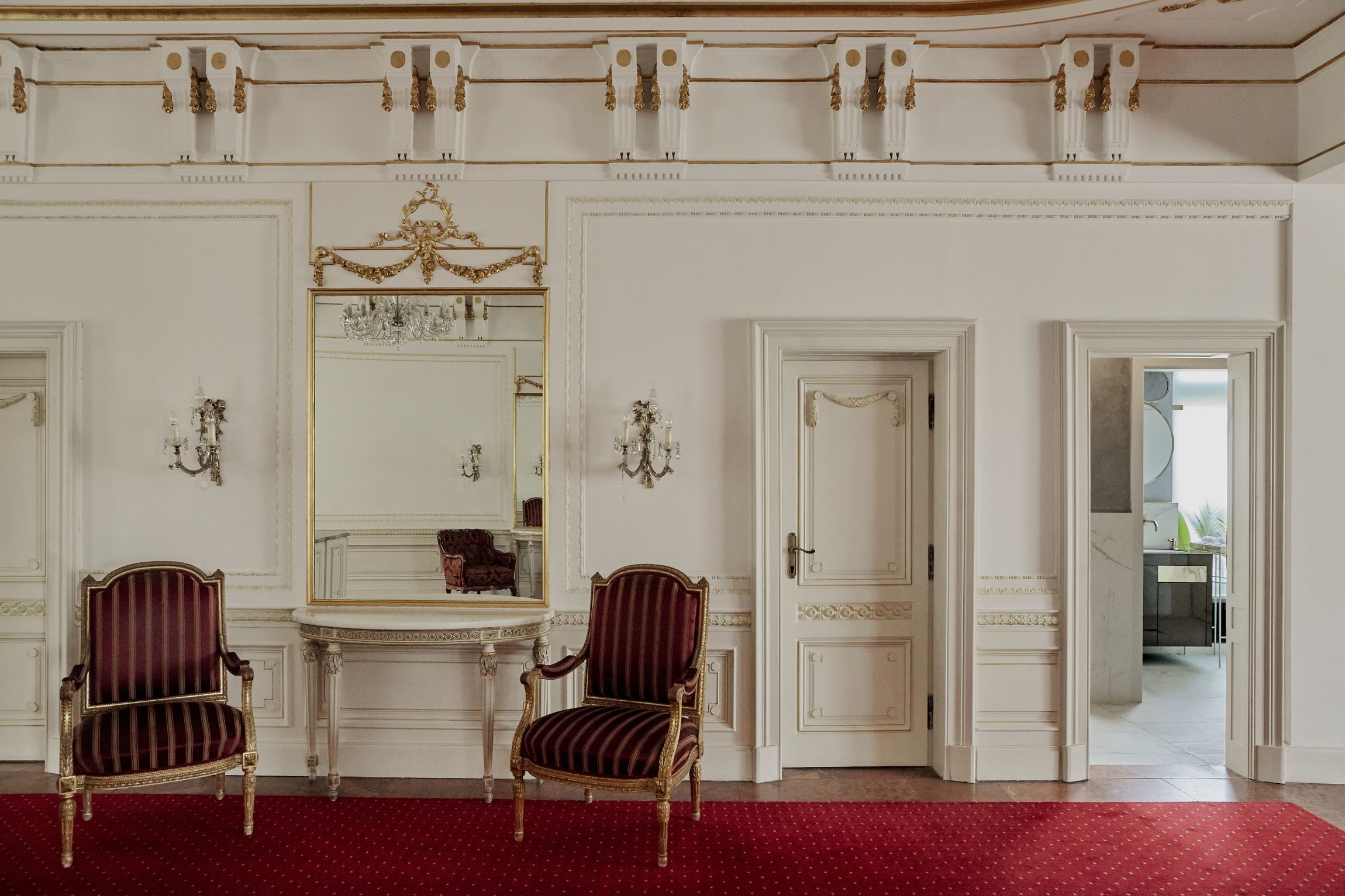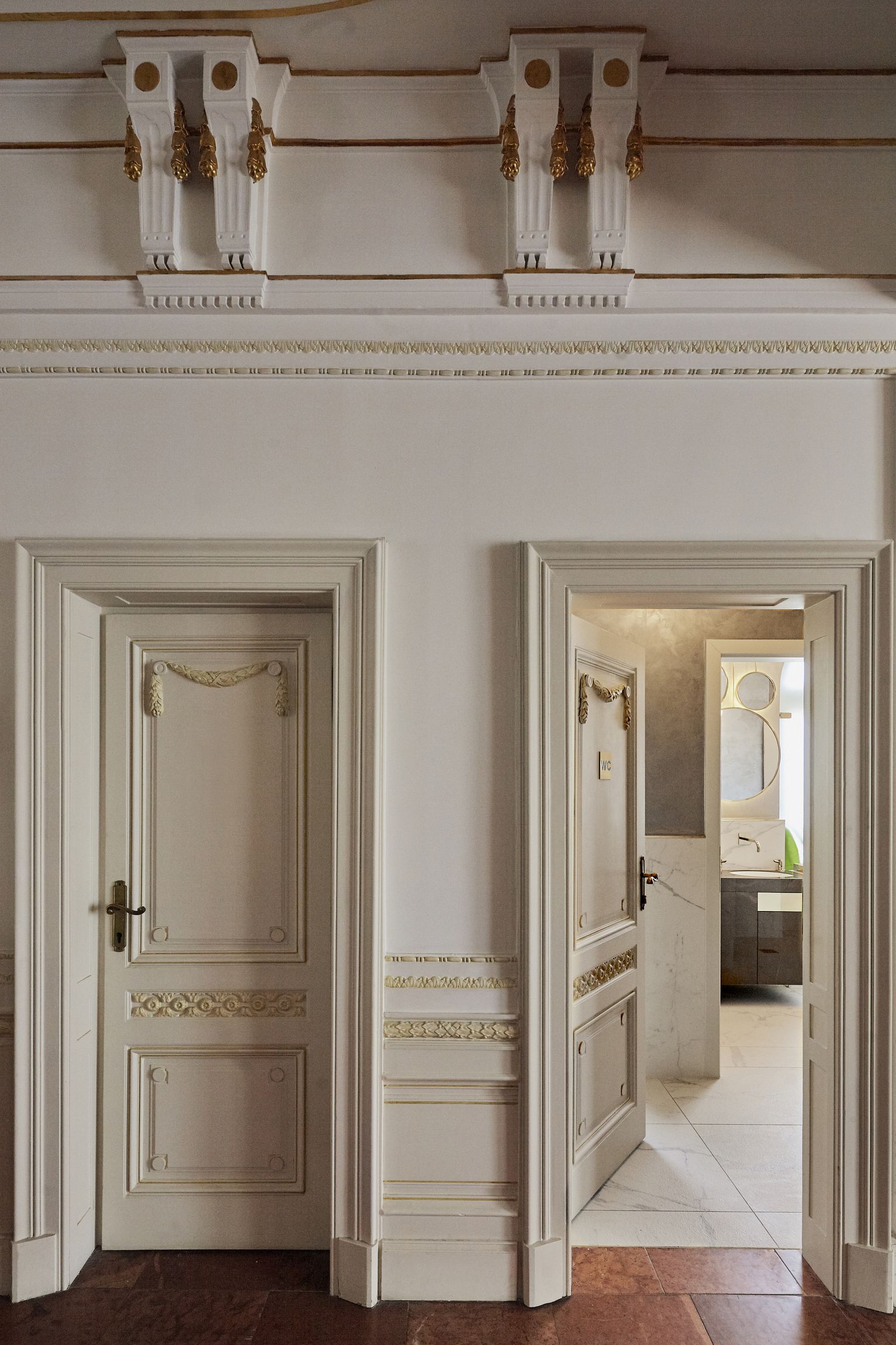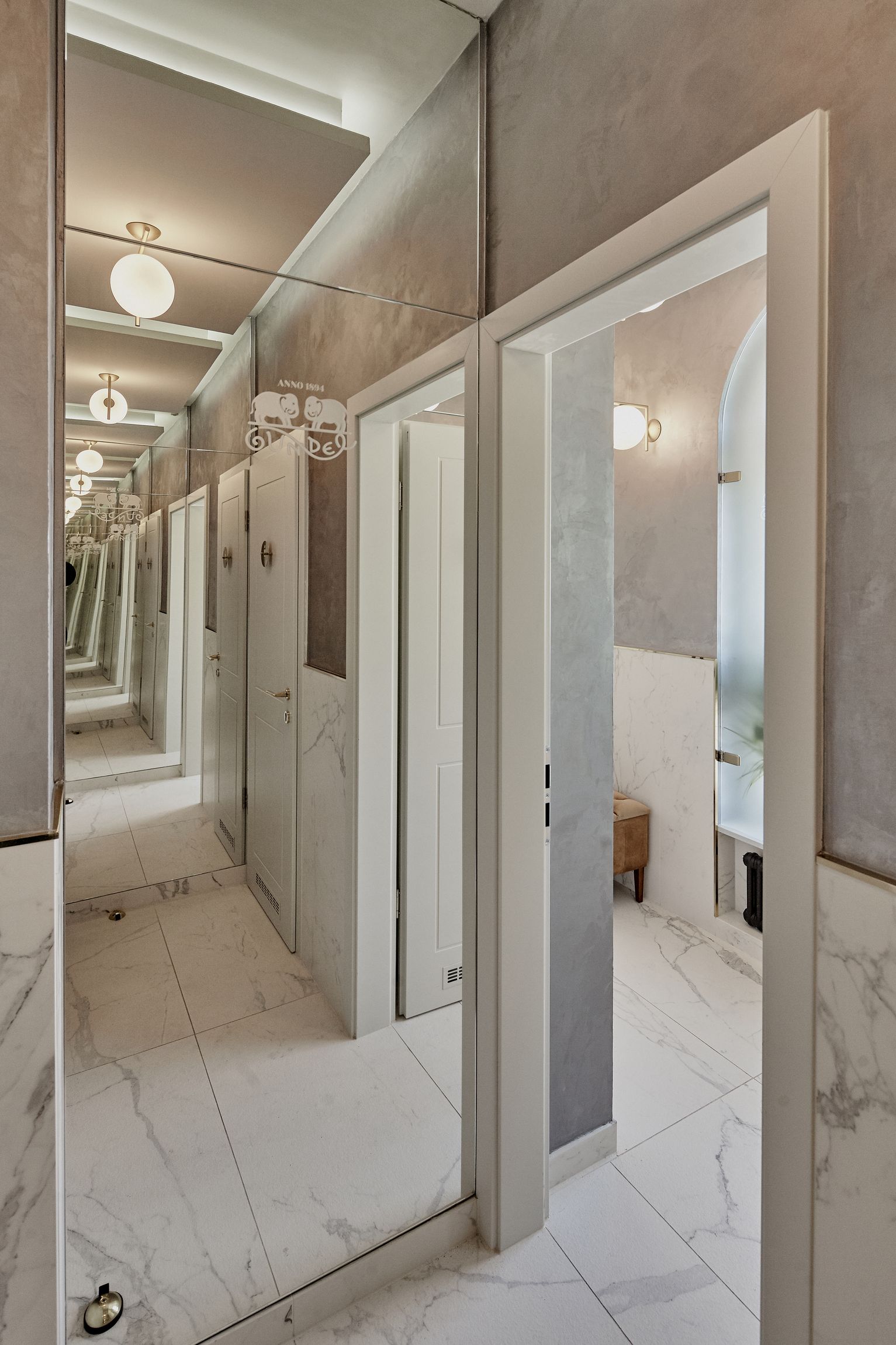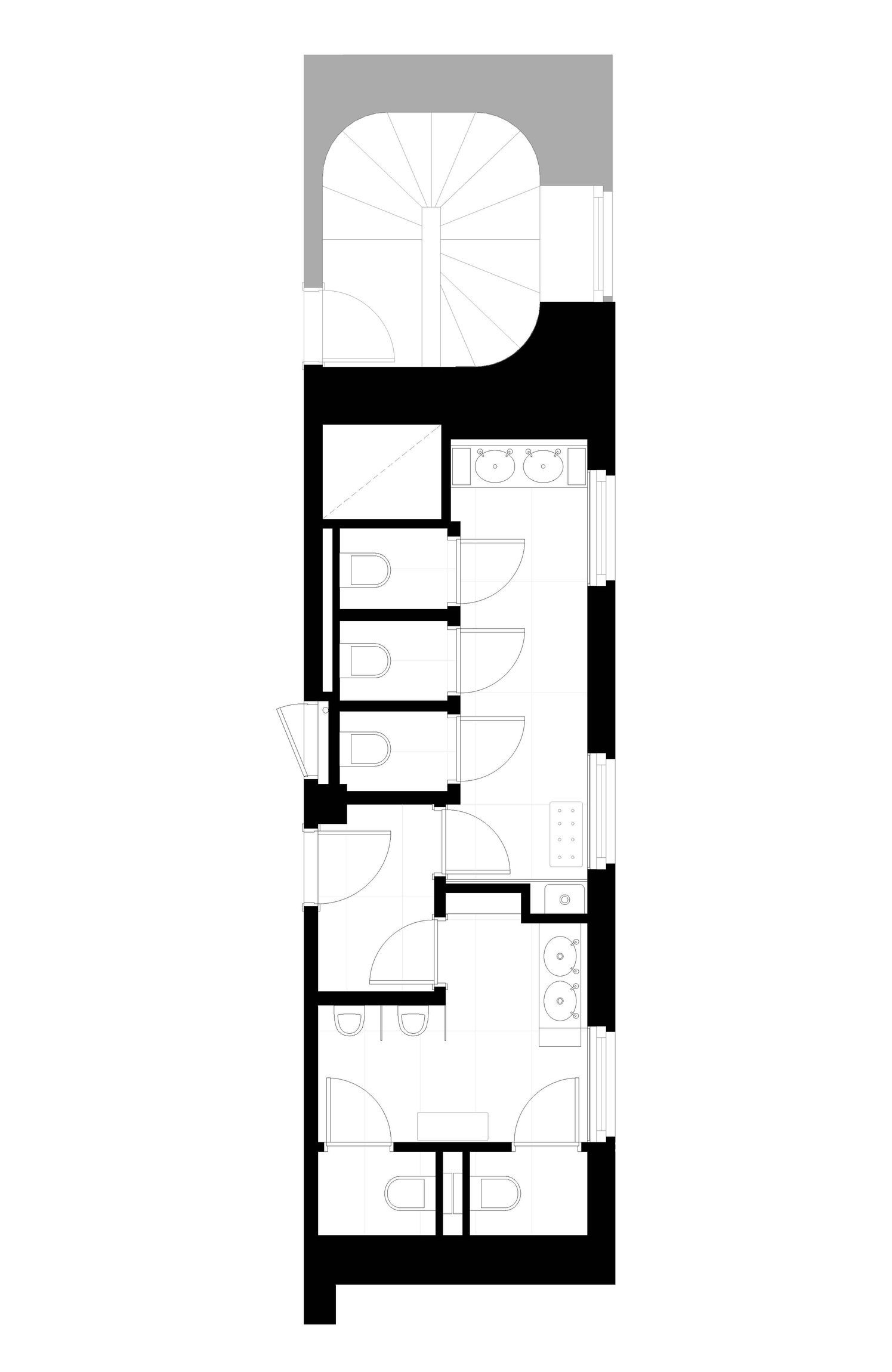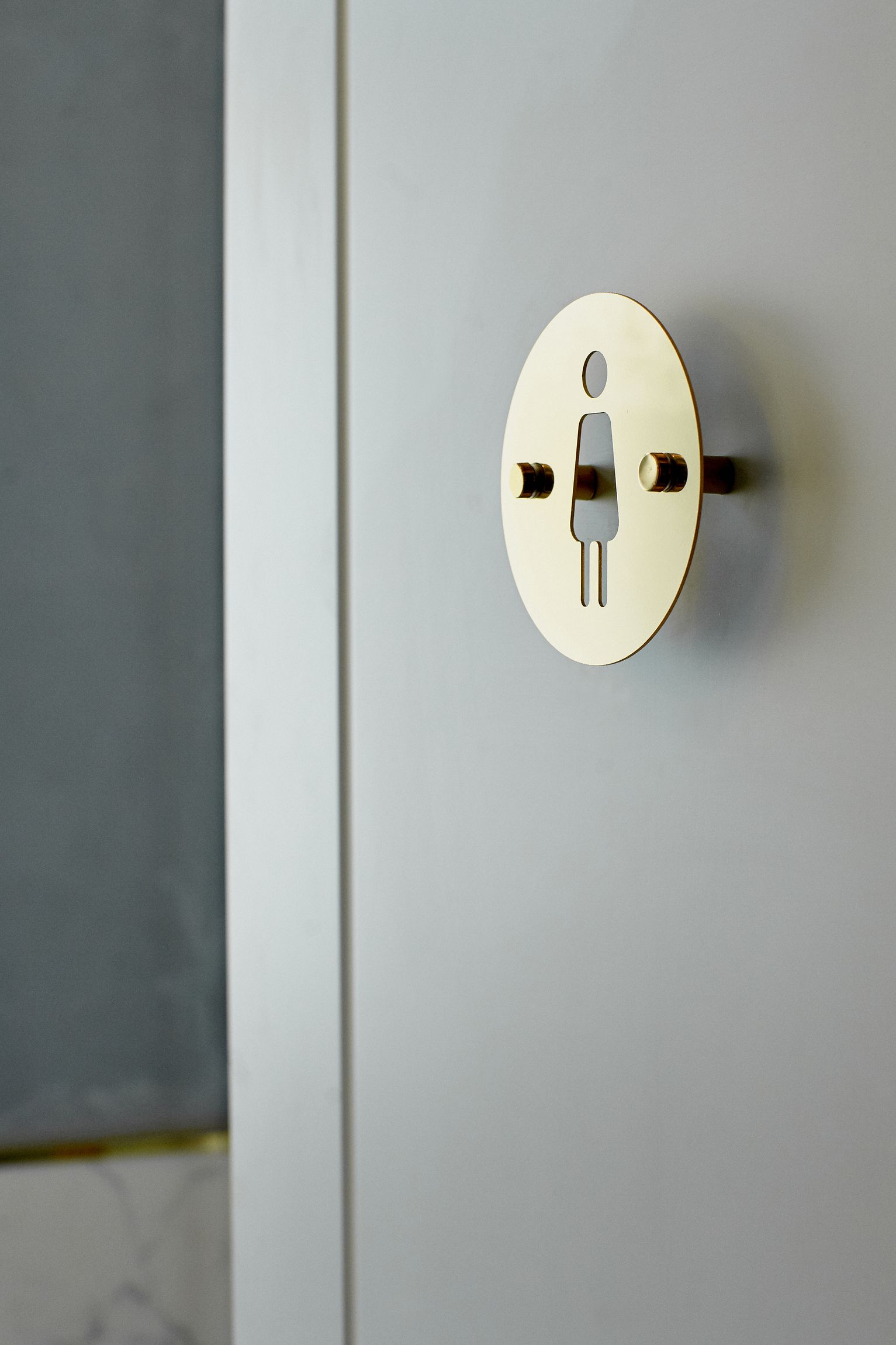 Mivel a rendelkezésre álló terület nagyon kicsi, s a meglévő mosdóblokkoknál még több szerepelt a tervezési programban, a zsúfolt hatás elkerüléséhez világos felületeket és sok tükröt használtunk. Minden új elemet finomhangoltunk a régi étterem belső világához, színben és anyagban követtük a domináns atmoszférát, de teljesen kortárs módon terveztük meg őket.