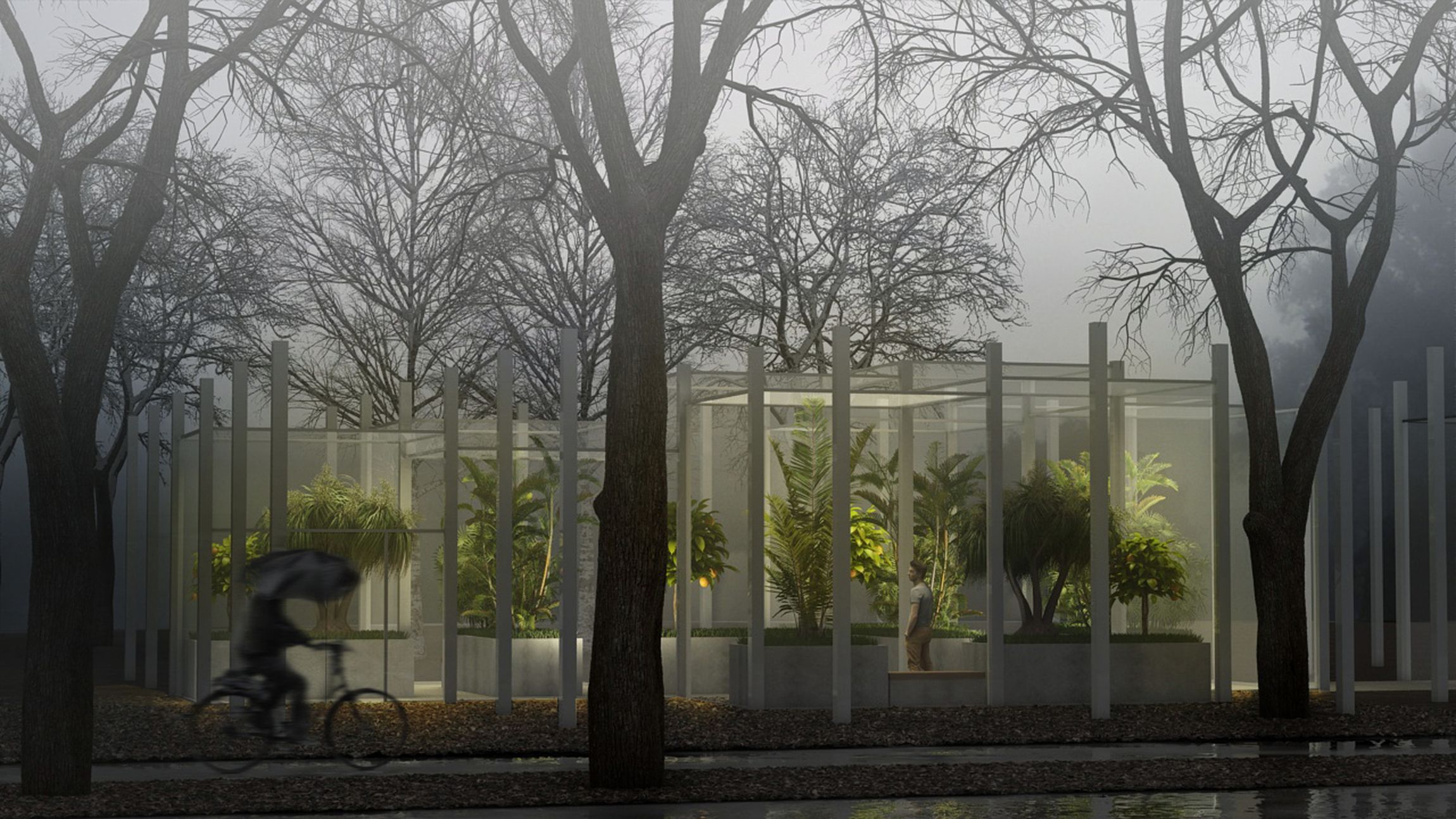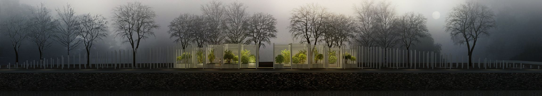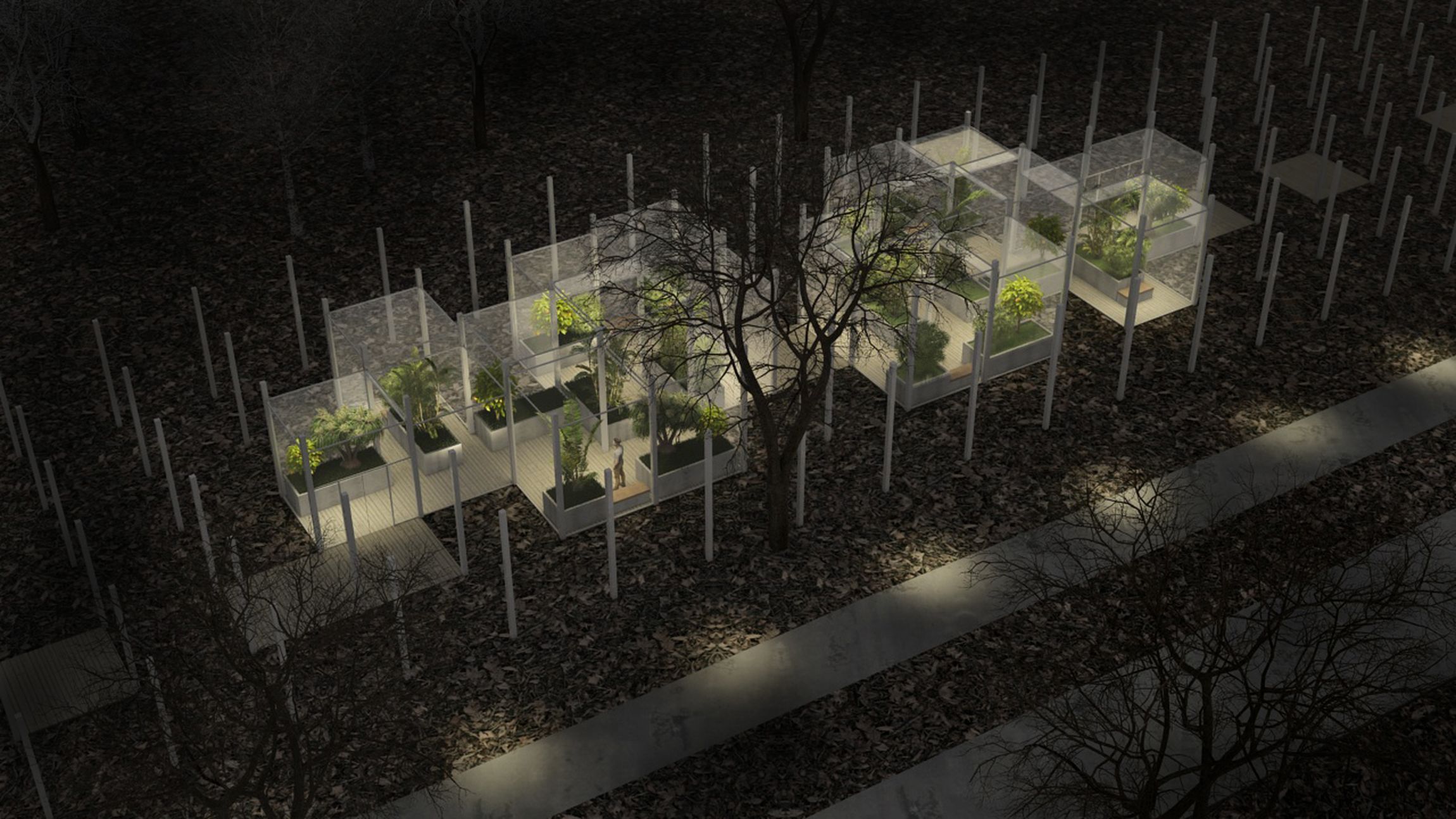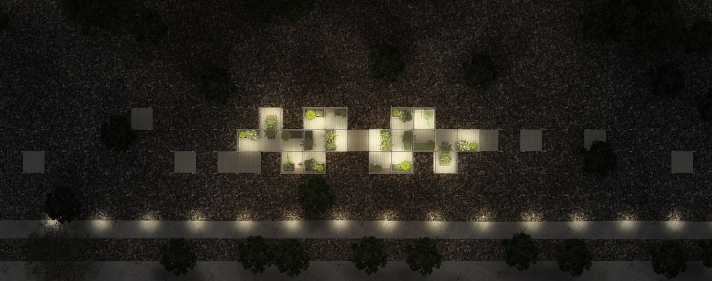 ...több mutatásaA felújításra kerülő Érsekkert mediterrán növényeinek télire szükségük van egy üvegházra, melyet a közeli szőlőföldek rasztere által inspirált kubatúrában terveztük meg. A hideg estéken a növényeket alulról kivilágítjuk, így a park részét képezik, és zöld fényük kedvesebb hangulatot teremt. Nappal a házak nyitottak, be lehet ülni könyvet olvasni, beszélgetni.
