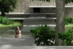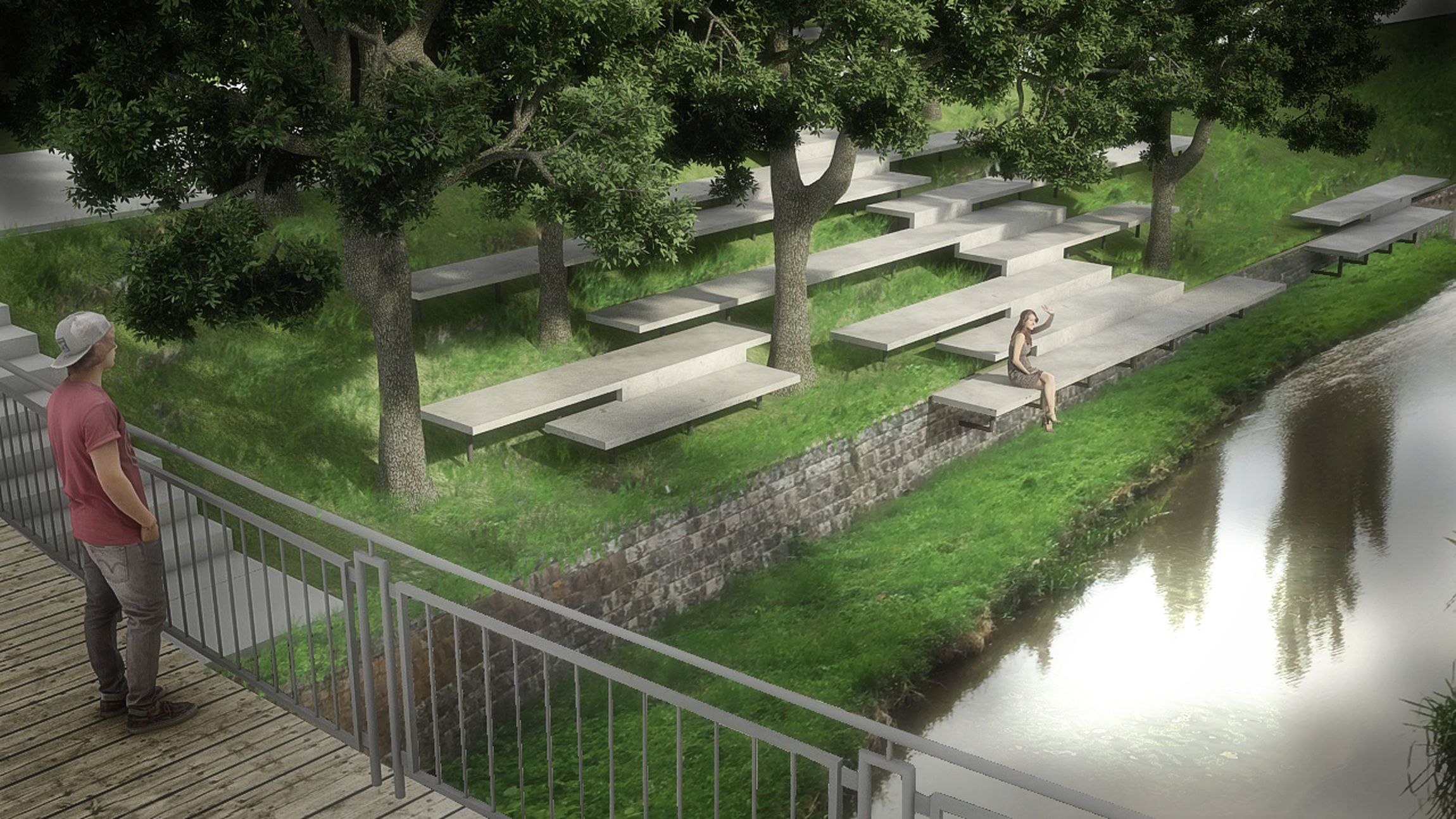 A kertet határoló Eger-patak partjára lebegő beton lapokat helyeztük, hogy az árnyas fák alatt kényelmesen lehessen üldögélni, velük szemben pedig a gyógyfürdő felesleges meleg vizét kiengedő kanális vízfoglalóját fogalmaztuk meg.