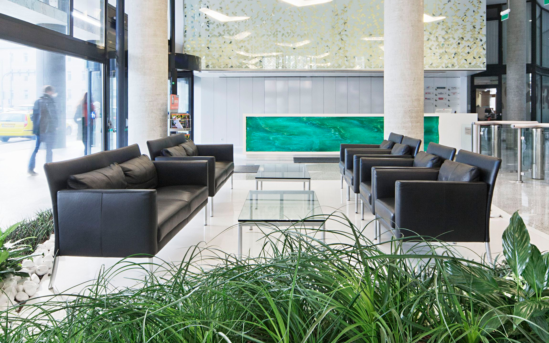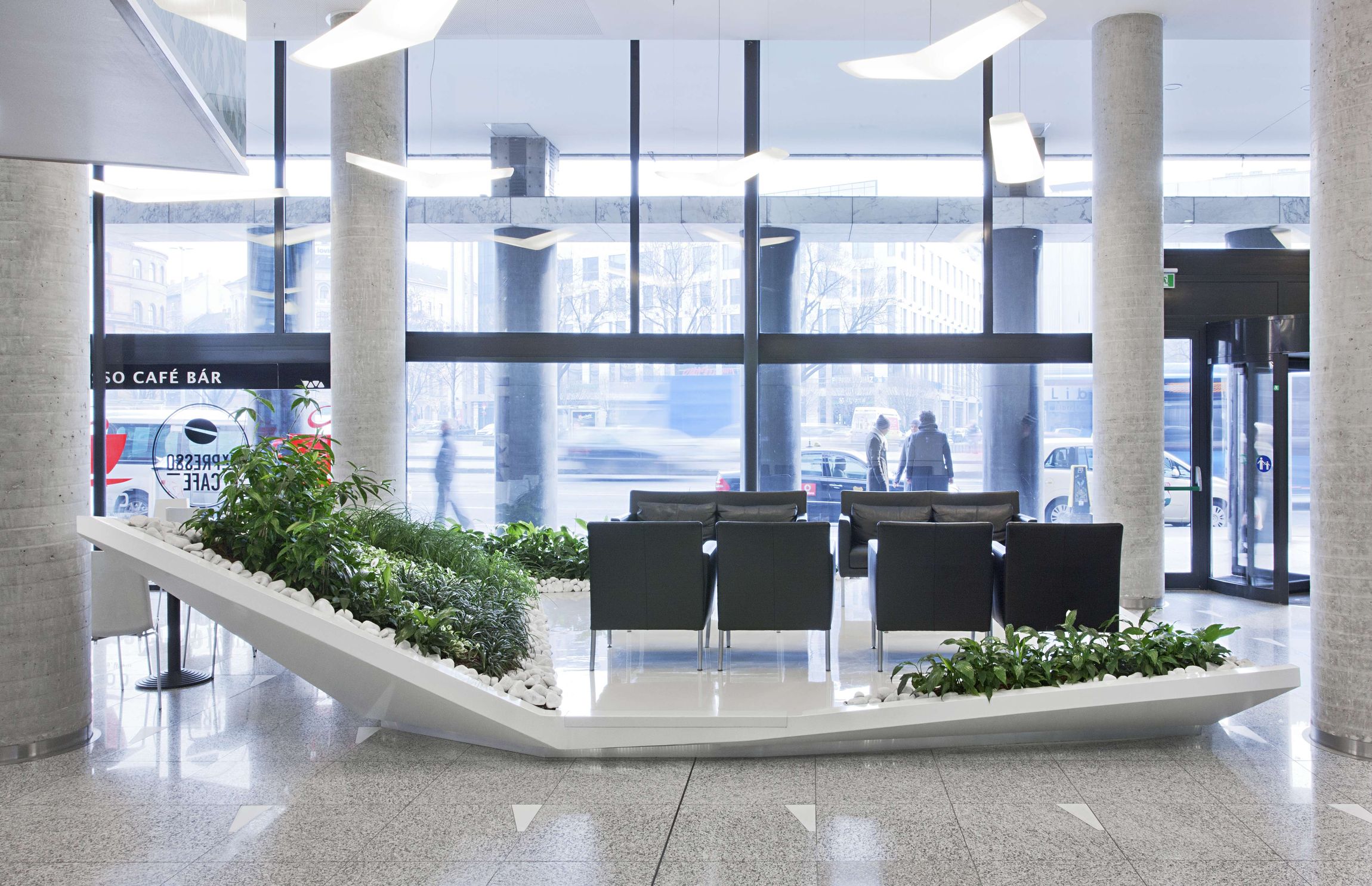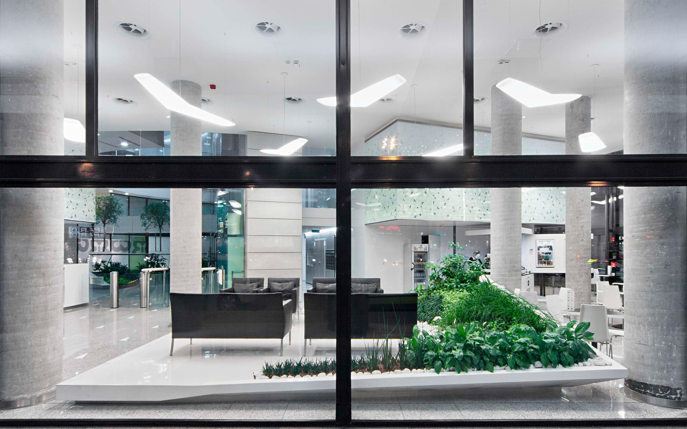 A legnagyobb hatású beavatkozás a belső térben a zöld elemek hangsúlyos alkalmazása. Az épület belső közlekedő és közösségi területei nemcsak átmeneti “semi-public” teret alkotnak a városi külső és az irodai belső terek között, hanem egyben egy zöld szigetet is képeznek, amire az irodák ablakai néznek, és amin az irodisták és vendégeik rendszeresen áthaladnak.