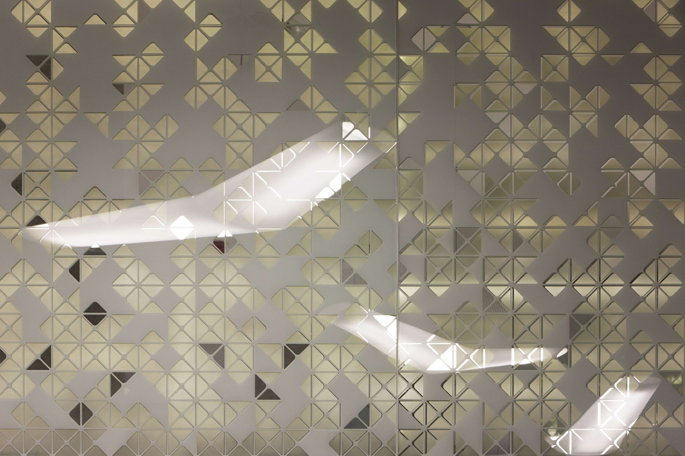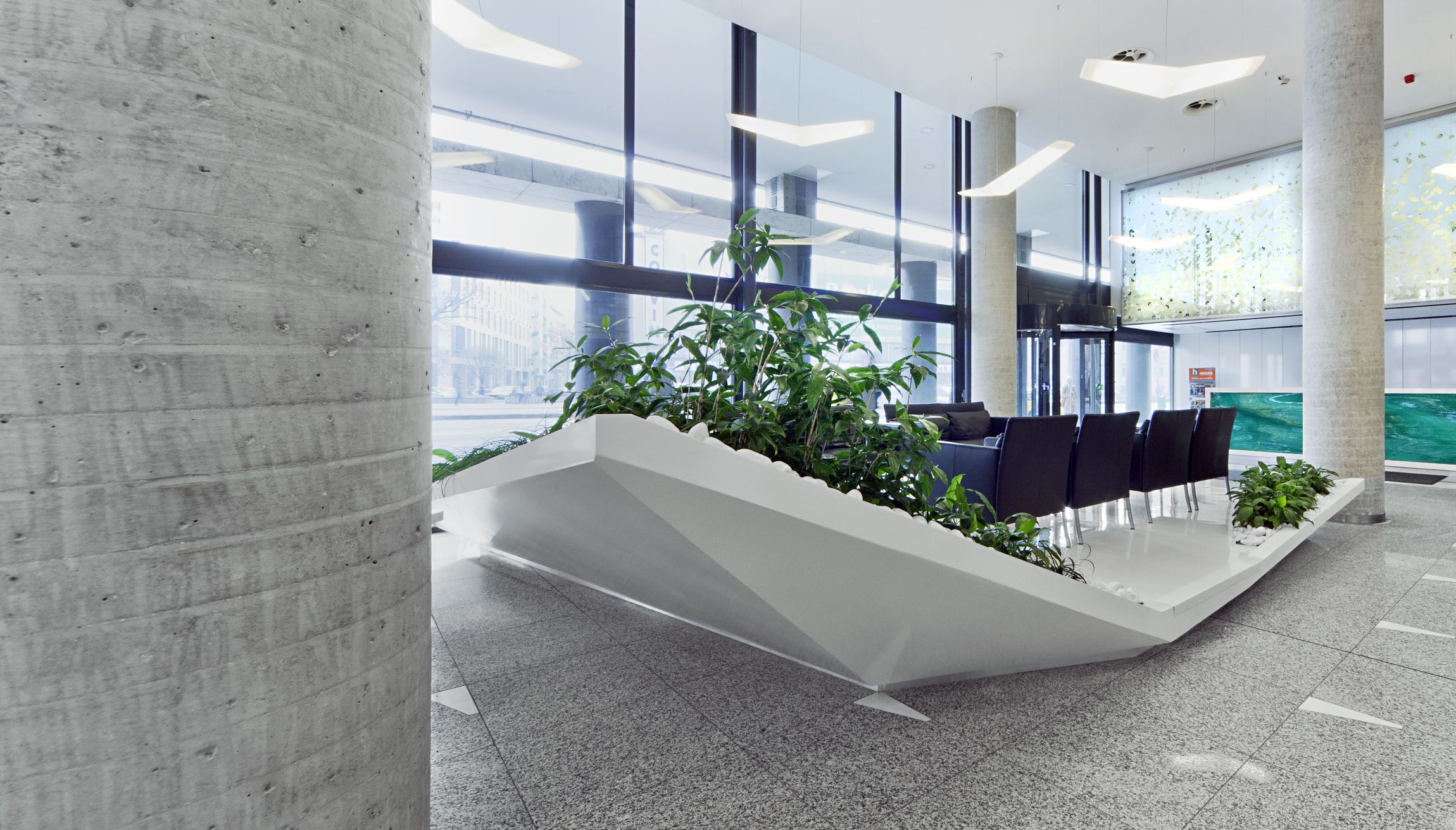 A várakozó terület egy fehér lapokból „hajtogatott”, önállóan álló, szoborszerű podeszt. A felhajtogatott részekből növények nőnek felfelé, melyek kissé le is határolják a lobby-t a kiadható tértől. A teljes objekt meg lett „lebegtetve”, hogy intimitást adjon az ott ülő várakozóknak.