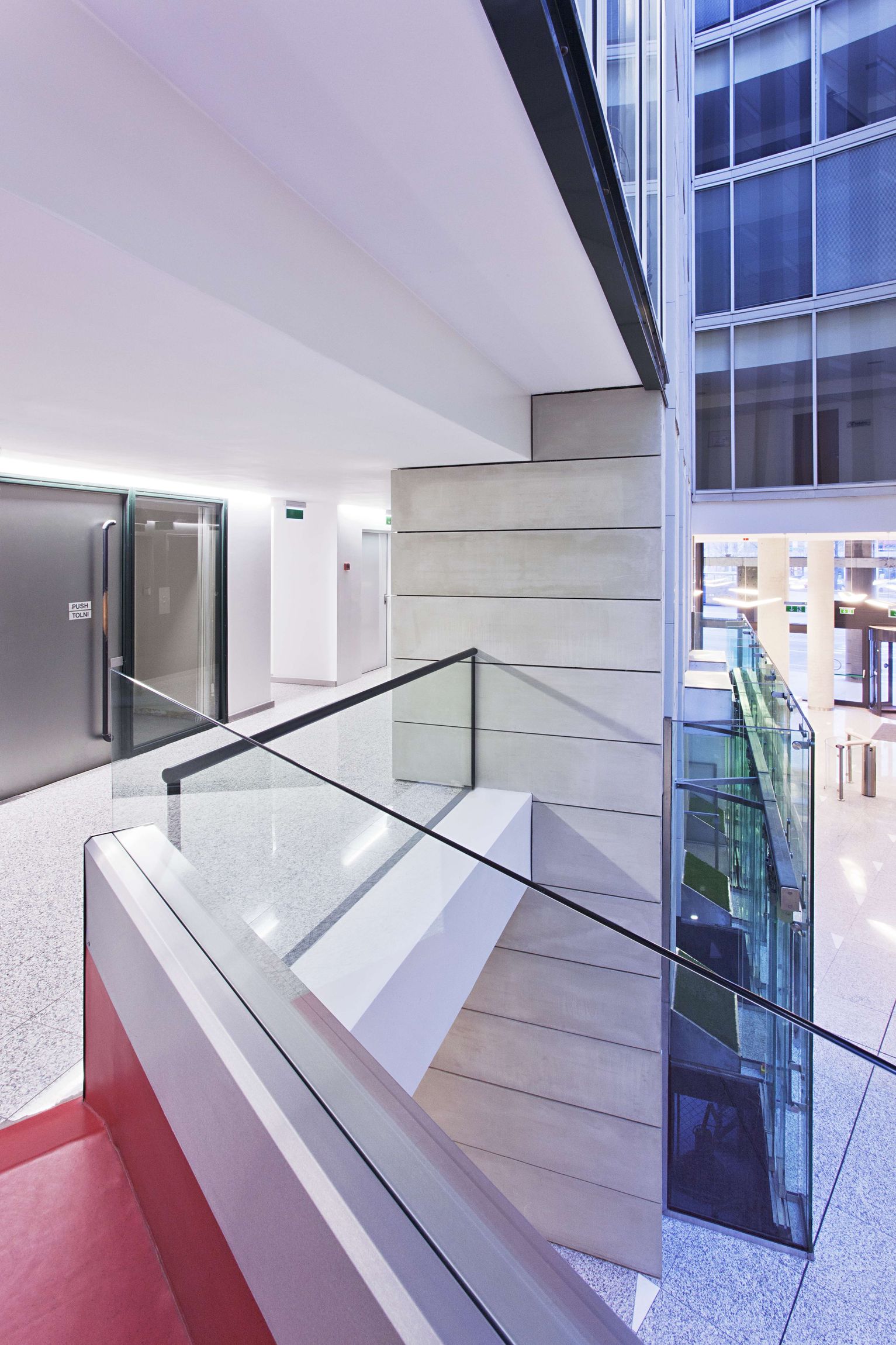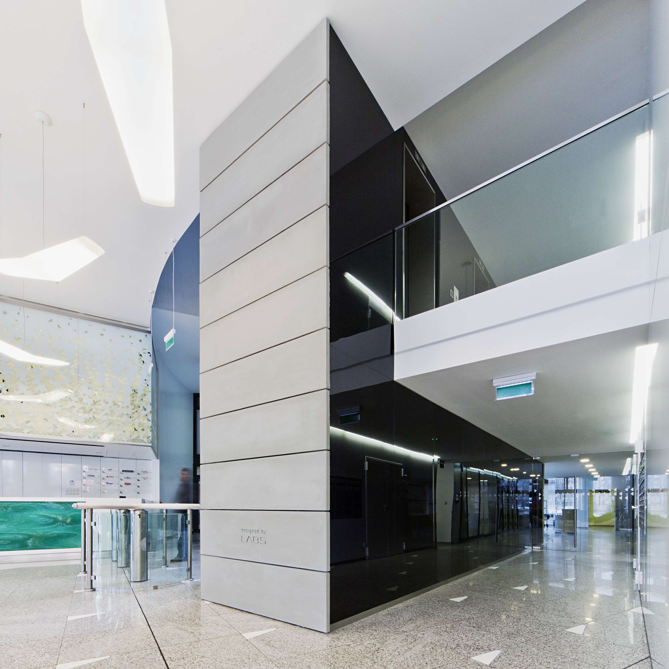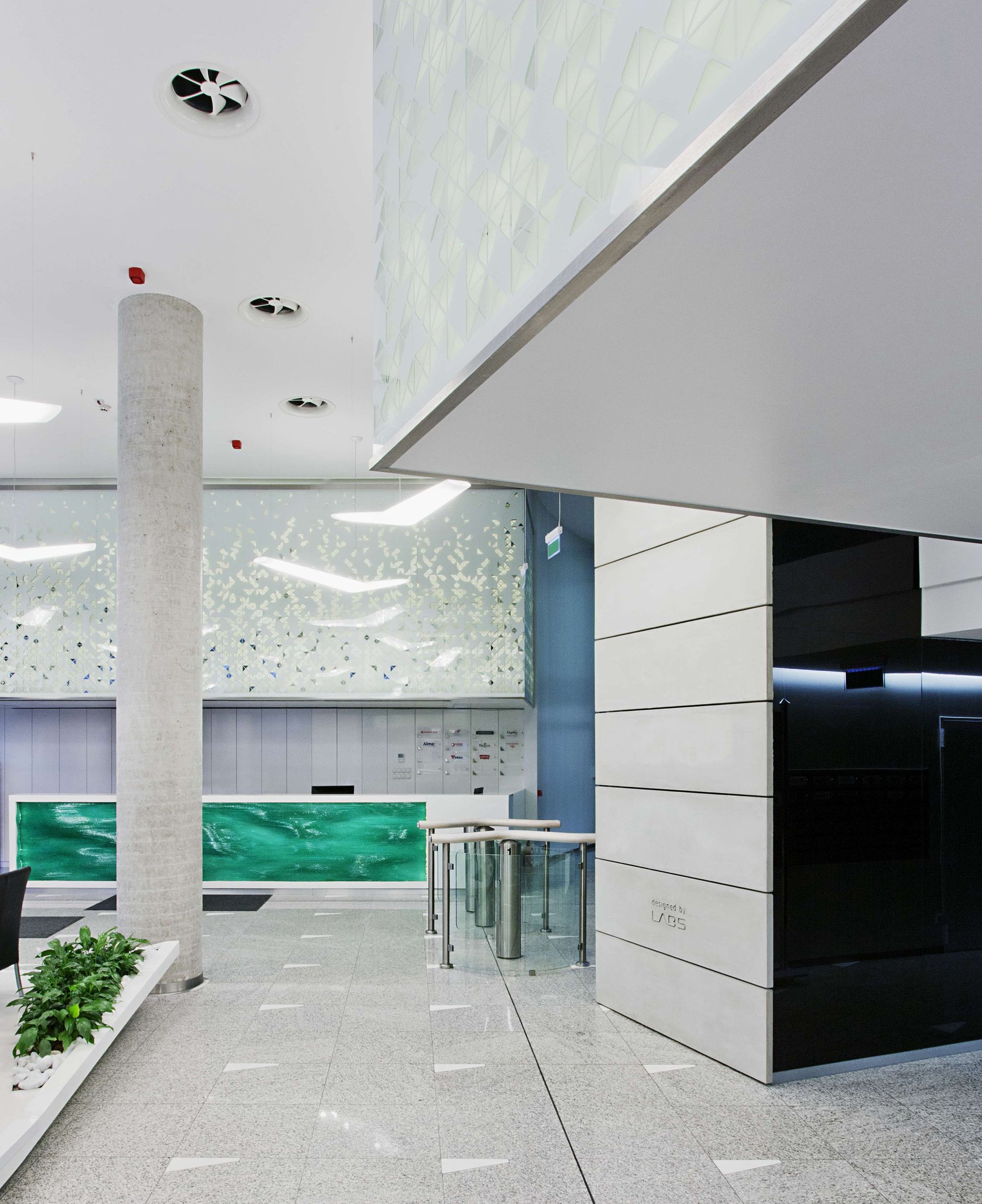 A recepció és a kiadható tér felett néhány elemet el kellett rejteni, ide a nagy belmagasságú térben „repülő” dobozok kerültek. Ezek többrétegű üvegfelülettel burkoltak, vagyis vegyesen áttört, savmart, és tükör felületekből. Belülről ki vannak világítva, így a lobby a munkaidőn túl, az épület esti képéhez szervesen hozzájárul.