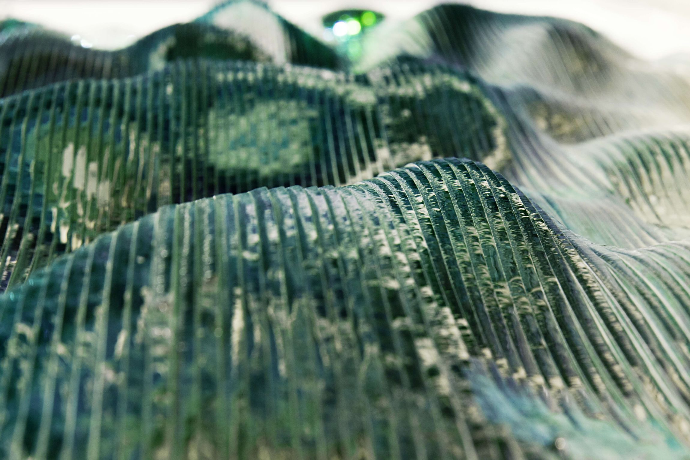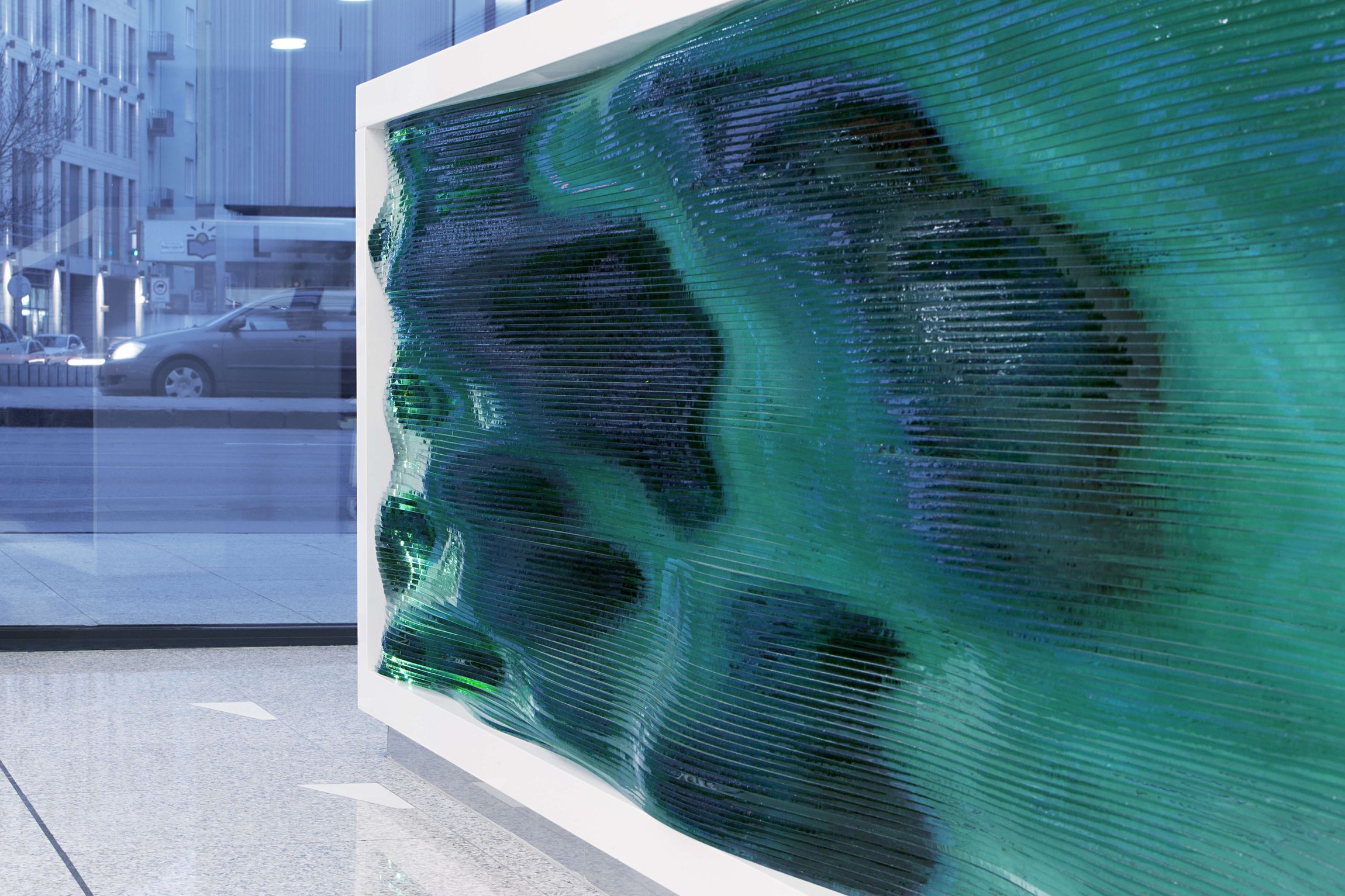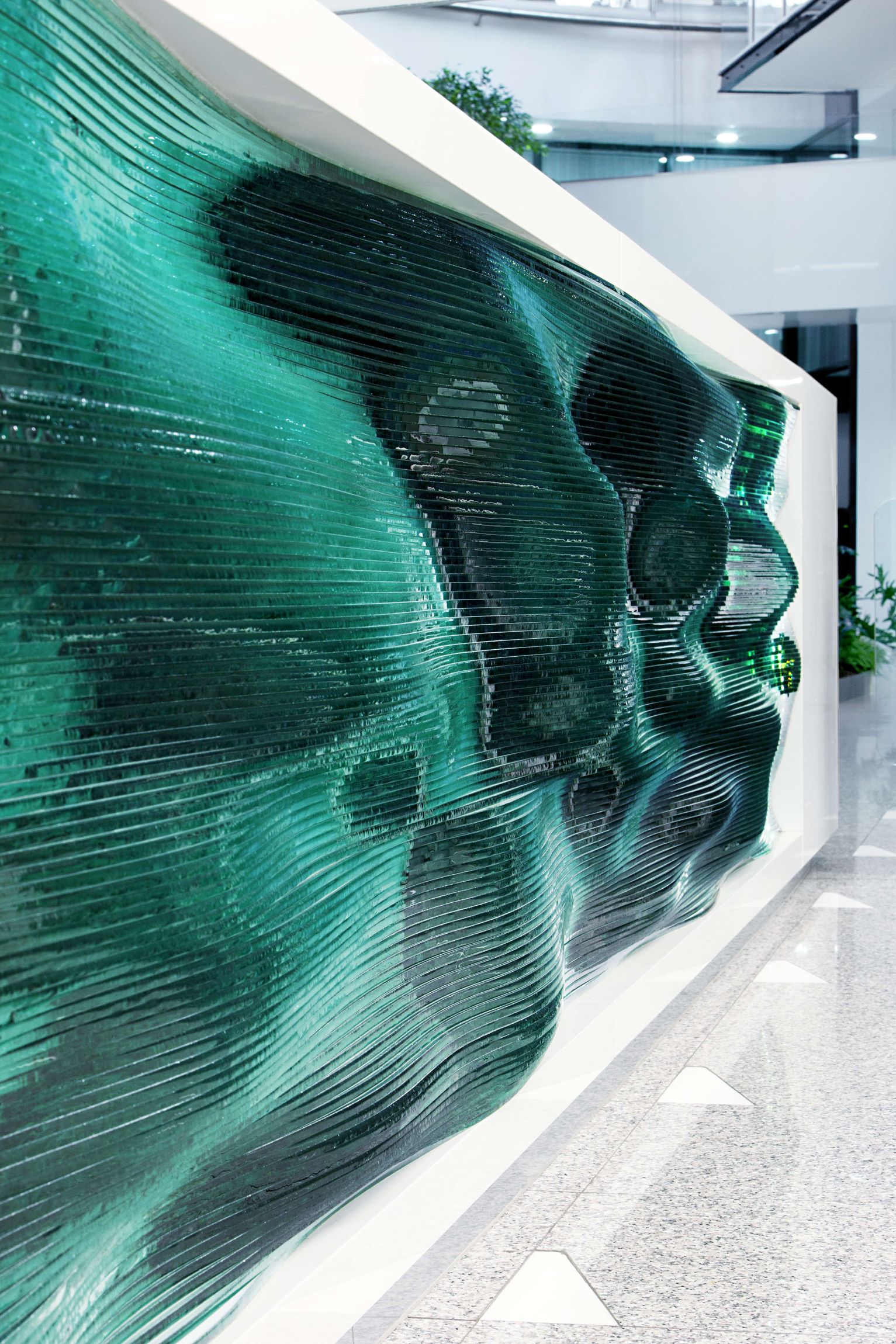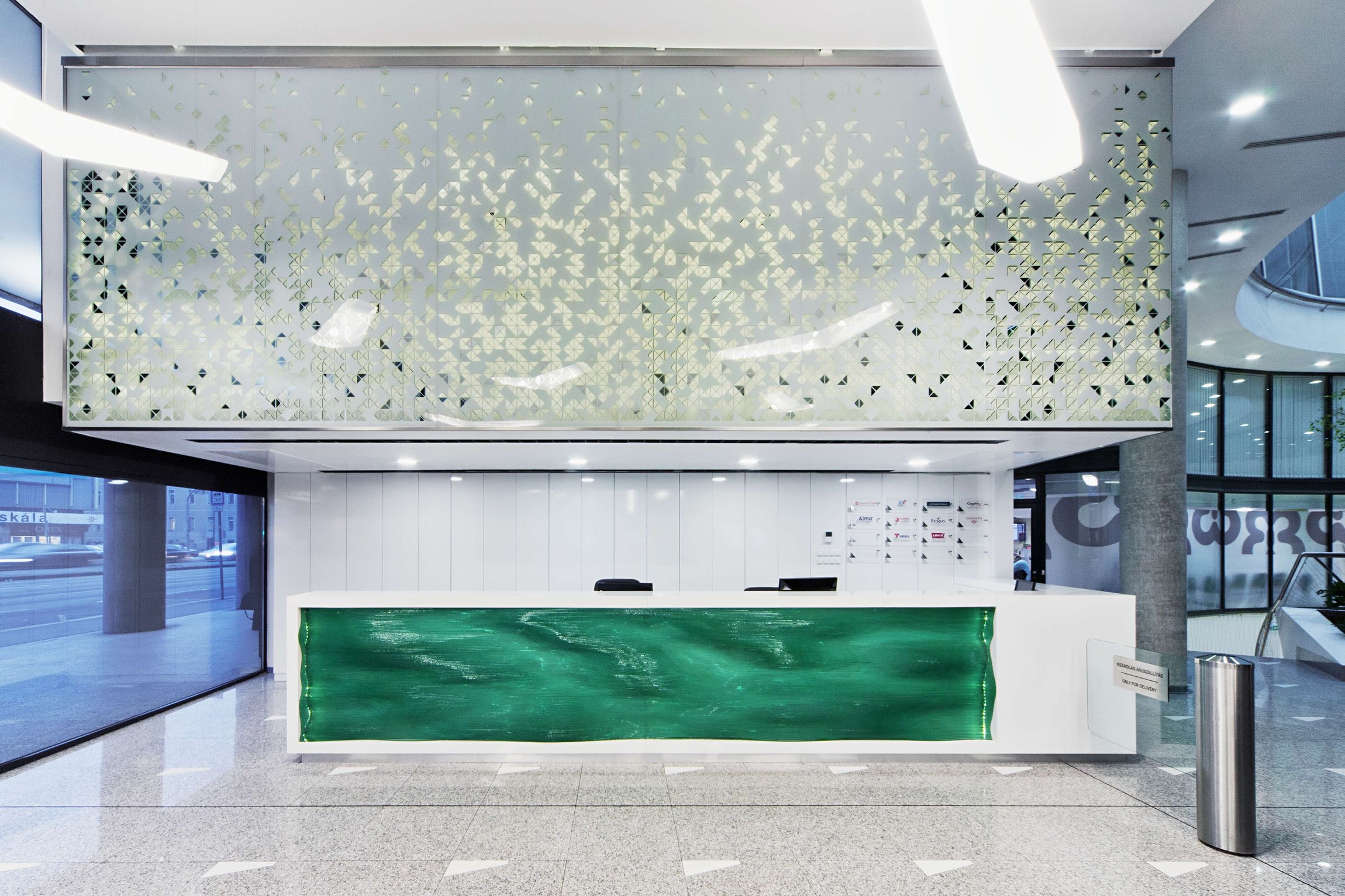 A recepciós-pult szintén művészi formálás eredménye, a frontját egyedi üvegművész alkotás adja. Az üveg speciális halmazállapotú folyadék, a formálás is hullámokat idéz; mindez arra utal, hogy az irodaépület legforgalmasabb pontján található, ahol nemcsak megérkeznek és elköszönnek az emberek, hanem információt is cserélnek, ezáltal egyfajta, folyamatos „flow”-t generálnak.