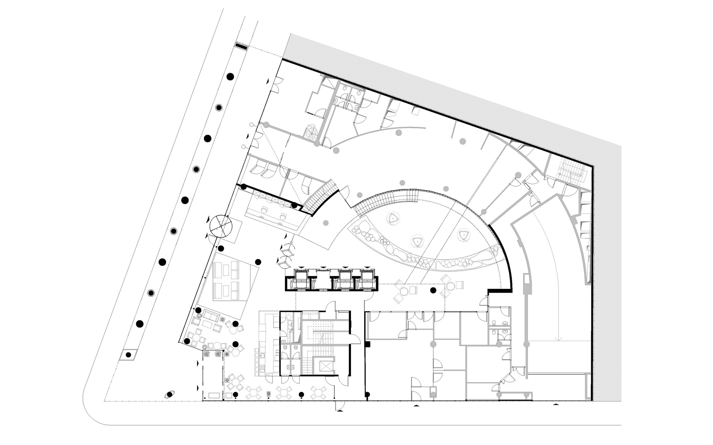 A földszinten új, kiadható, utcakapcsolattal rendelkező teret szerettek volna elhelyezni, így a tervezők a főbejárat súlypontba történő áthelyezését javasolták. Így egyrészt, az utcasarkon felszabaduló hely remek adottságokkal rendelkezik, mint kiadható tér, másrészt, az új főbejáraton történő belépés sokkal kedvezőbb hatású, mint korábban.