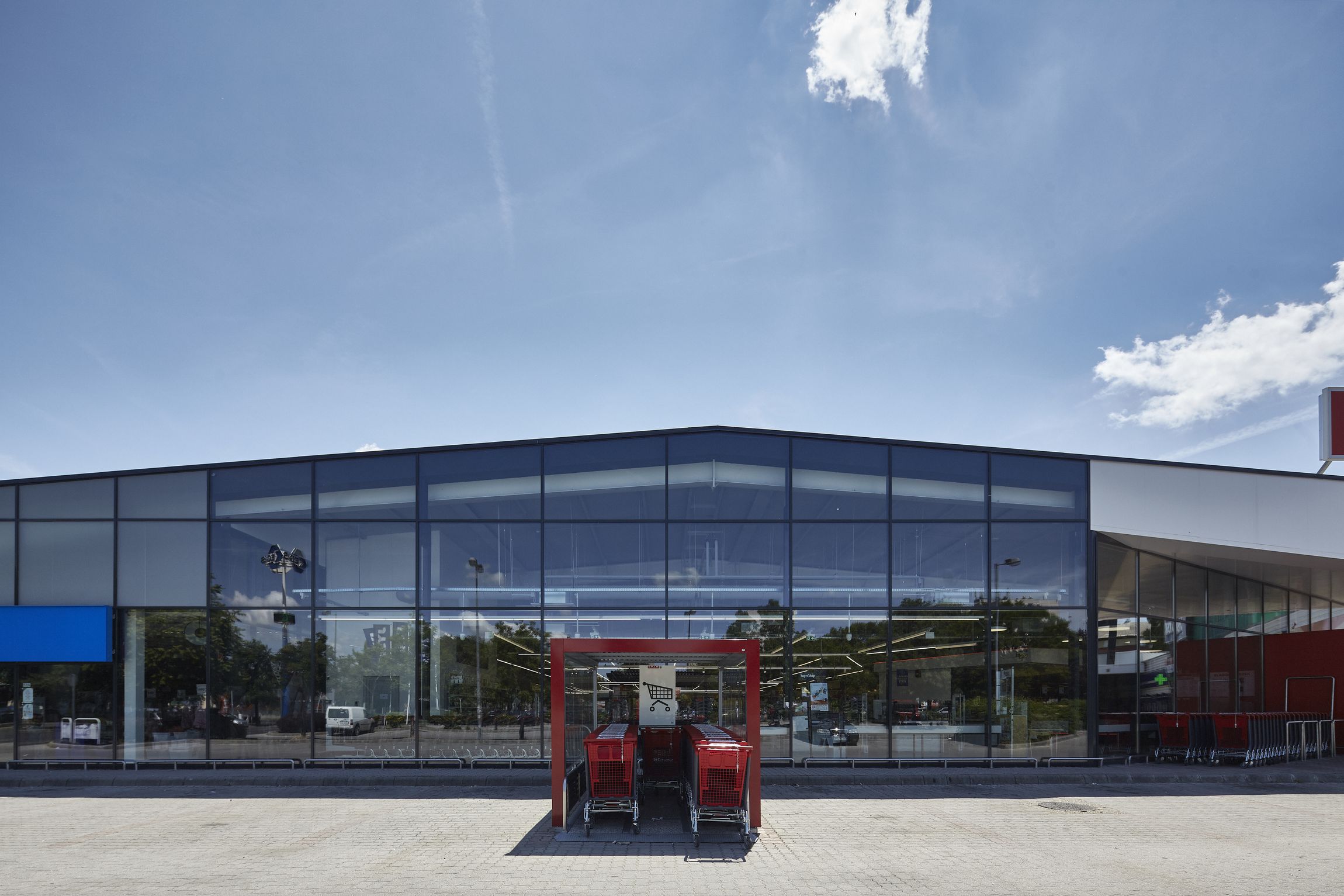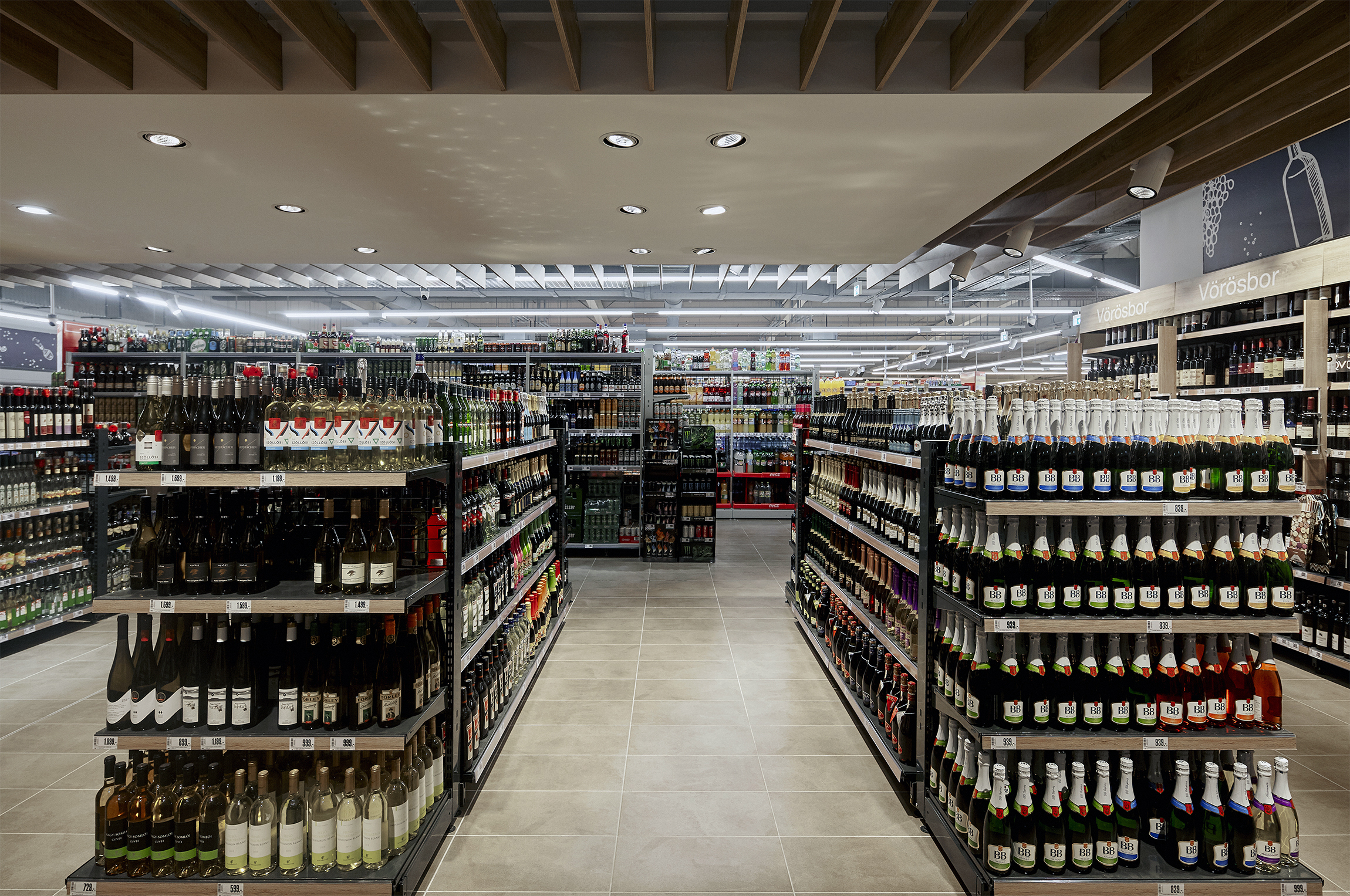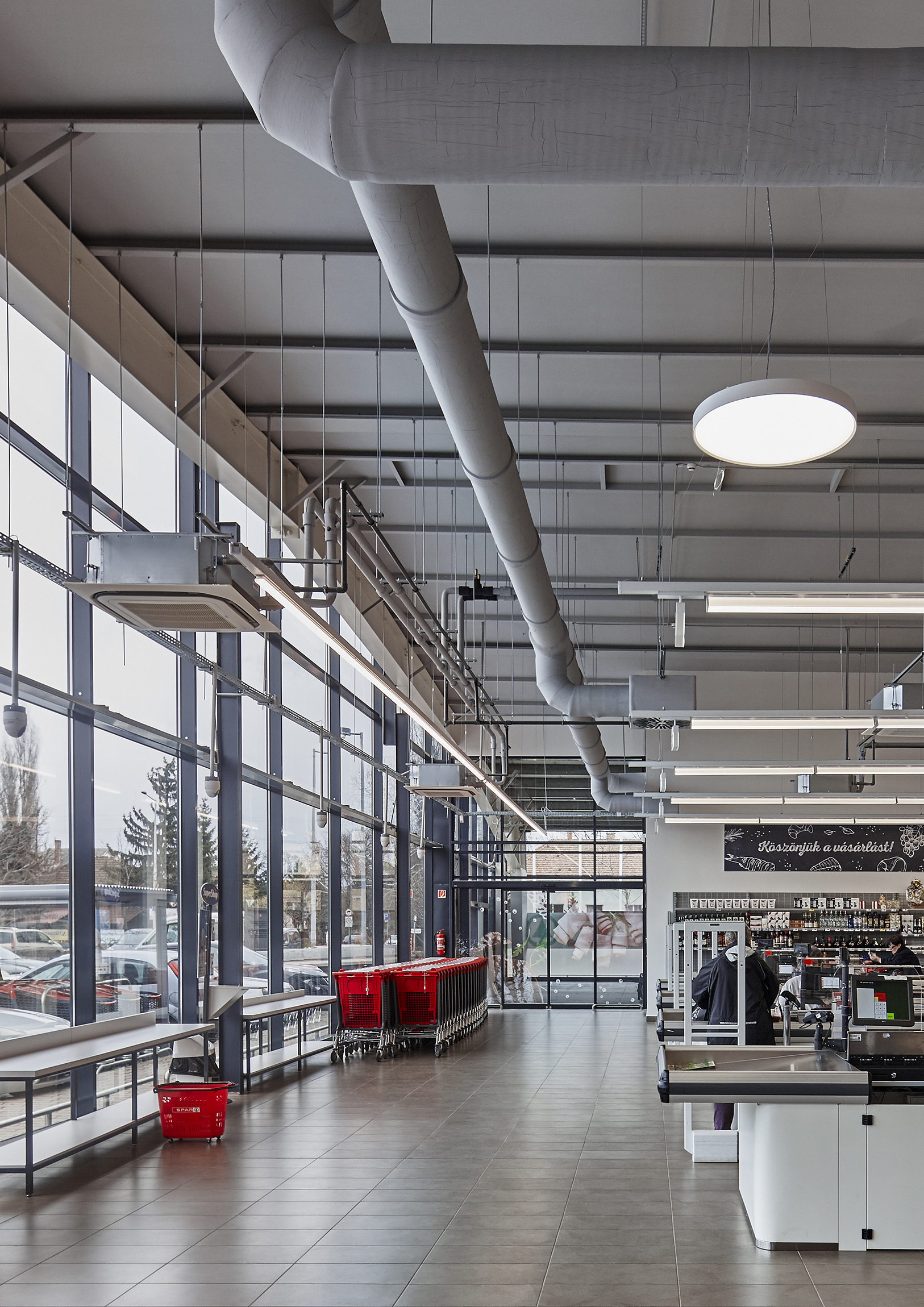 A Kőbányán található szupermarket teljes belső felújításon és átalakításon esett át. A Kerepesi úti parkolóra néző homlokzat korábban tömör volt, most a Spar új trendjeit követve teljes felületen üvegfallal megnyitottuk. A meglévő épület érdekes adottsága, hogy a nagy fesztávot alátámasztás nélkül hordja át a fedélszék, így az impozáns, flexibilis üzlettér könnyedén kialakítható volt benne.