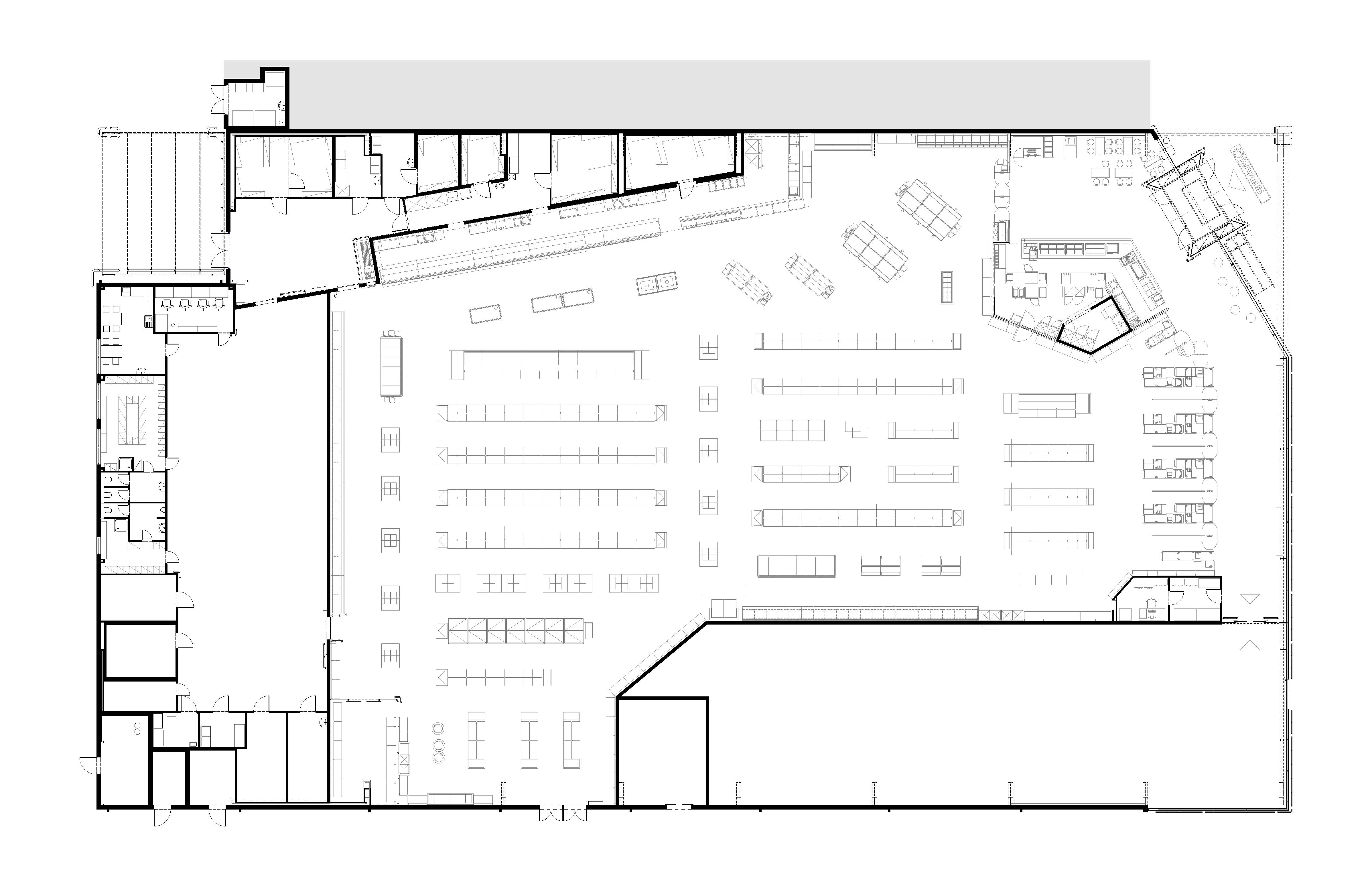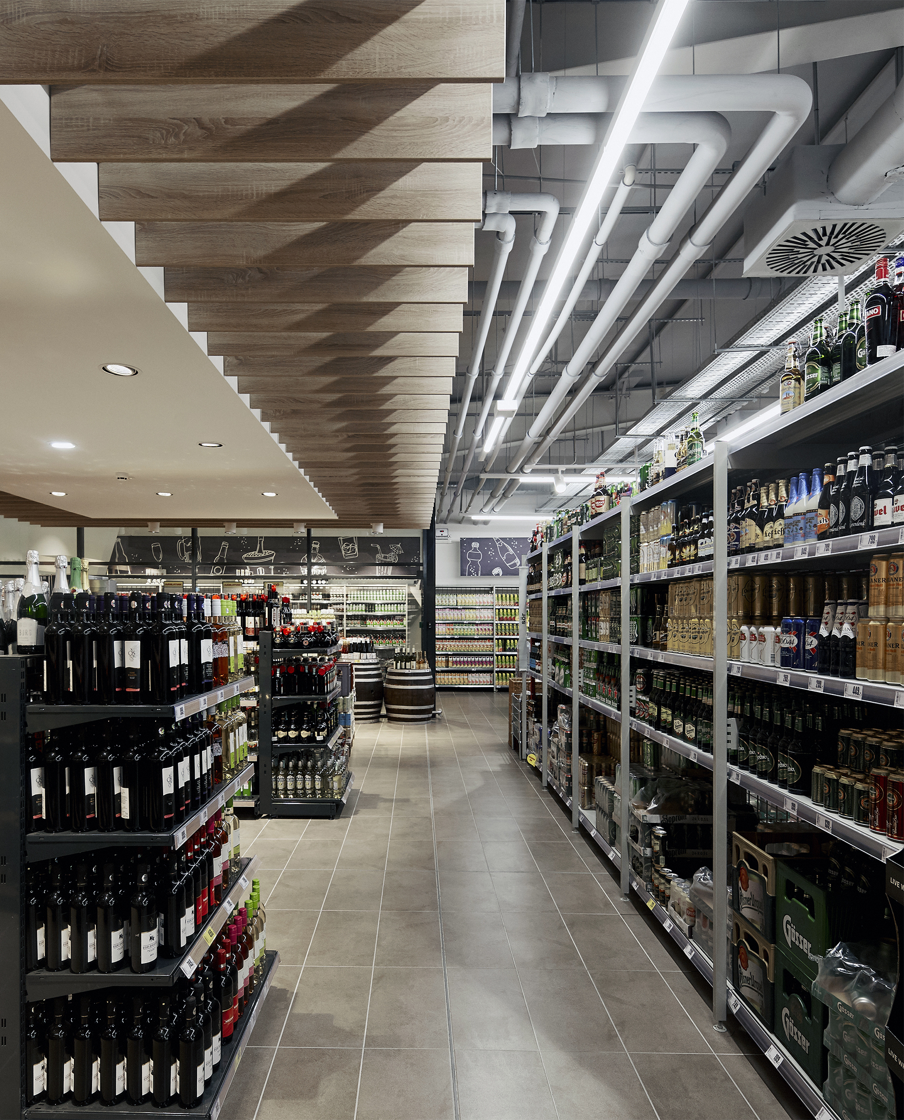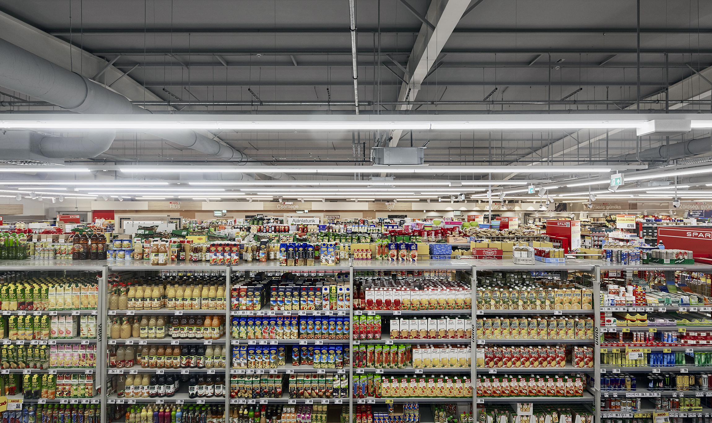 A Kőbányán található szupermarket teljes belső felújításon és átalakításon esett át. A Kerepesi úti parkolóra néző homlokzat korábban tömör volt, most a Spar új trendjeit követve teljes felületen üvegfallal megnyitottuk. A meglévő épület érdekes adottsága, hogy a nagy fesztávot alátámasztás nélkül hordja át a fedélszék, így az impozáns, flexibilis üzlettér könnyedén kialakítható volt benne.