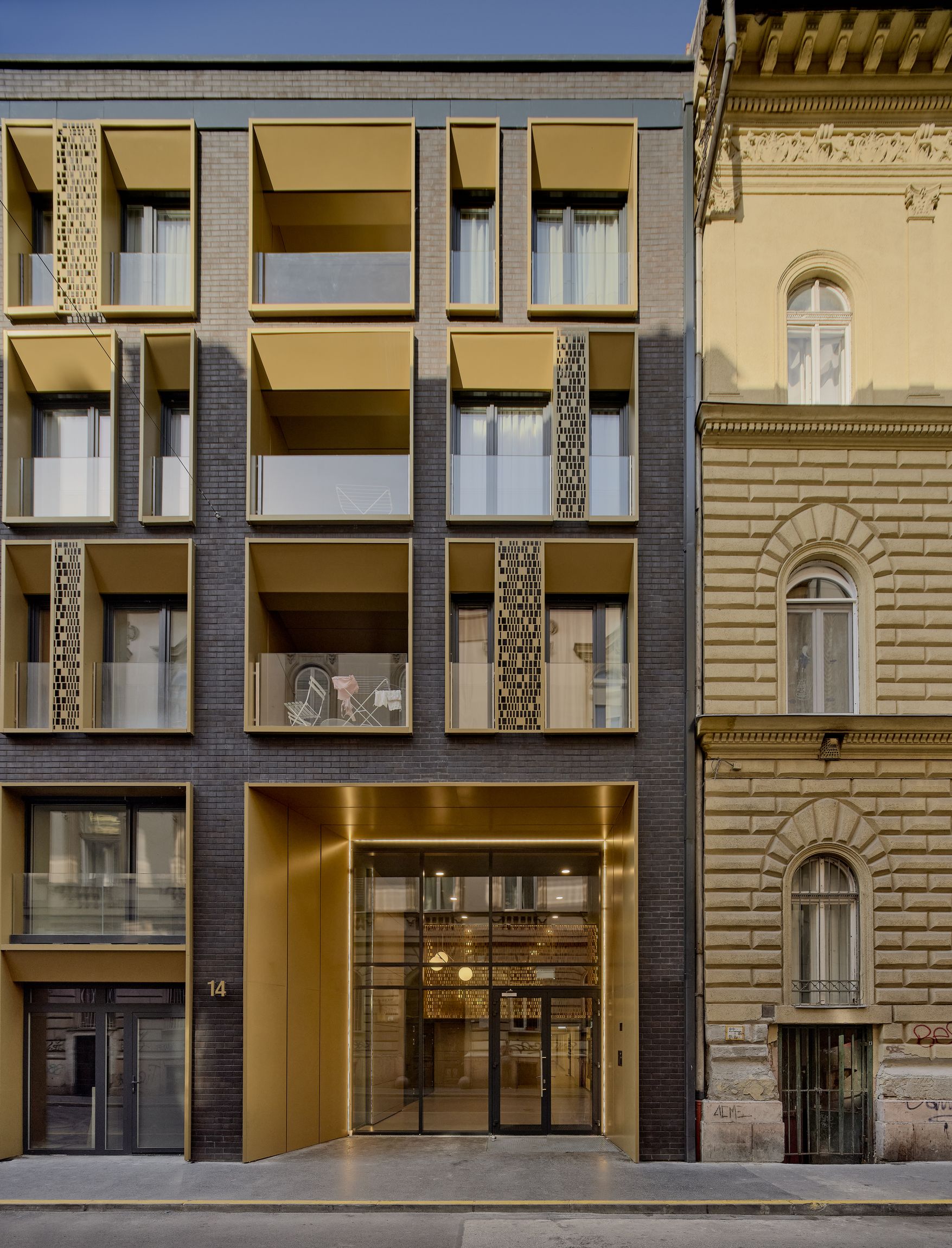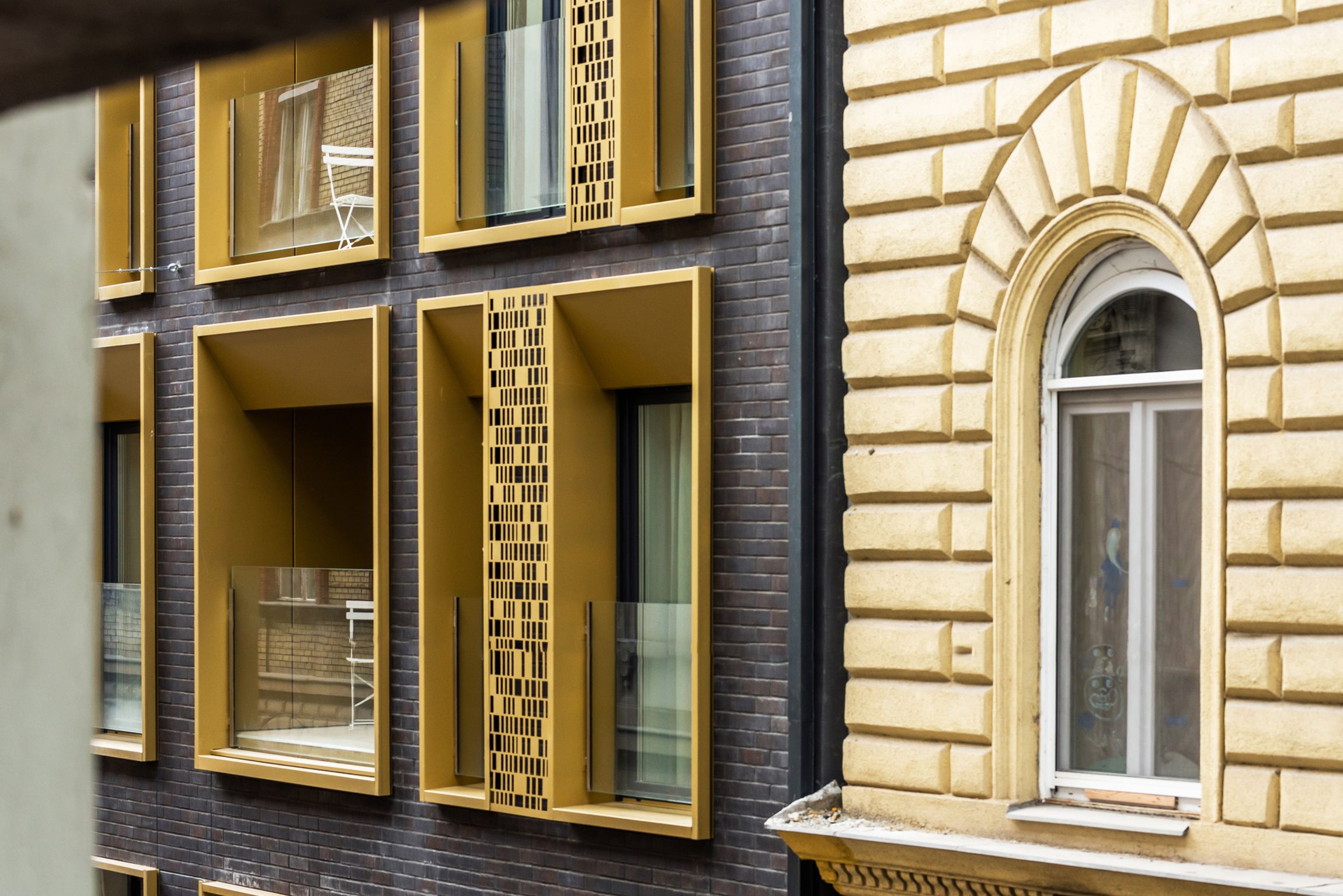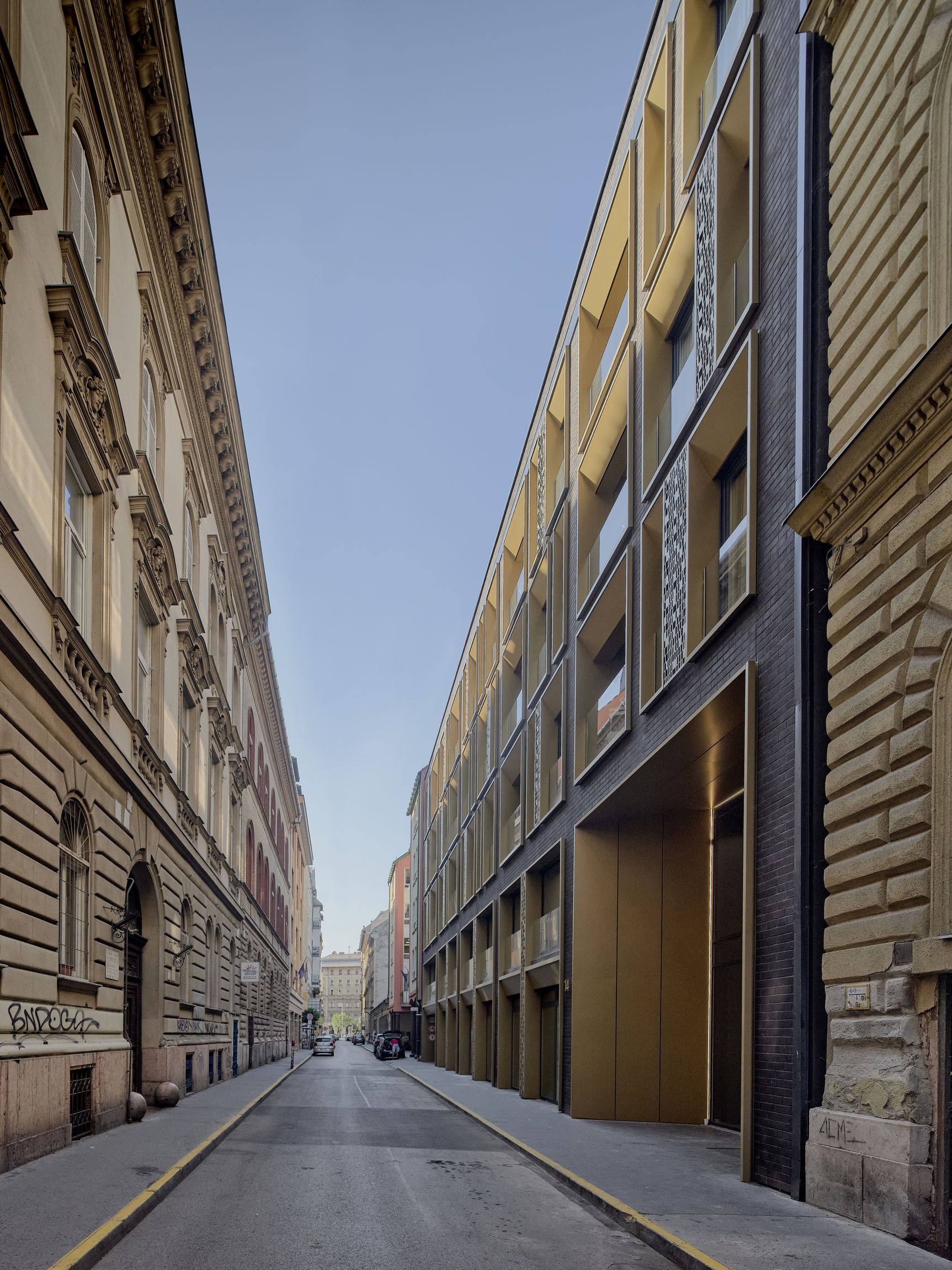 A szűk utcában messziről közelítve az aranyozott hatást keltő, kiugró nyílászárókeretezések dominálnak, így illesztve be az épületet a környezet sárgás tónusaiba. Az arany tisztelgés a foghíj telek múlt századi vasműves múltja előtt. Az épület előtt állva a nagyobb téglafelület hatása már erősebb, mint a keretezés - ez egyfajta játékosságot visz a közeledő látvány feltárulkozásába.