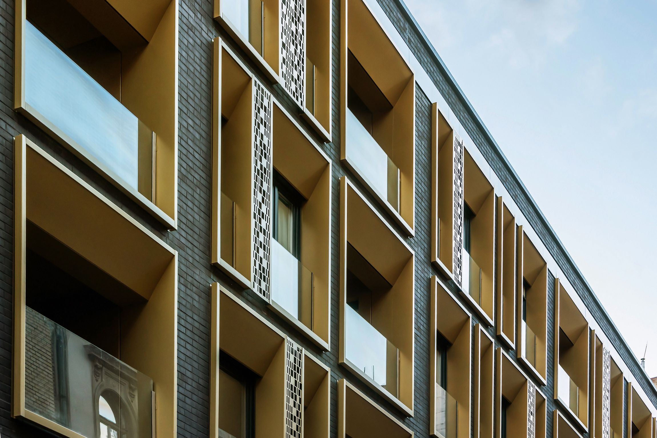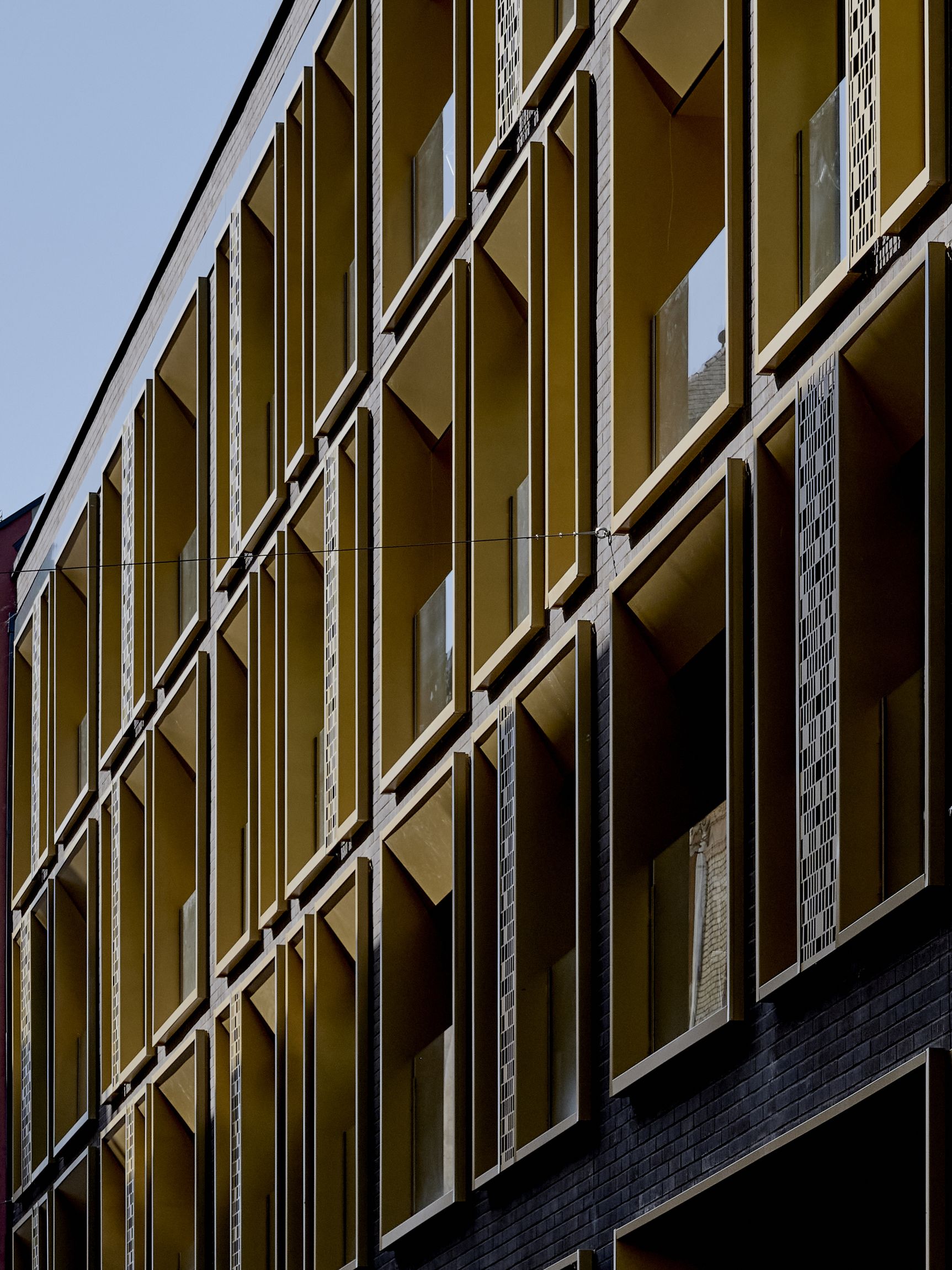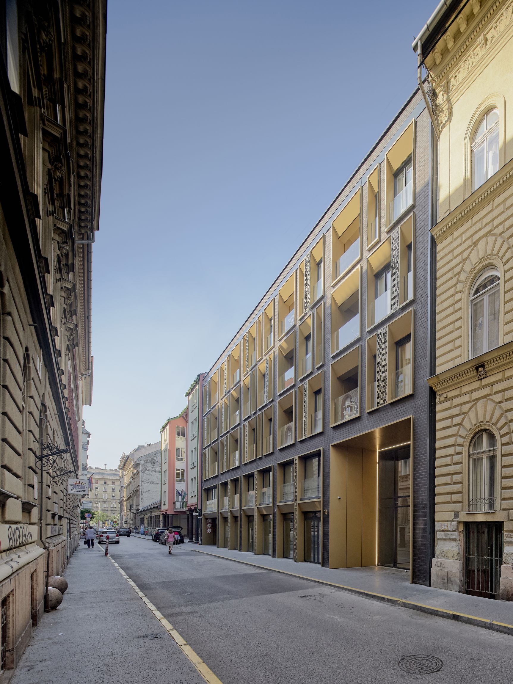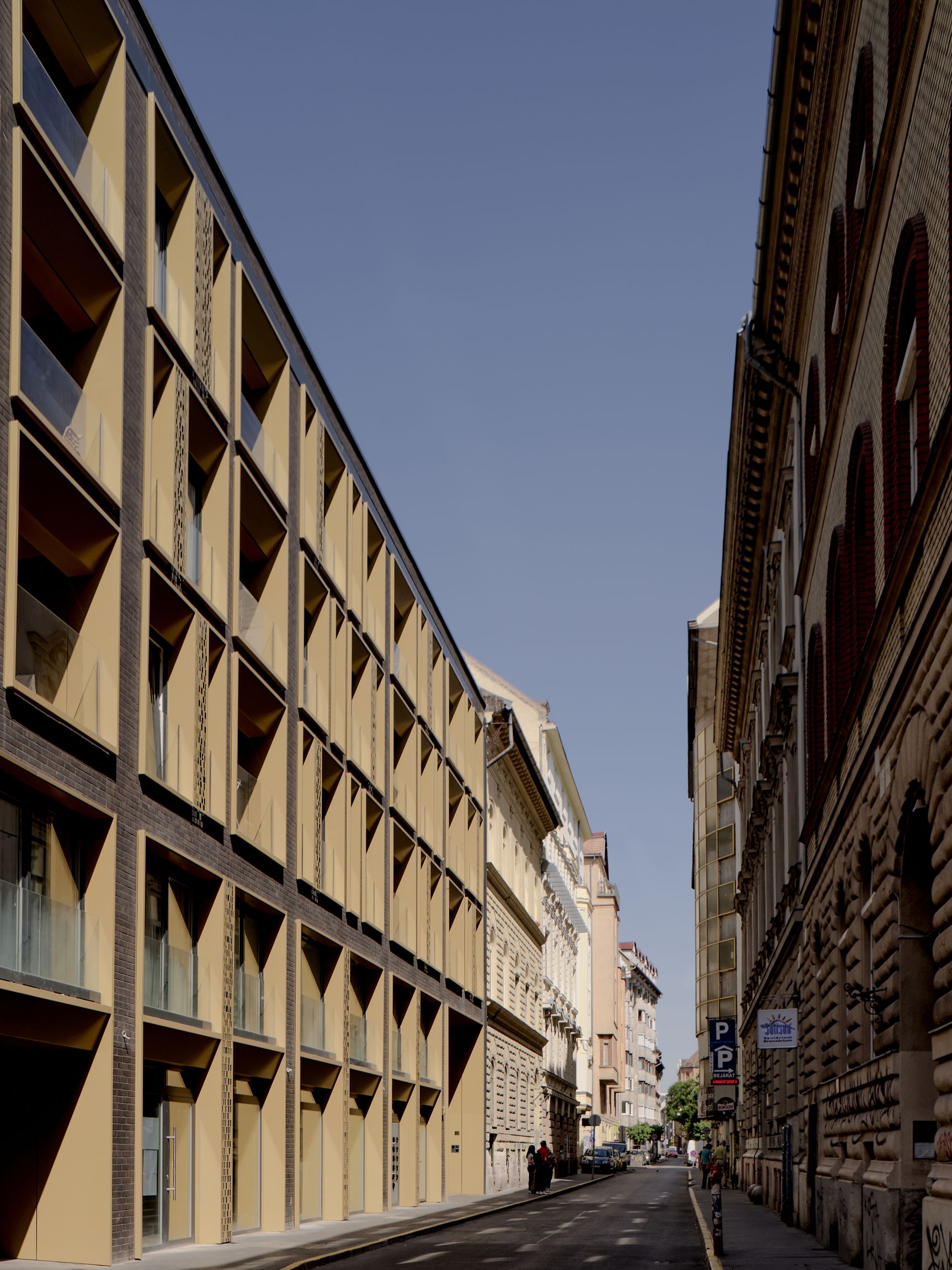 A szűk utcában messziről közelítve az aranyozott hatást keltő, kiugró nyílászárókeretezések dominálnak, így illesztve be az épületet a környezet sárgás tónusaiba. Az arany tisztelgés a foghíj telek múlt századi vasműves múltja előtt. Az épület előtt állva a nagyobb téglafelület hatása már erősebb, mint a keretezés - ez egyfajta játékosságot visz a közeledő látvány feltárulkozásába.