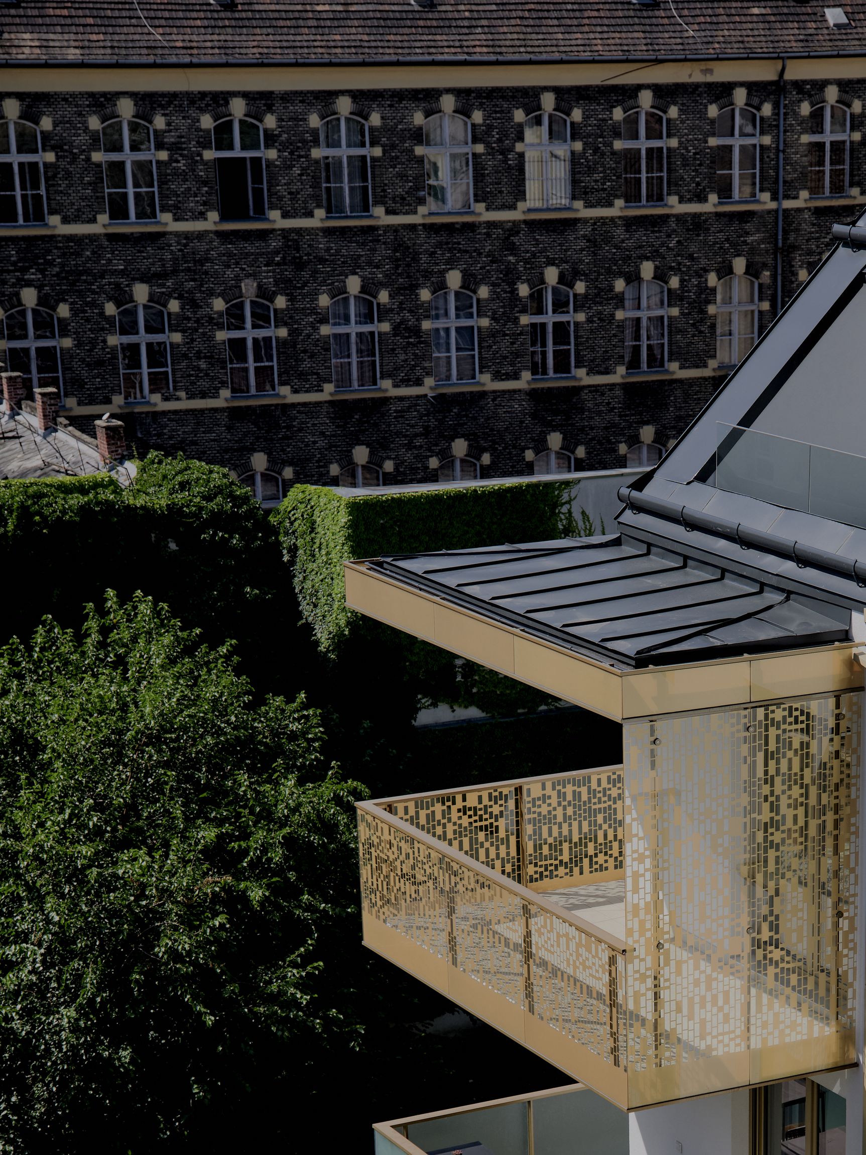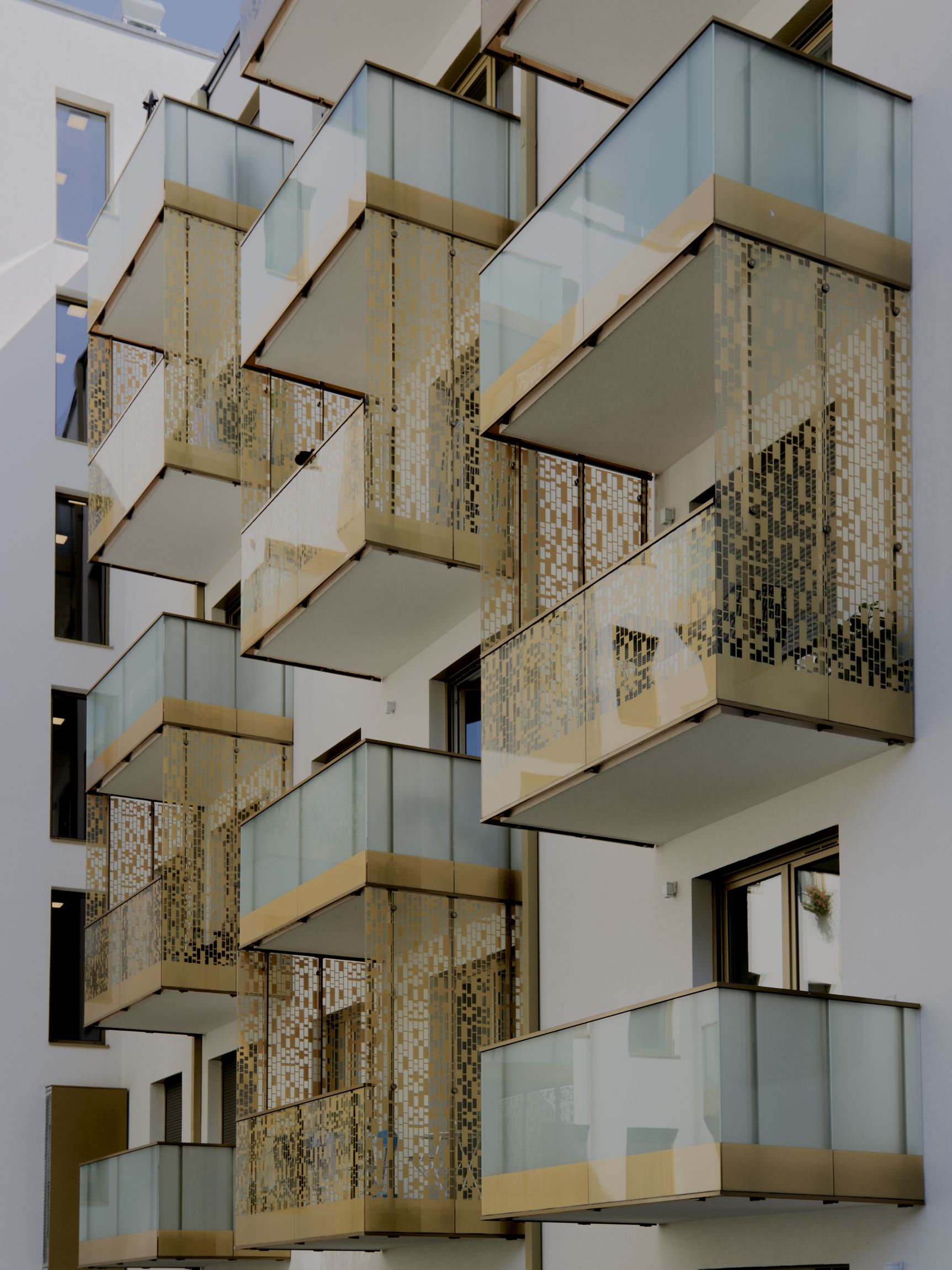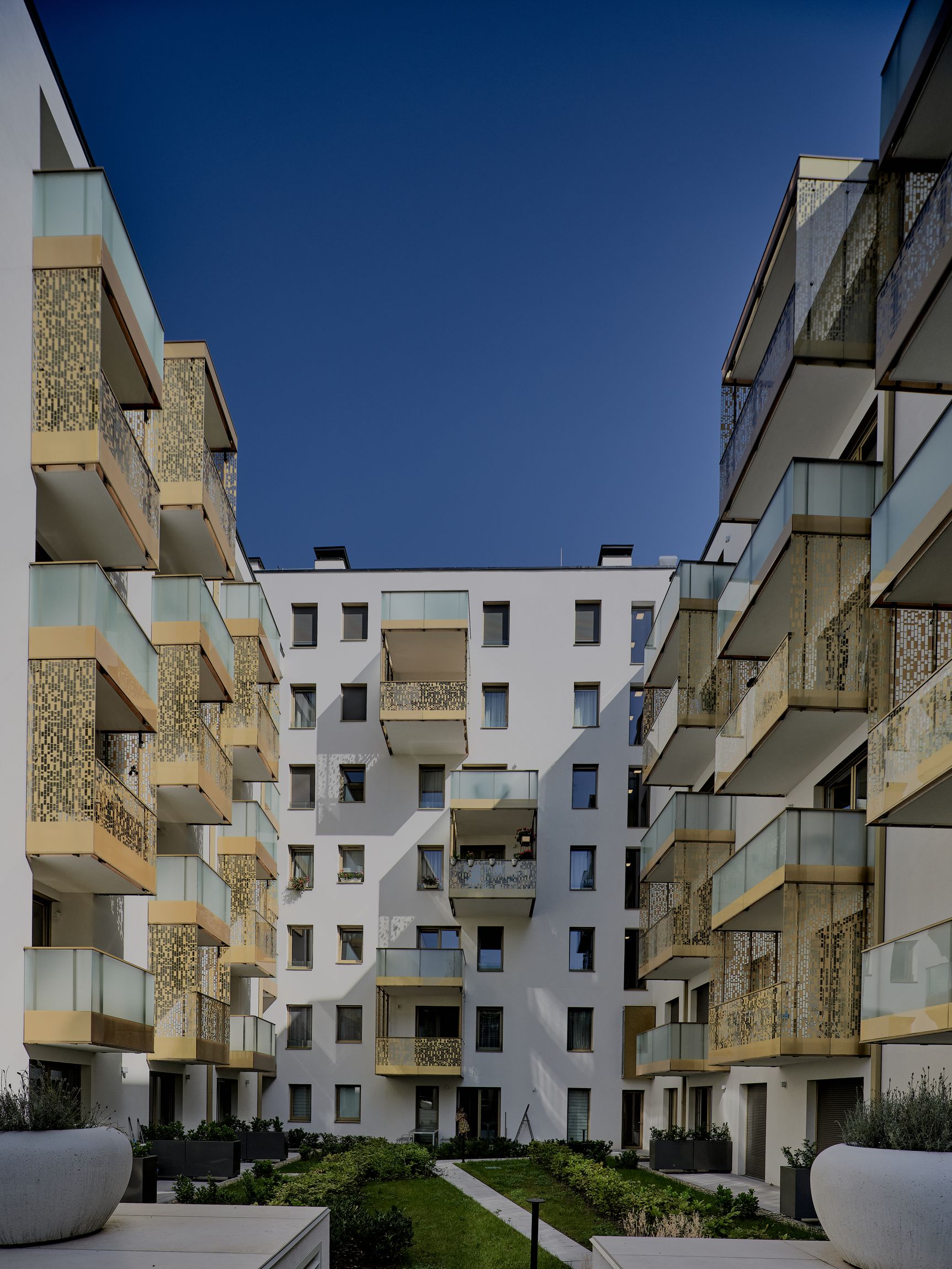 A belső homlokzatok visszafogottabbak. Az egymásra néző, mondhatni „belső udvari” felületek fehérek, világosak, tiszták. Az erkélyek csoportosításán, keretezésén újfent visszaköszön az utcán bevezetett „arany” rácsos motívum, díszítő játékosságot kölcsönözve az udvar megjelenésének, és intimitást biztosítva a szomszédos teraszok használóinak. A hátsó homlokzat a vele szemközt álló épület szabályos homlokzata felé tisztelettel fordul, rendezett, feszes képet mutat.
