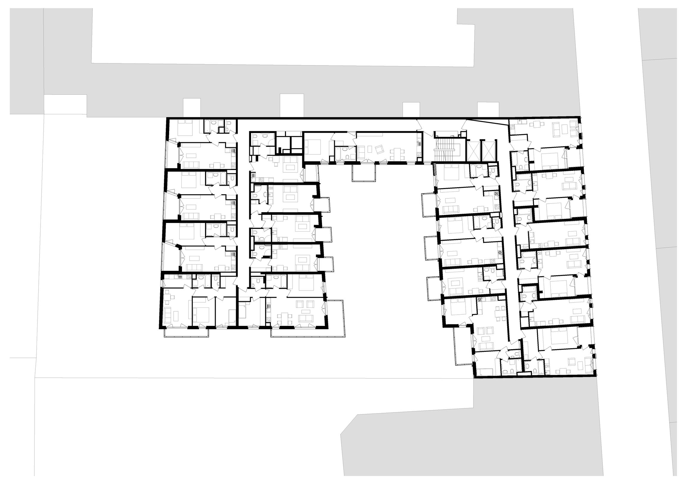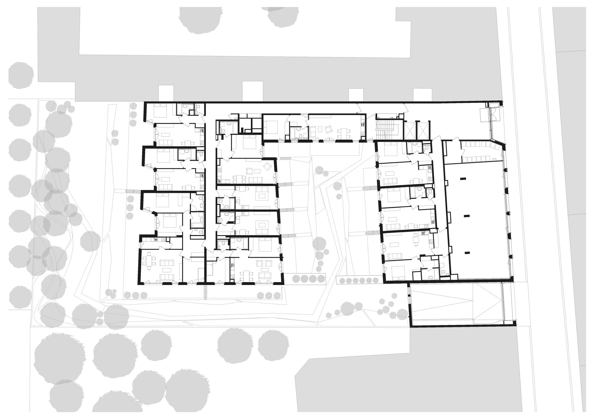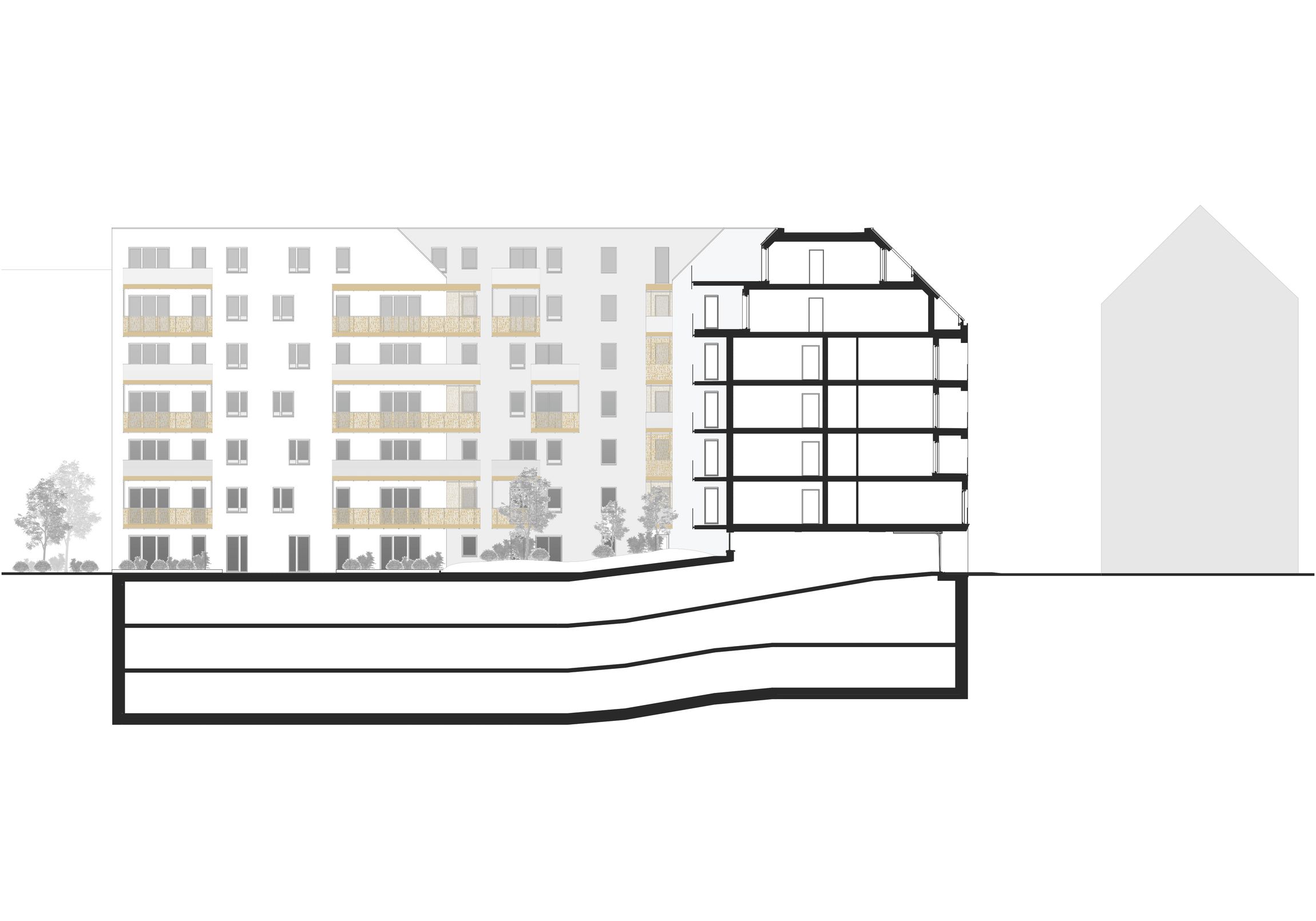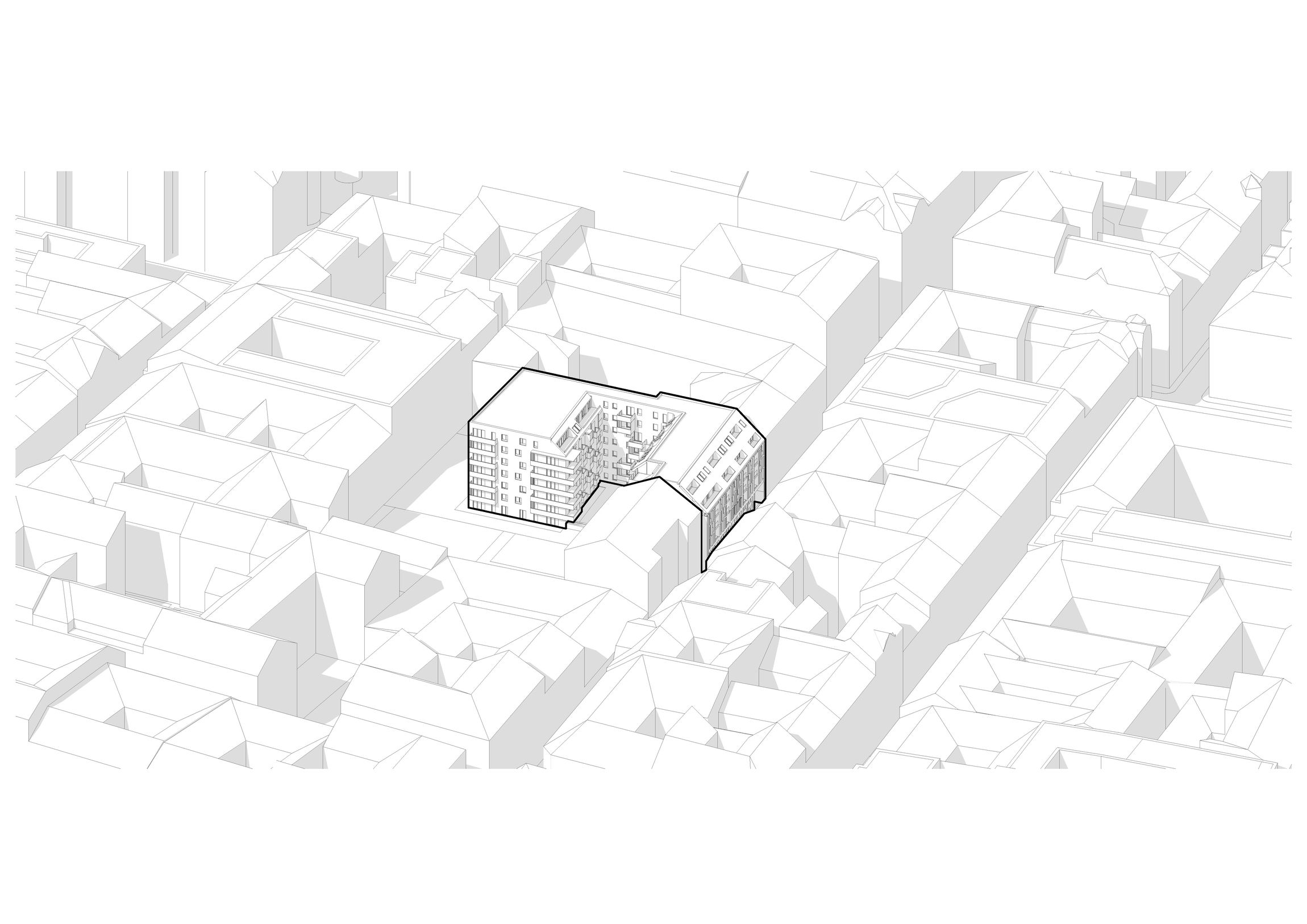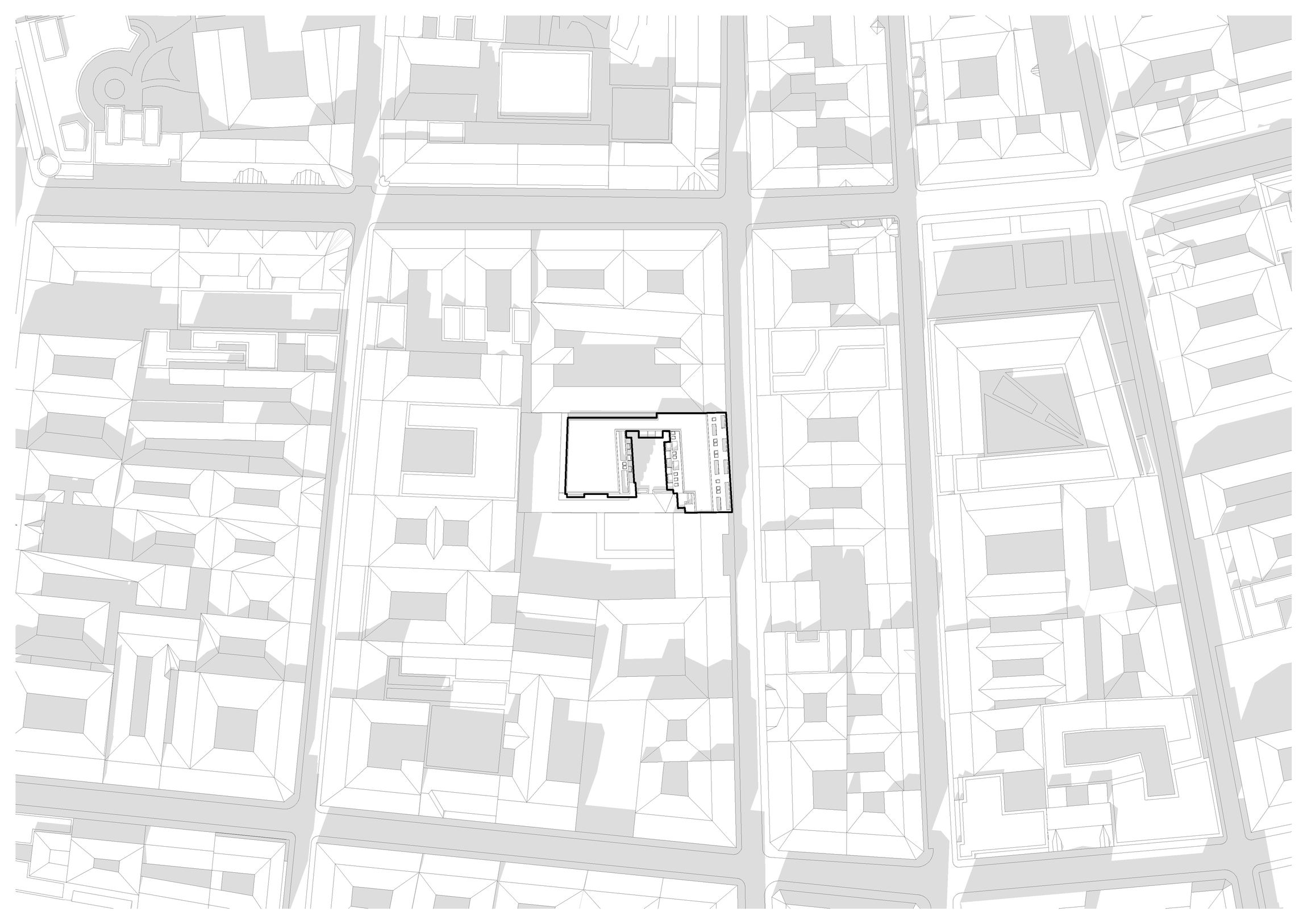 A beépítés ezeket a jó adottságokat aknázza ki. Az utca felől az épület természetesen betartja a zártsorú beépítés klasszikus játékszabályait, és felveszi a csatlakozó szomszédos homlokzat magasságát, követi tetőformáját. A beépítés a telek mélysége felé haladva végig letakarja az északi telekhatáron magasodó hatalmas, elhanyagolt tűzfalat. A többi épületrész mind a napfény és a zöld felé fordul, egy délről nyitott udvart keretez meg a fő tömeg, és hátrafelé is kertre néz.