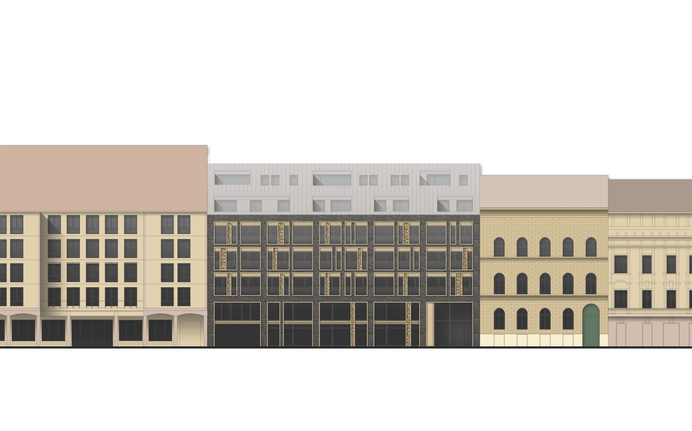 A köztérre néző főhomlokzatokon mindig szabályos hálós szerkesztés figyelhető meg, a nyílászárók és párkányok, tagozatok rendjei harmonikus arányokkal igazodnak egymáshoz, a vertikális és horizontális tengelyek tiszta képletet alkotnak. Mi ezt igyekeztünk megragadni és lefordítani a huszonegyedik század nyelvére. Horizontális értelemen folytattuk az utcai szomszéd földszinti párkányvonalát, mely esetünkben a földszinti és első emeleti nyílásokat fogja össze egy magasított lábazati kompozícióba. A szomszédos zárópárkány magasságában mi is lezártuk felülről a mi felületünket.