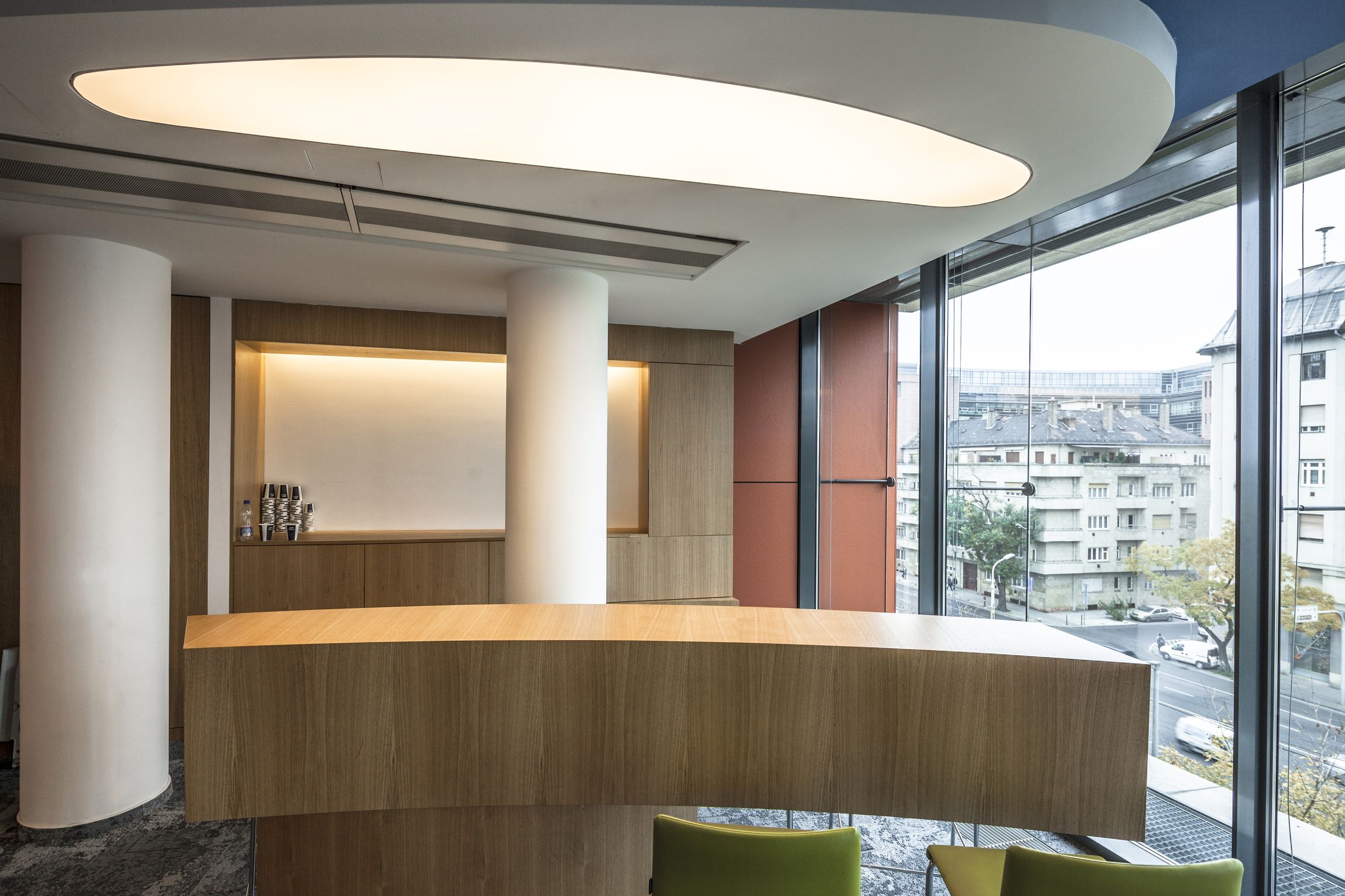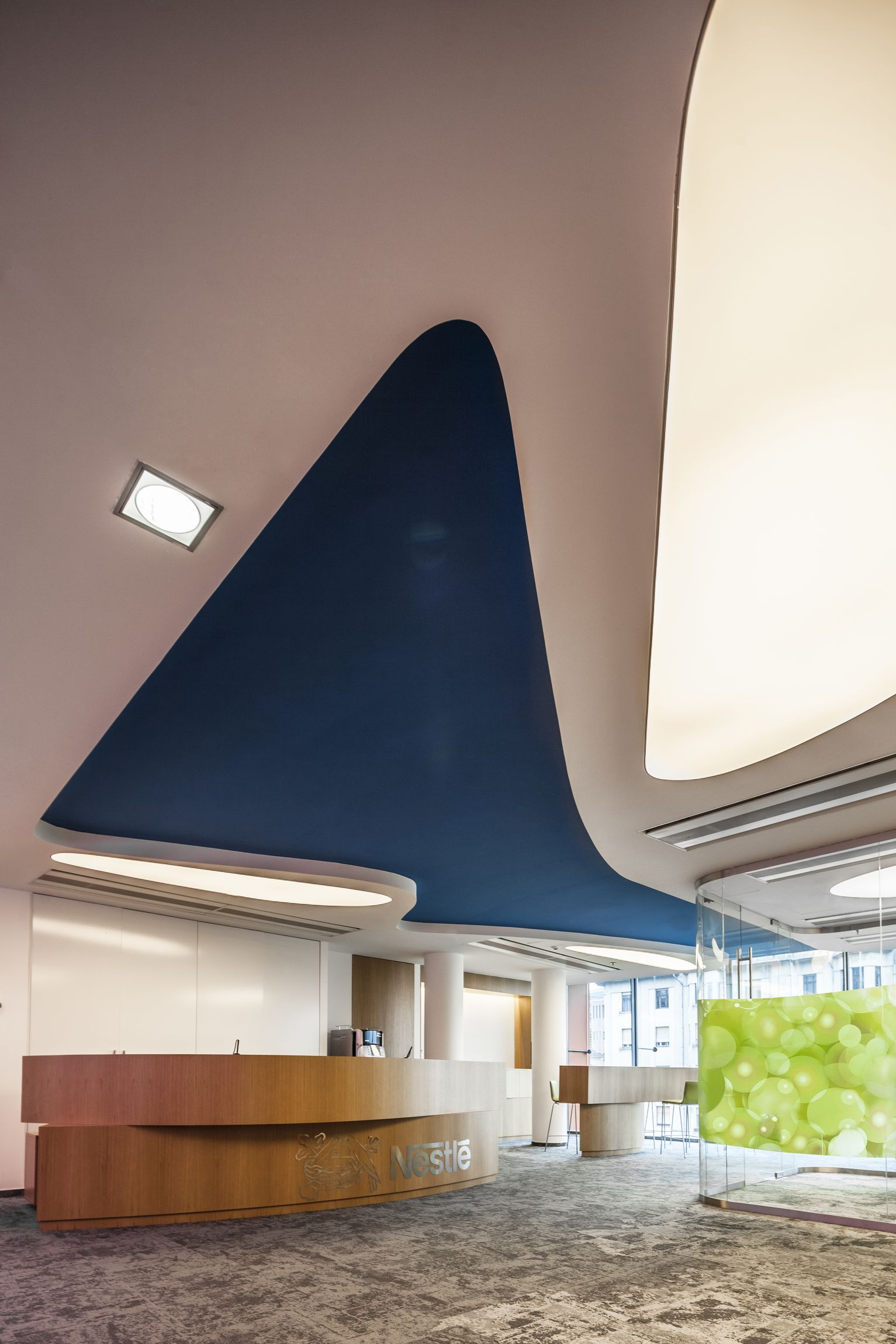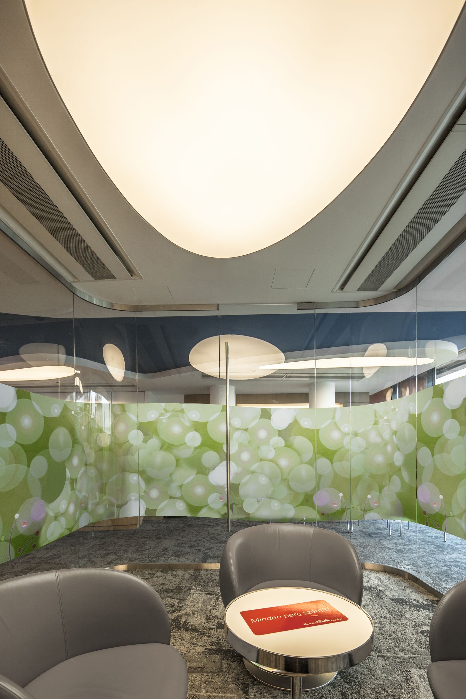 Természeti alapformákból kiindulva terveztük meg a Nestlé budapesti irodájának lobby helyiségét, és a kisebb meeting szobákat is magukba foglaló tereket.