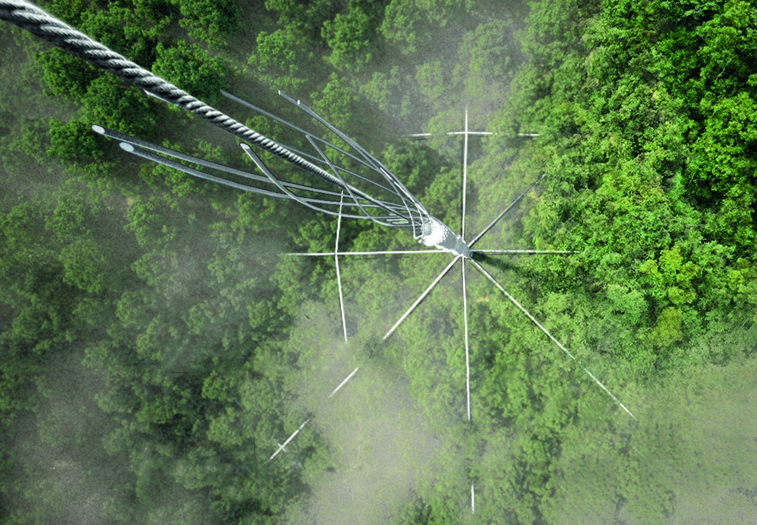 Ahhoz, hogy a torony magasabb lehessen, és kis alapterületet használjunk fel az alapozáshoz, az űrből érkezik a segítség, speciális fix pályán „mozgó” műholdhoz rögzítjük a felhőkarcolót felülről, mely műhold folyamatos erőt fejt ki a Földtől való távolodáshoz.