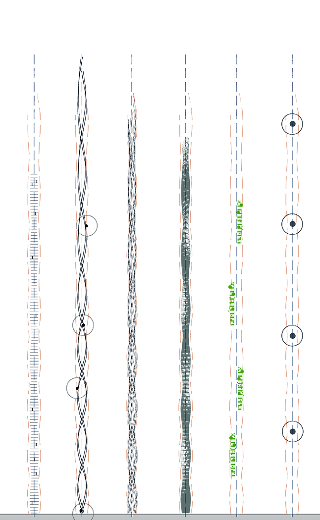 Az épület homlokzata úgy épül fel, mint az emberi bőr, több rétege van, és minden rétegnek van funkciója. A legvaskosabb elem a teherhordó szerkezet, mely több egymásba kapaszkodó spirális elemből tevődik össze, a szél- és az önteher hordására és szétosztására. A tervezés során a kontúrt szélcsatorna kísérletekkel lehet optimálisra formázni.