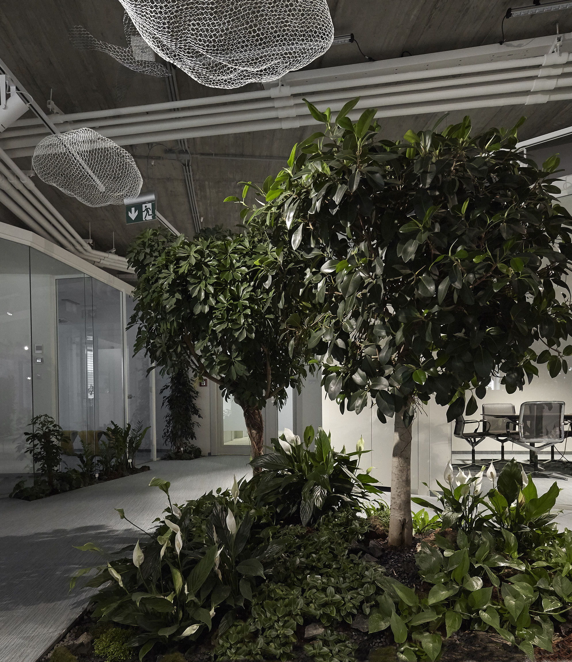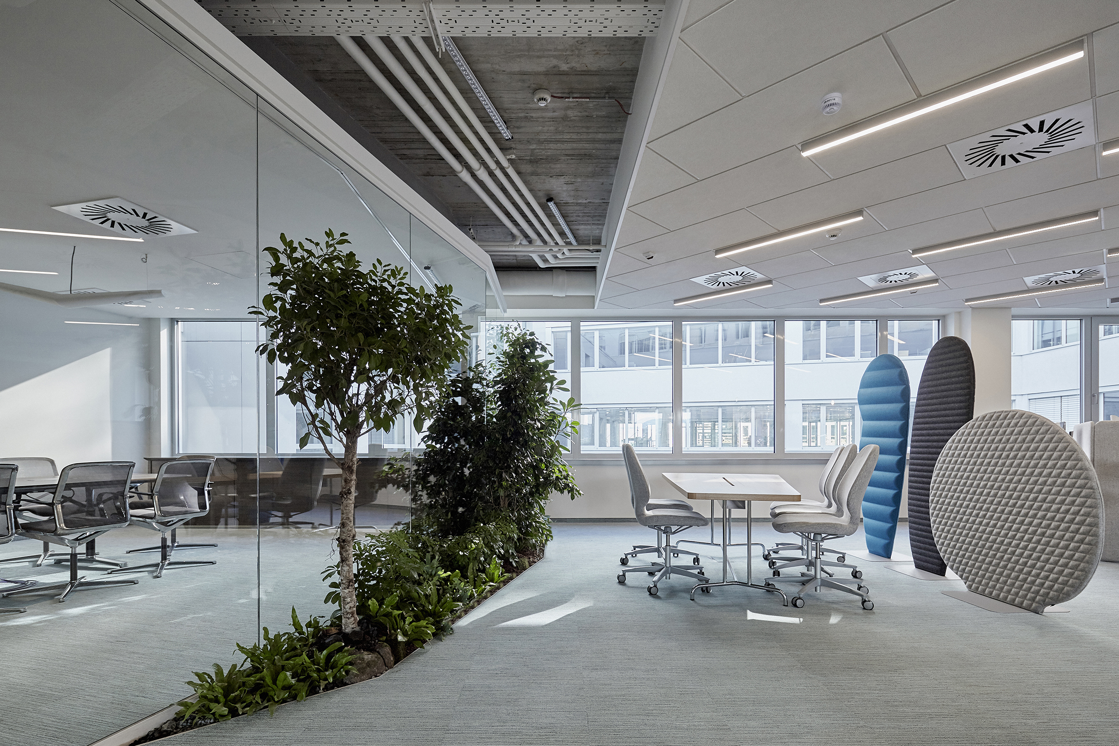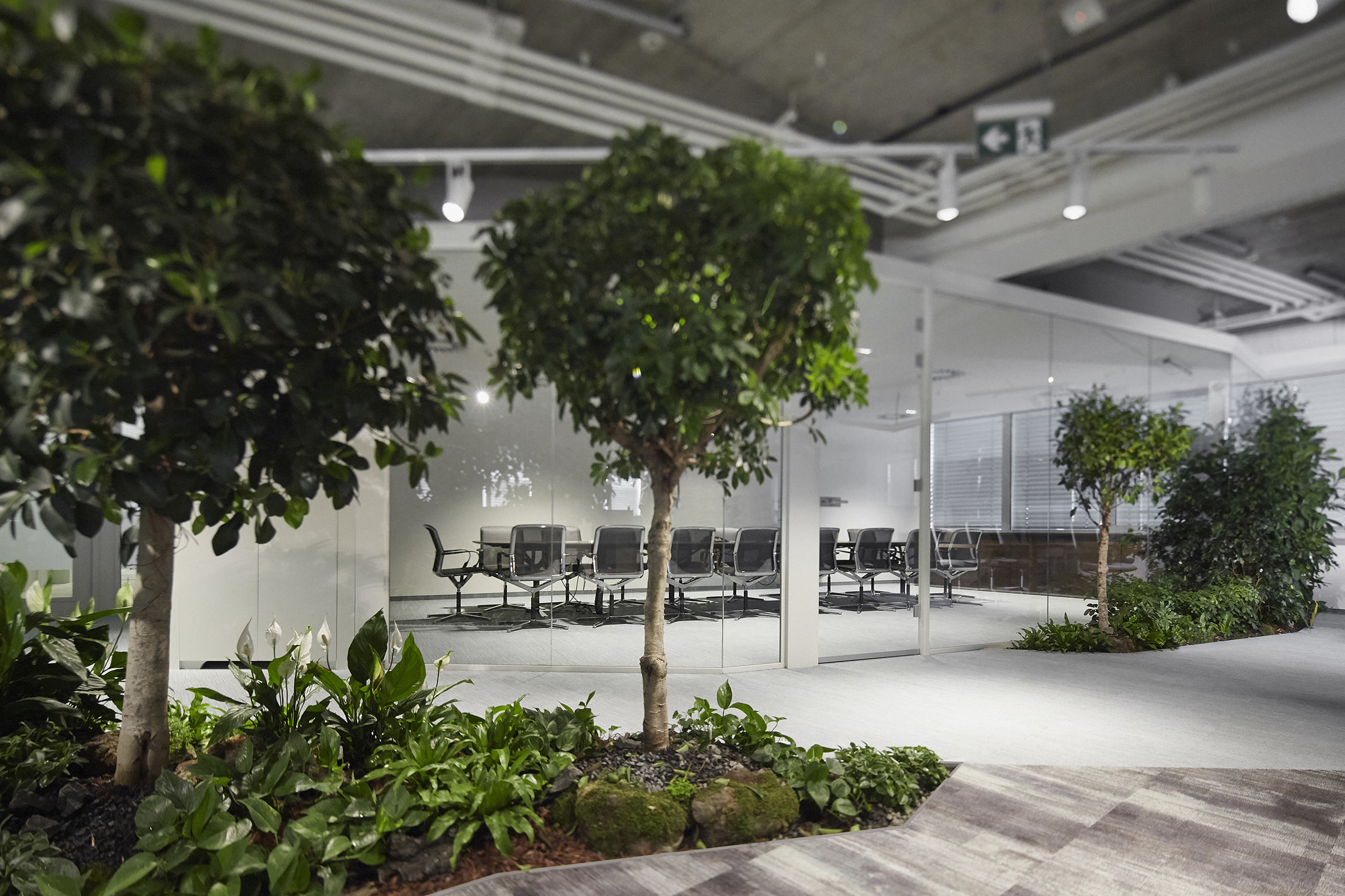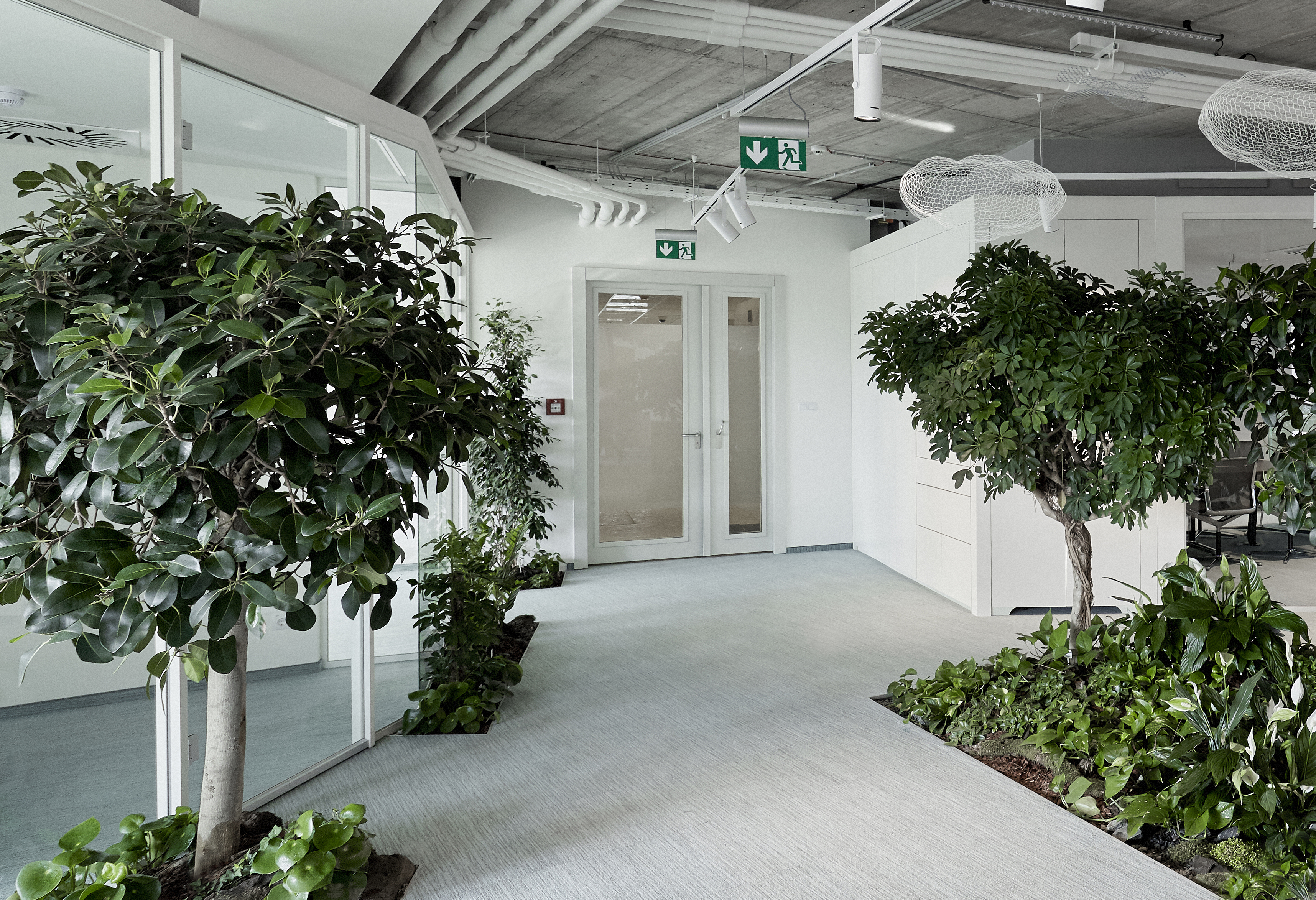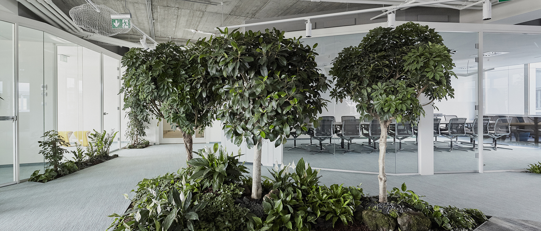 A tér tagolásához nem használtunk falakat, vagy nagyméretű paravánokat, hanem a land art eszközéhez nyúltunk. Skanska elkötelezett a fenntartható fejlődés mellett, ezt, itt a belsőbe telepített növényzet is alátámasztja.