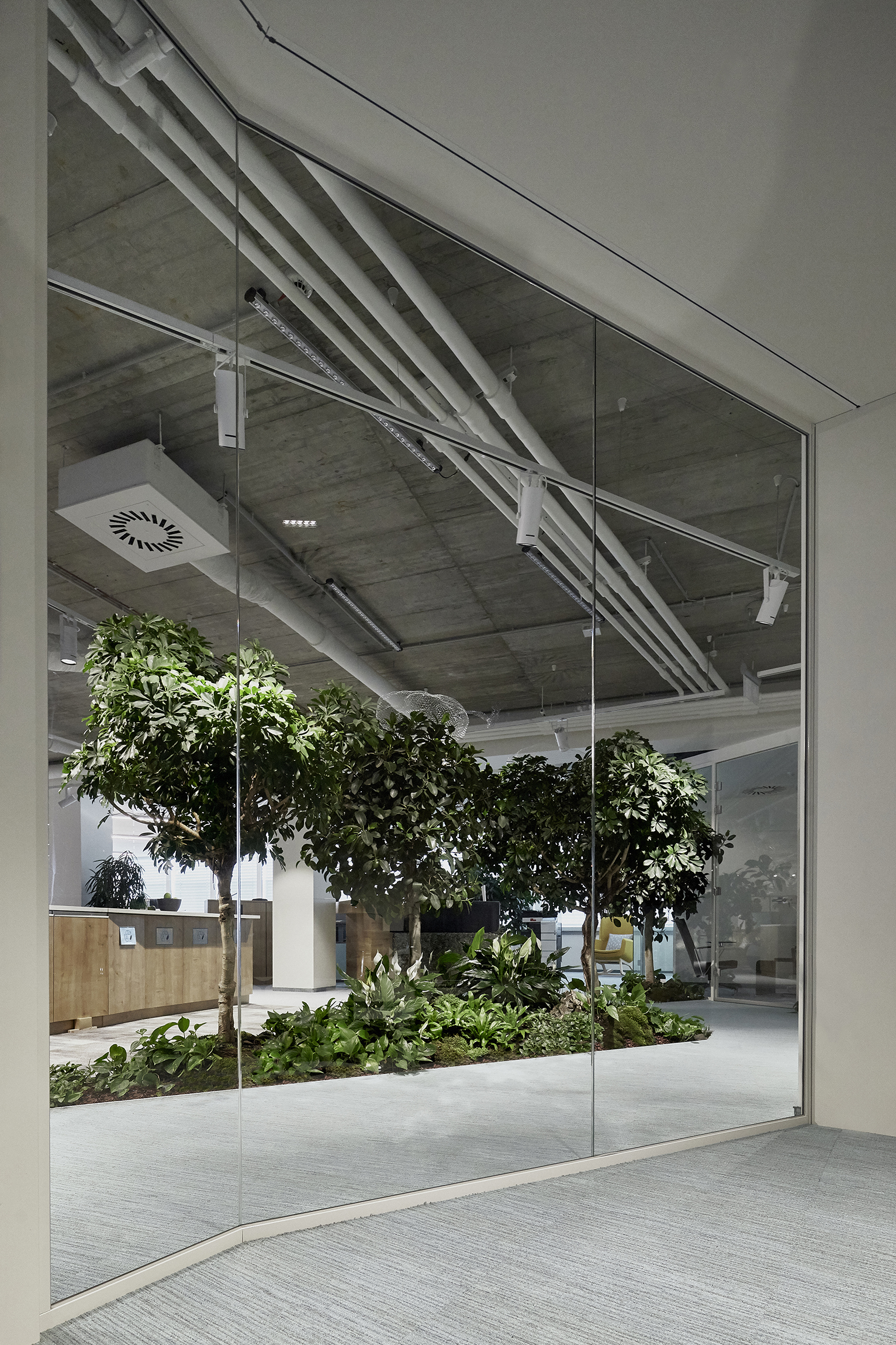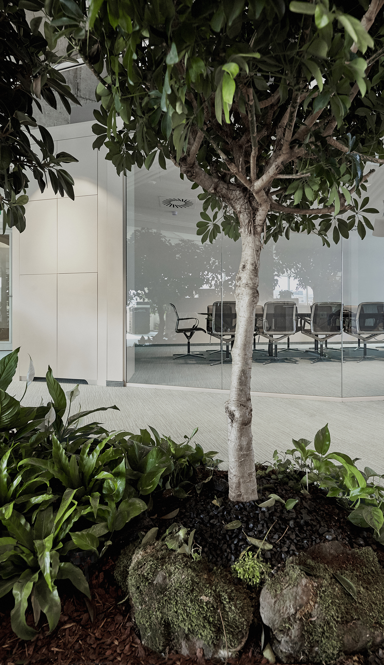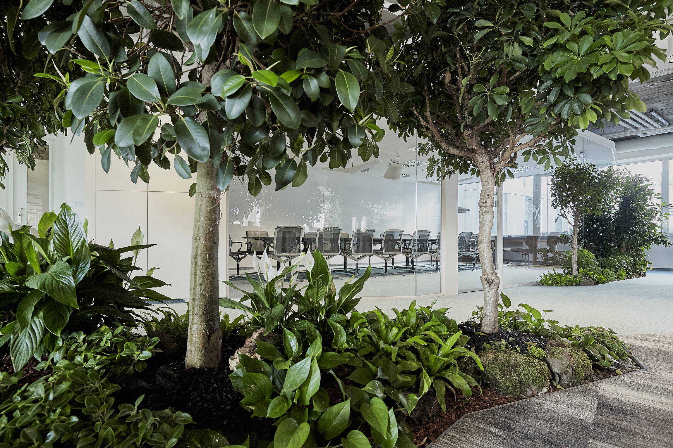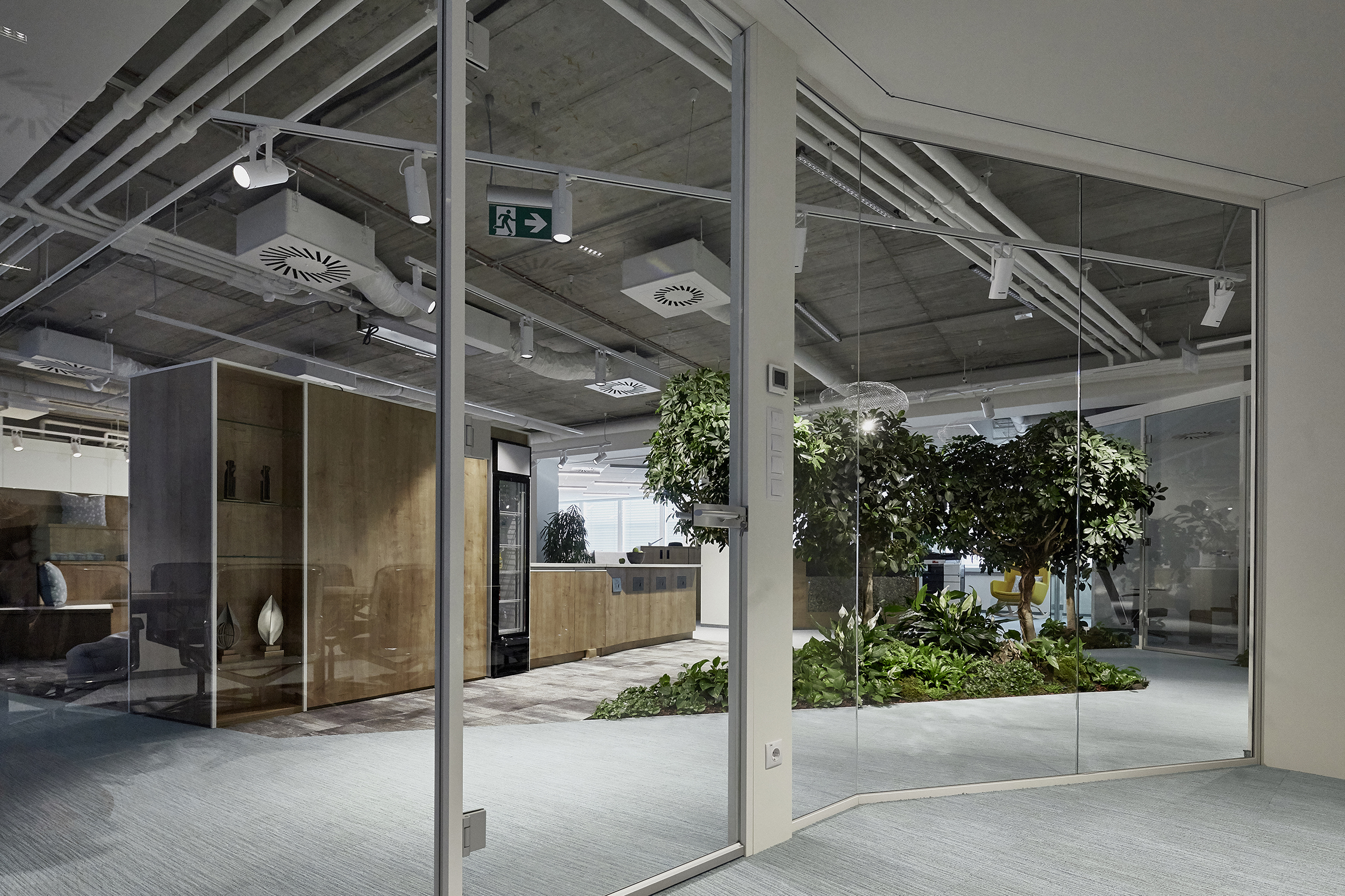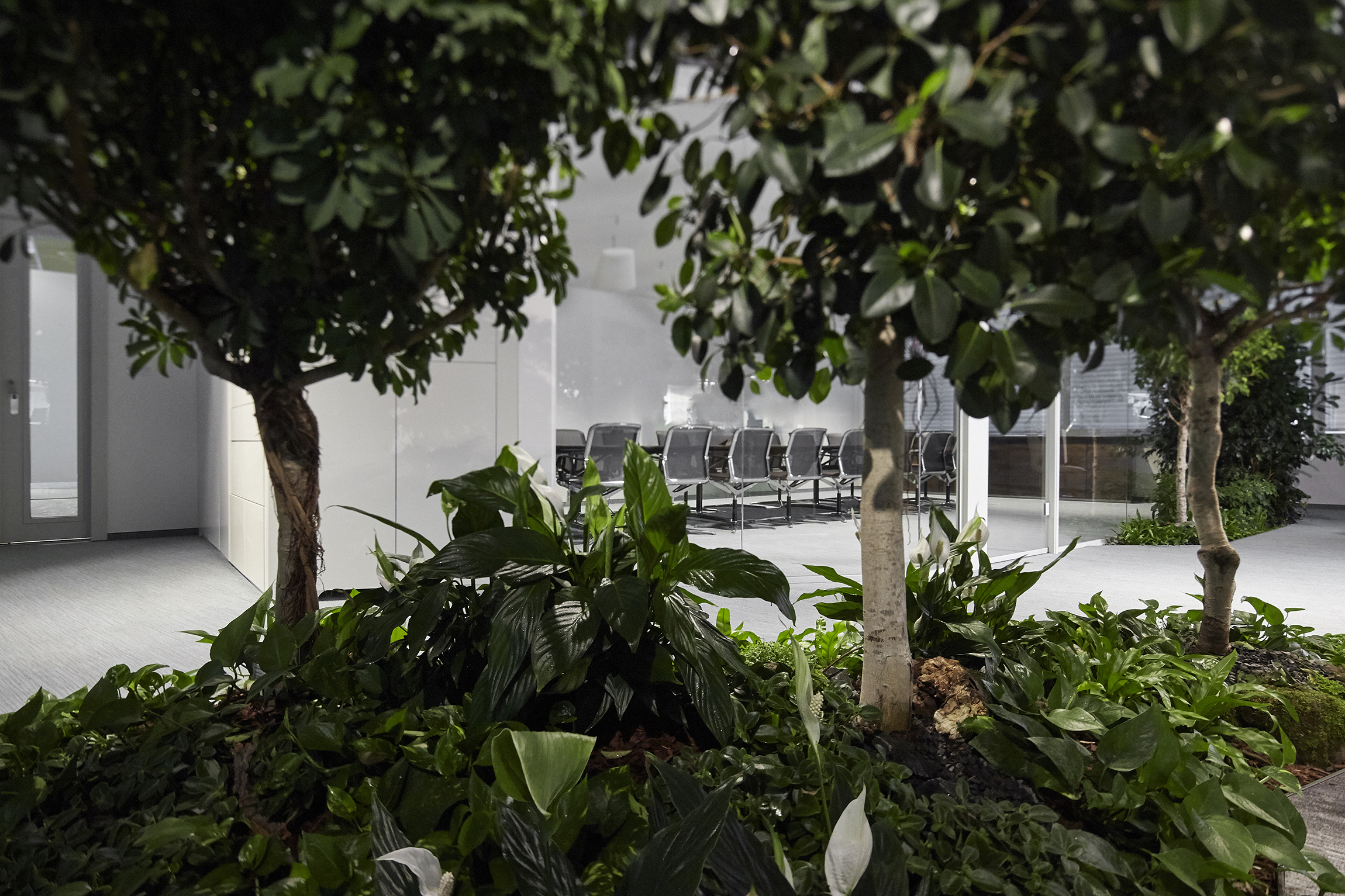 A tér tagolásához nem használtunk falakat, vagy nagyméretű paravánokat, hanem a land art eszközéhez nyúltunk. Skanska elkötelezett a fenntartható fejlődés mellett, ezt, itt a belsőbe telepített növényzet is alátámasztja.
