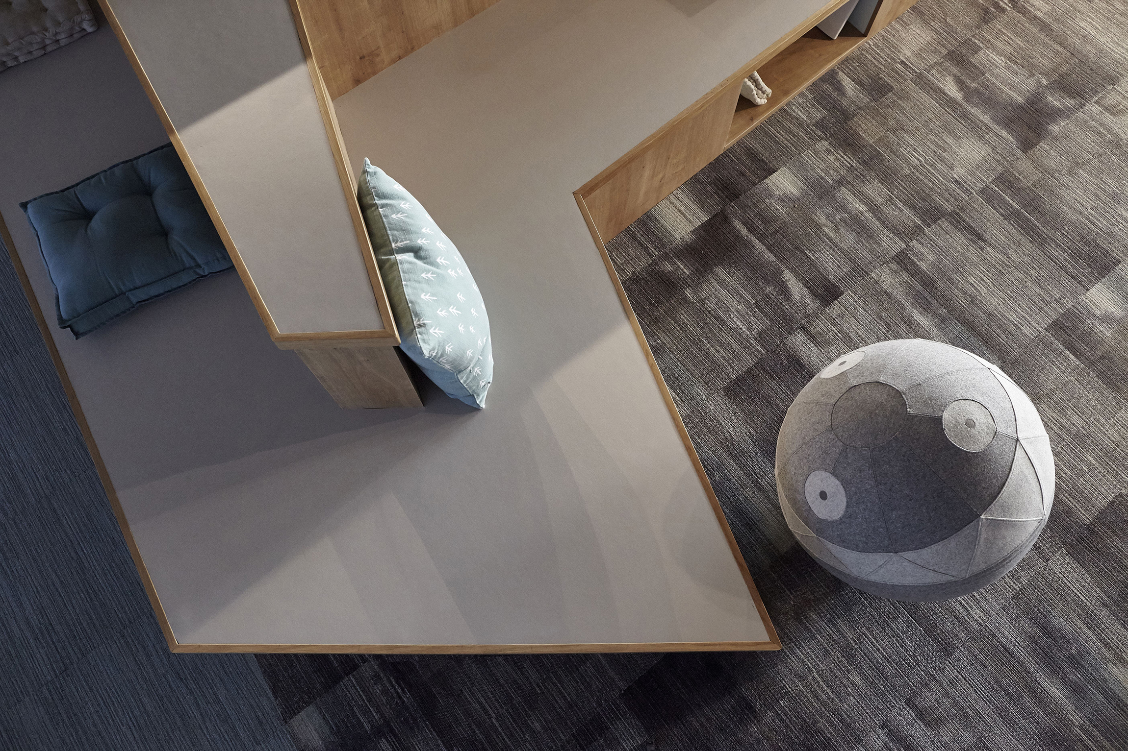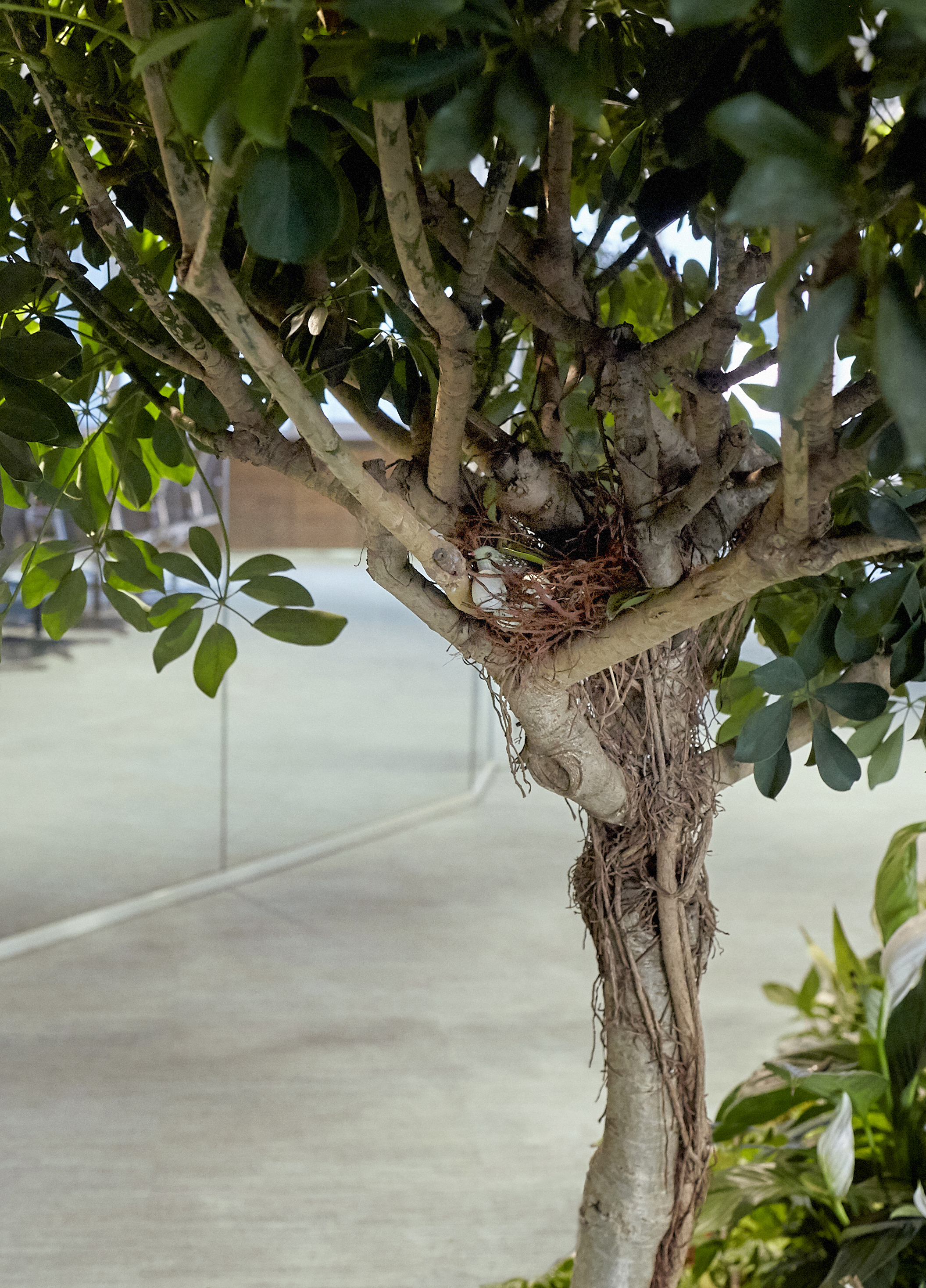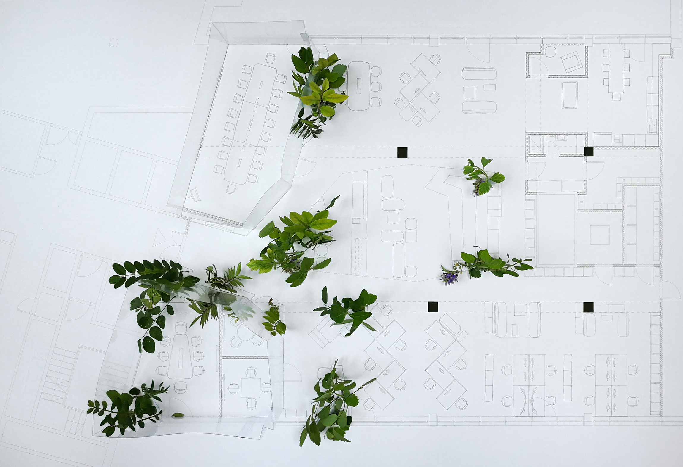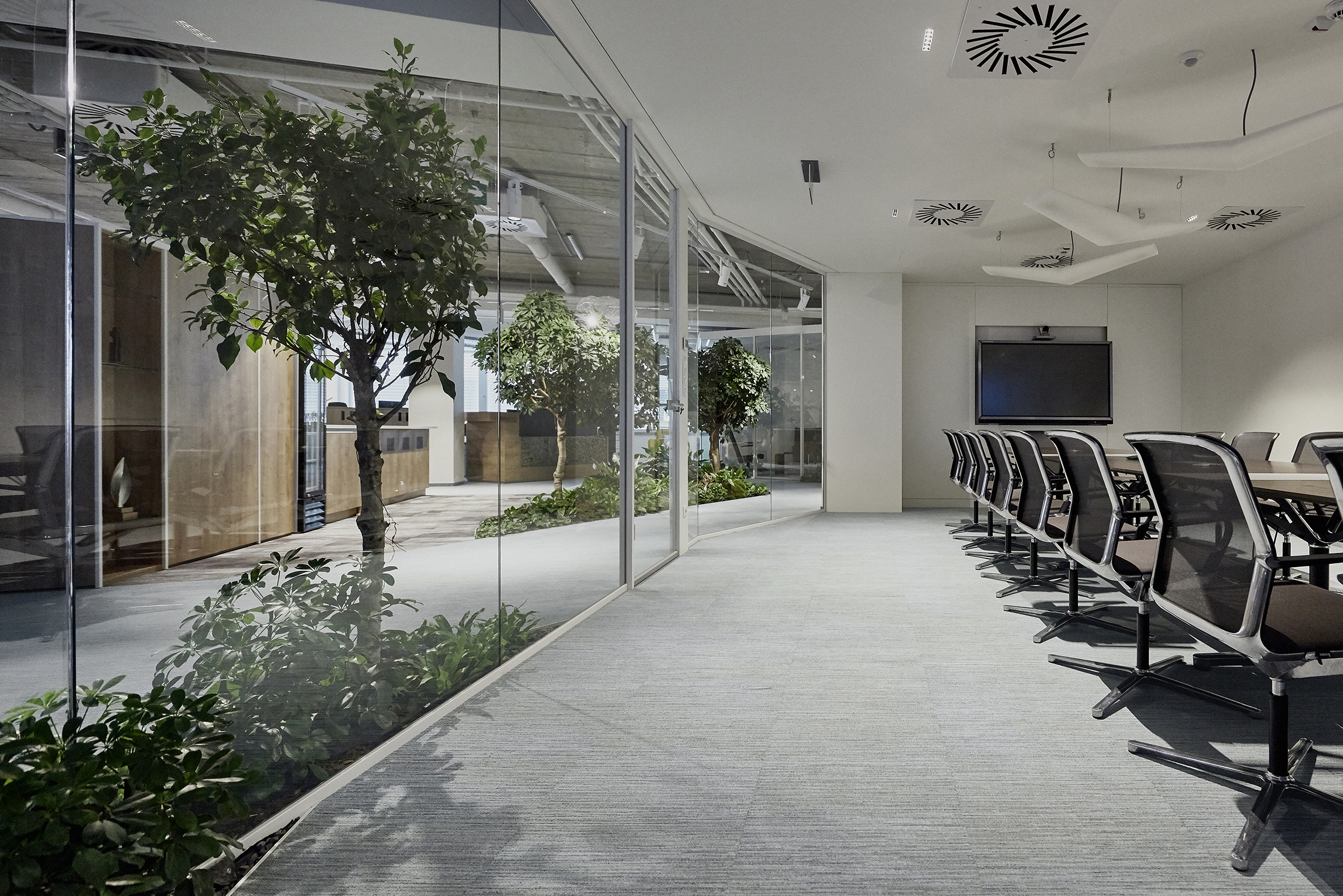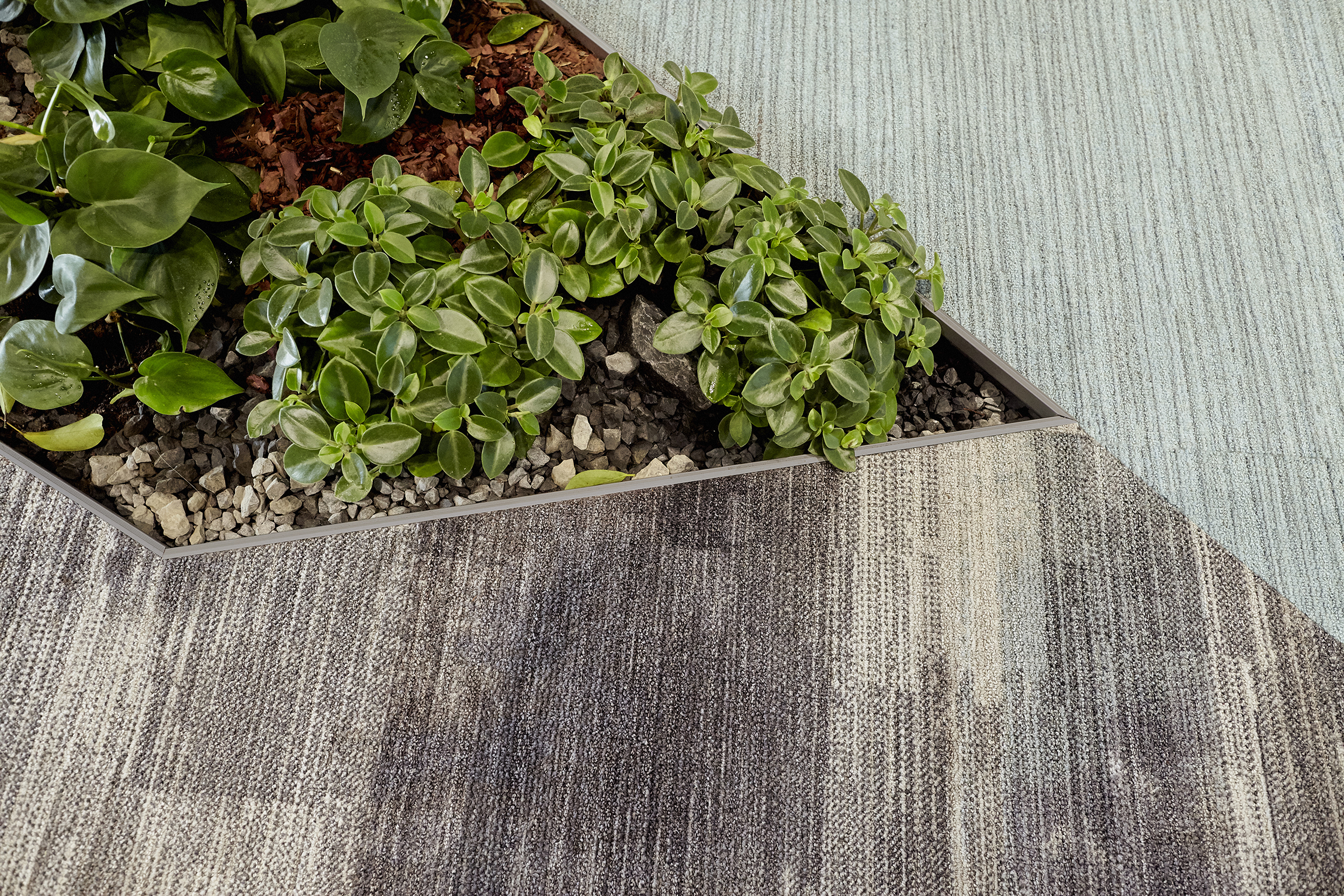 A tér tagolásához nem használtunk falakat, vagy nagyméretű paravánokat, hanem a land art eszközéhez nyúltunk. Skanska elkötelezett a fenntartható fejlődés mellett, ezt, itt a belsőbe telepített növényzet is alátámasztja.