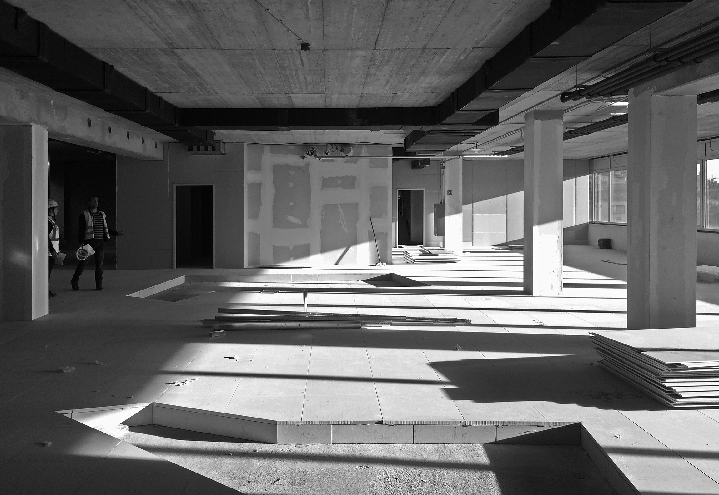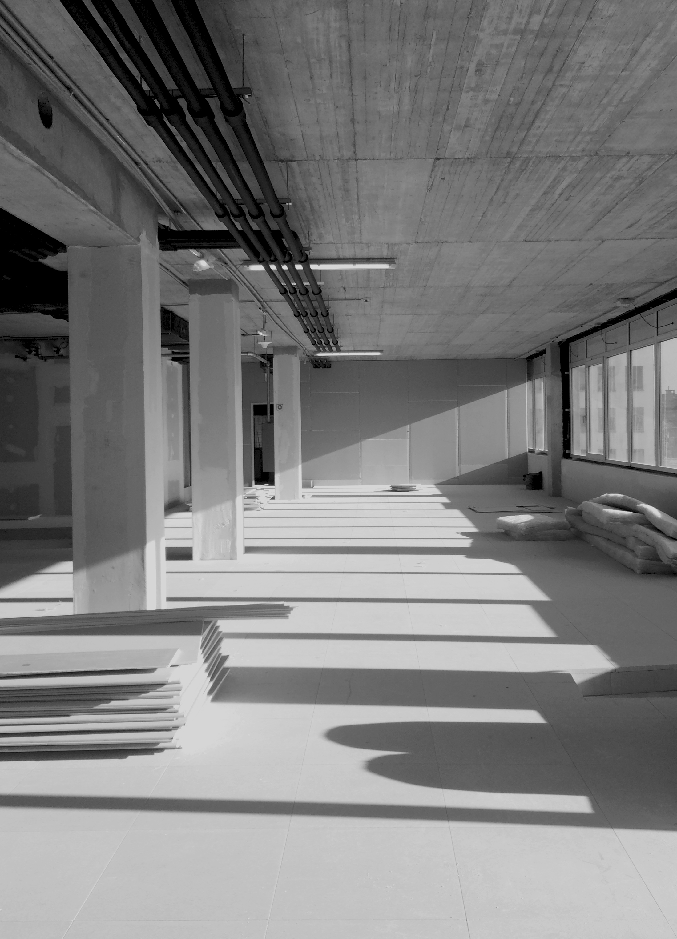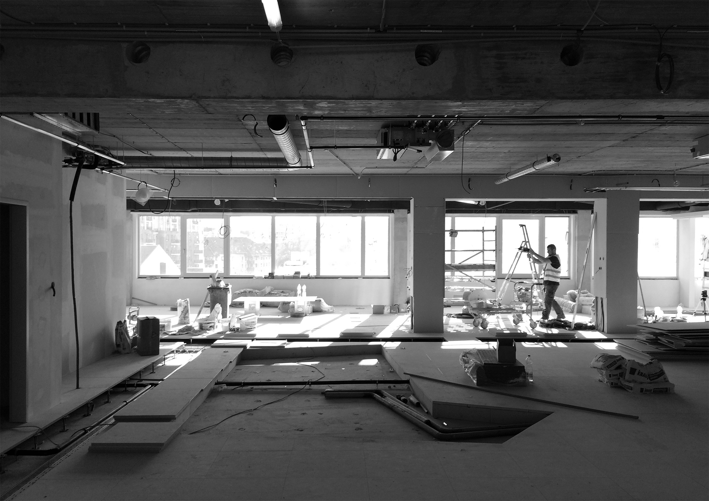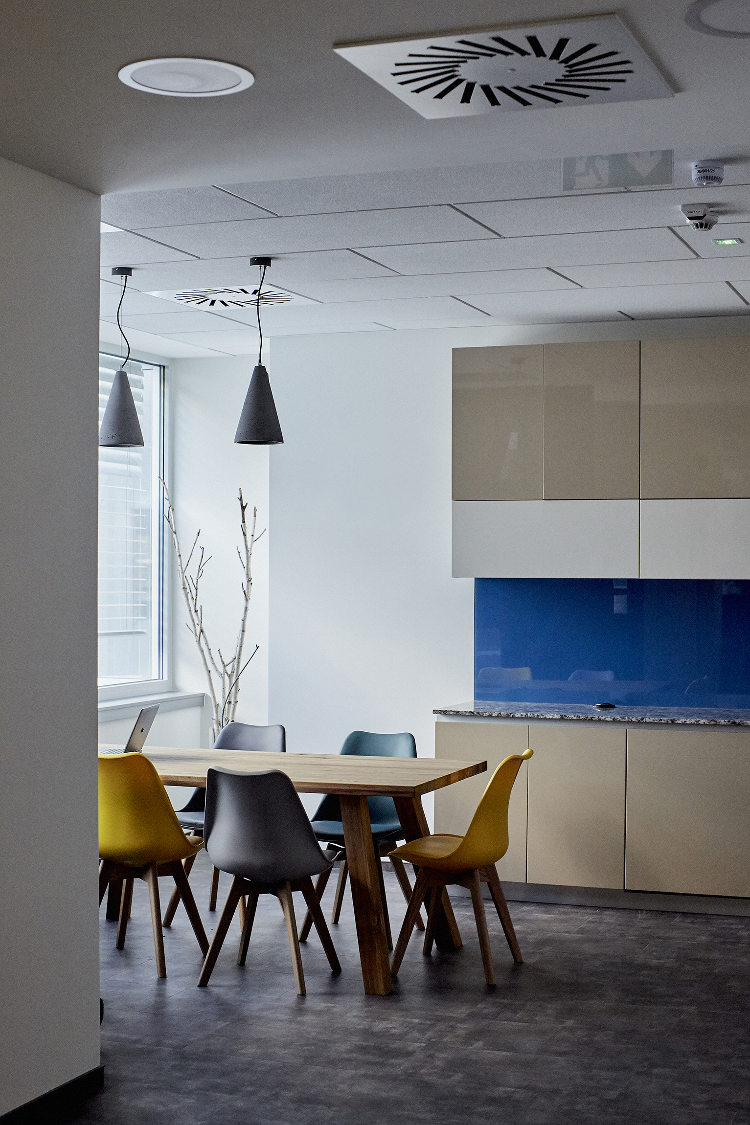 Mivel az iroda egy Skanska által fejlesztett irodaépületben található, megragadtuk az alkalmat, hogy magát az épületet, vagyis a Skanska munkájának gyümölcsét is elegánsan bemutathassuk, így nem került takarásra a mennyezet vasbeton felülete, az elektromos installációk kábelezése, és a gépészet sem.