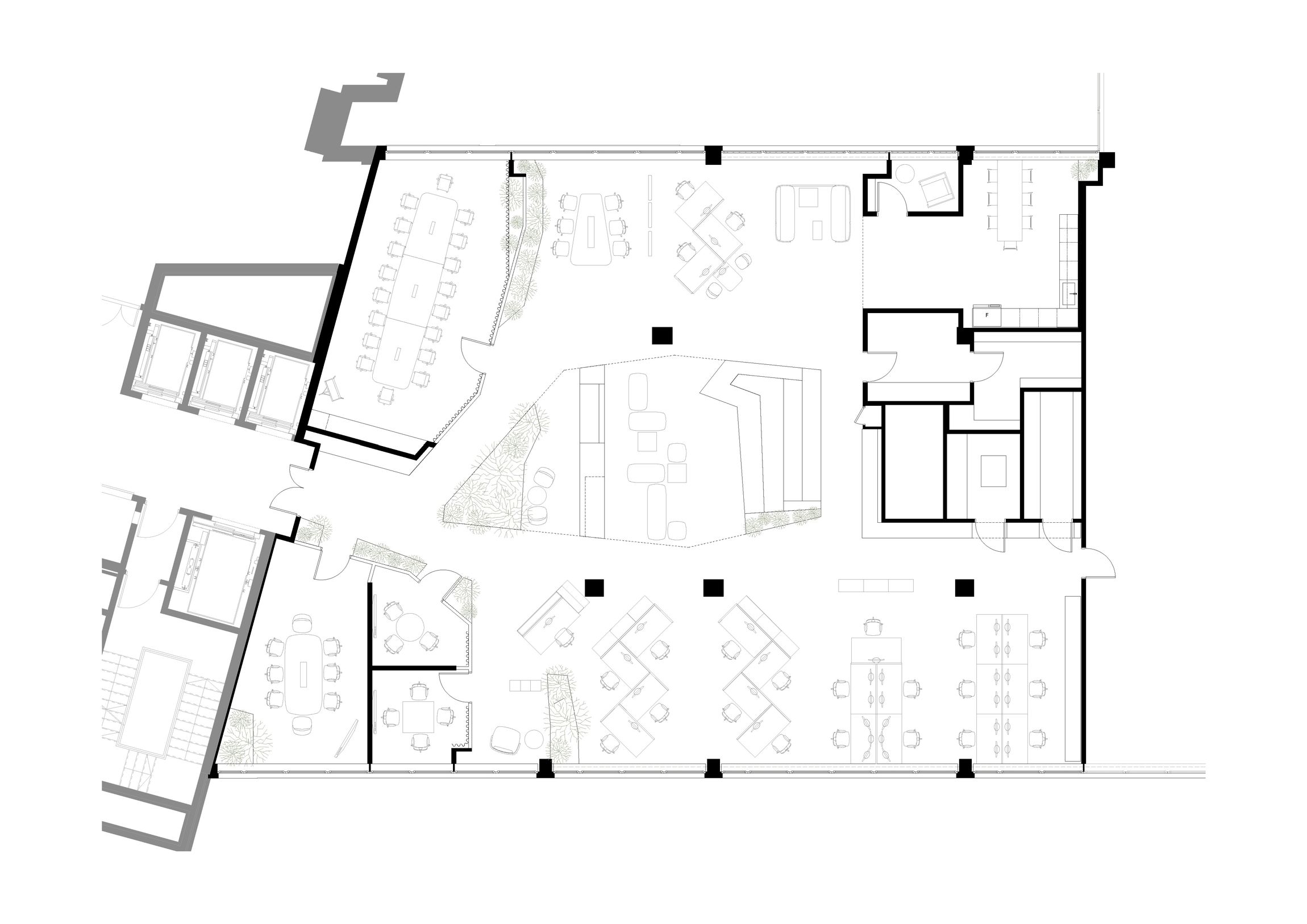 Az iroda szíve a tér közepén található nagyméretű, amfiteátrum jellegű tárgyaló tér. Itt kerül heti rendszerességgel megrendezésre a majdnem minden kollégát érintő nagy összejövetel. Az élénk munkaóránkon túl a hely alkalmas kreatív megbeszélésekre, kisebb összeülésekre, prezentációkra is, de akár további, flexibilisen használható munkafelületként is értelmezhető.