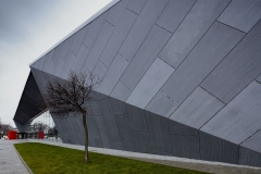 Másrészt, gyalogosan megközelítve, tiszta, időtálló, nemes, vagány, modern, szerethető, “tapintható” homlokzatra van szükség. A terület délkeleti sarka felől érkeznek a legtöbben, ami egyben a telek legmagasabb pontja is, így innen is remek rálátás nyílik, majd az épületet megközelítve, a formák játékos kibomlása során, az előtető alatt lehet megközelíteni a főbejáratot.