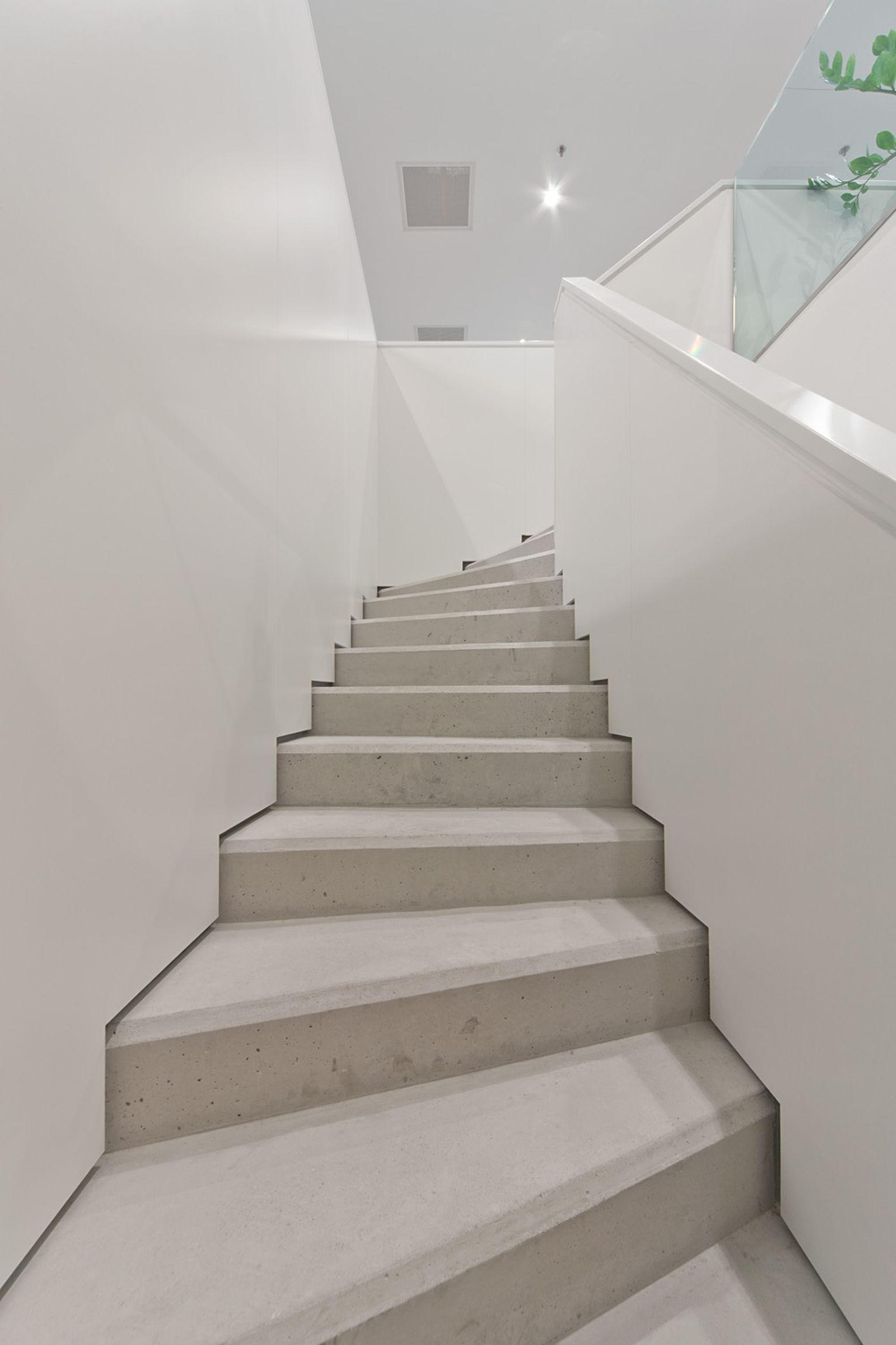 A járófelület maga a teherhordást is biztosító látszó vasbeton szerkezet. A lépcsőt csak kívülről takartuk el fehér burkolattal, mely egyben a mellvédet és fogódzót is alkotja.