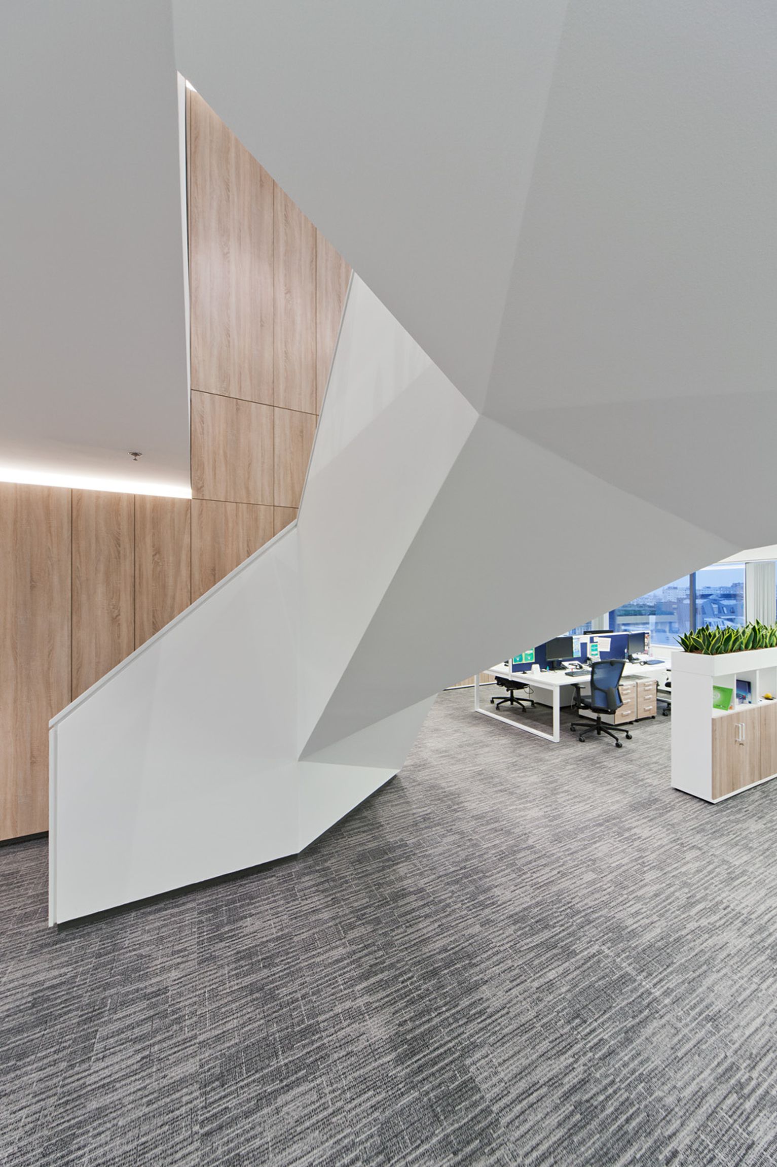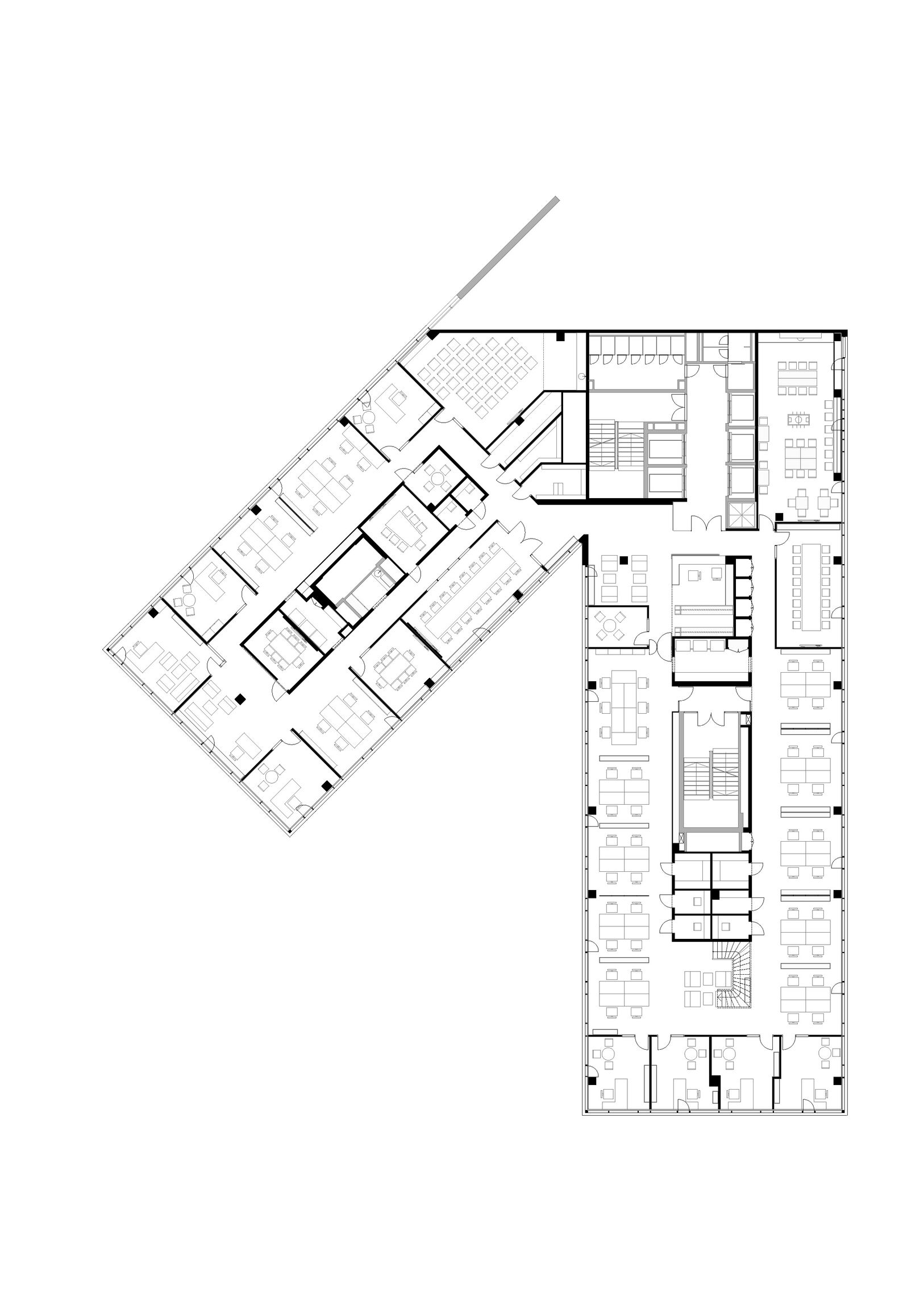 Mivel az irodaterület két szinten található, és a különböző egységek szorosan együtt dolgoznak, menet közben szükségessé vált egy belső lépcső kialakítása is. Így az egymáshoz gyakran átjáró dolgozóknak nem kell kimenniük a közös irodaházi lépcsőházba, ha munkatársaikkal szeretnének személyesen beszélni.