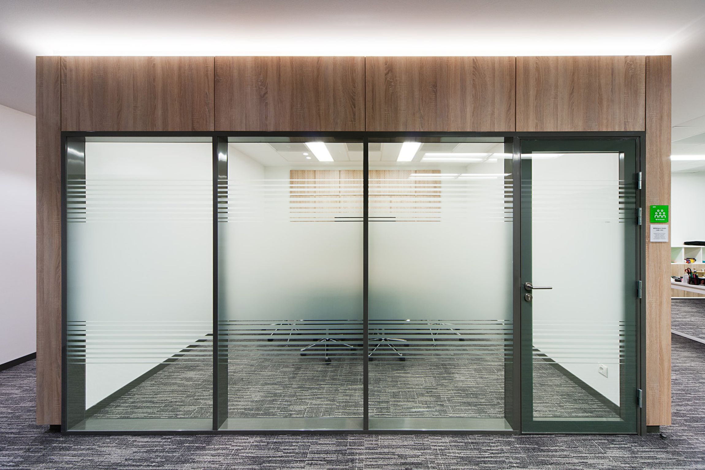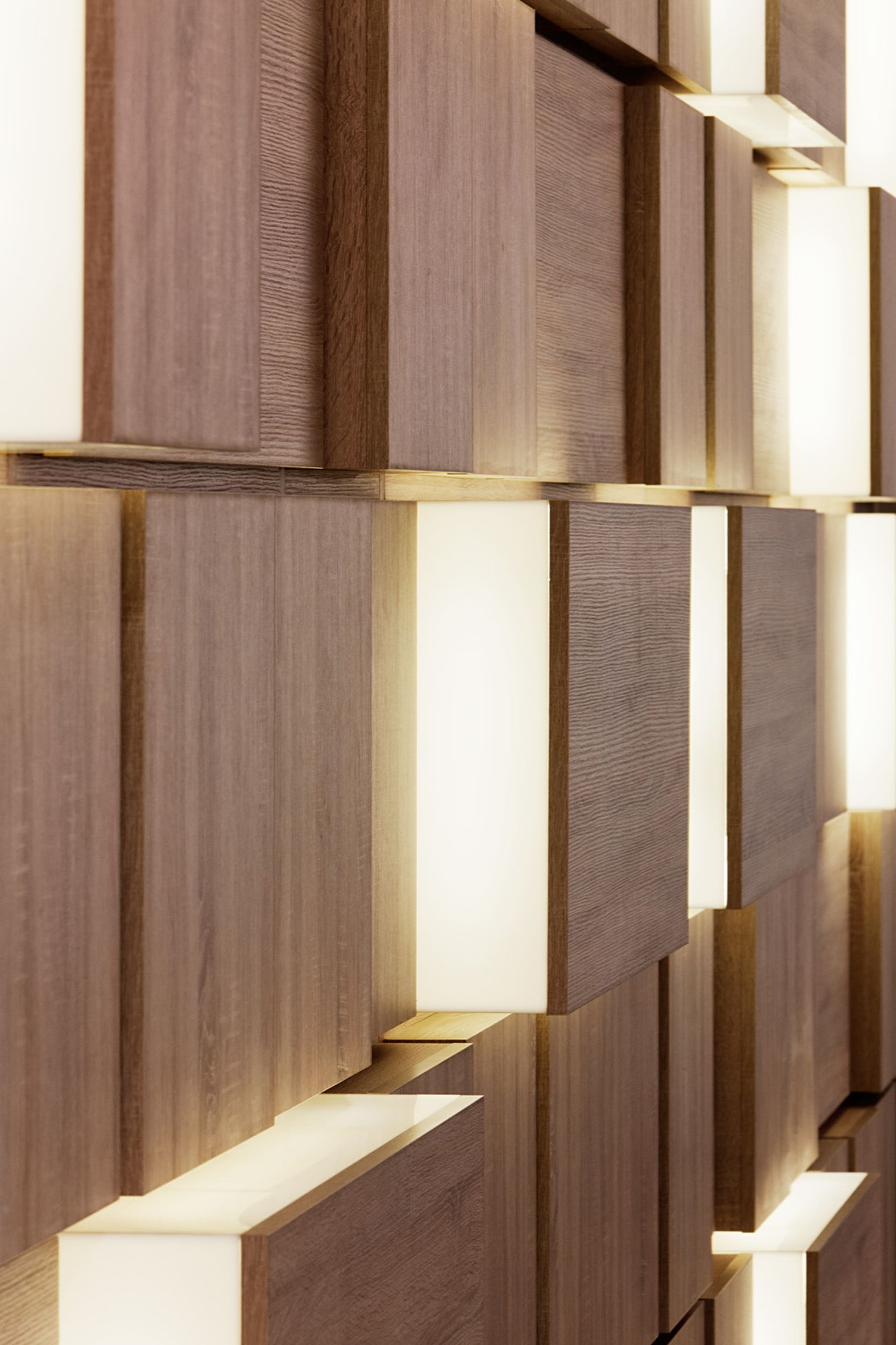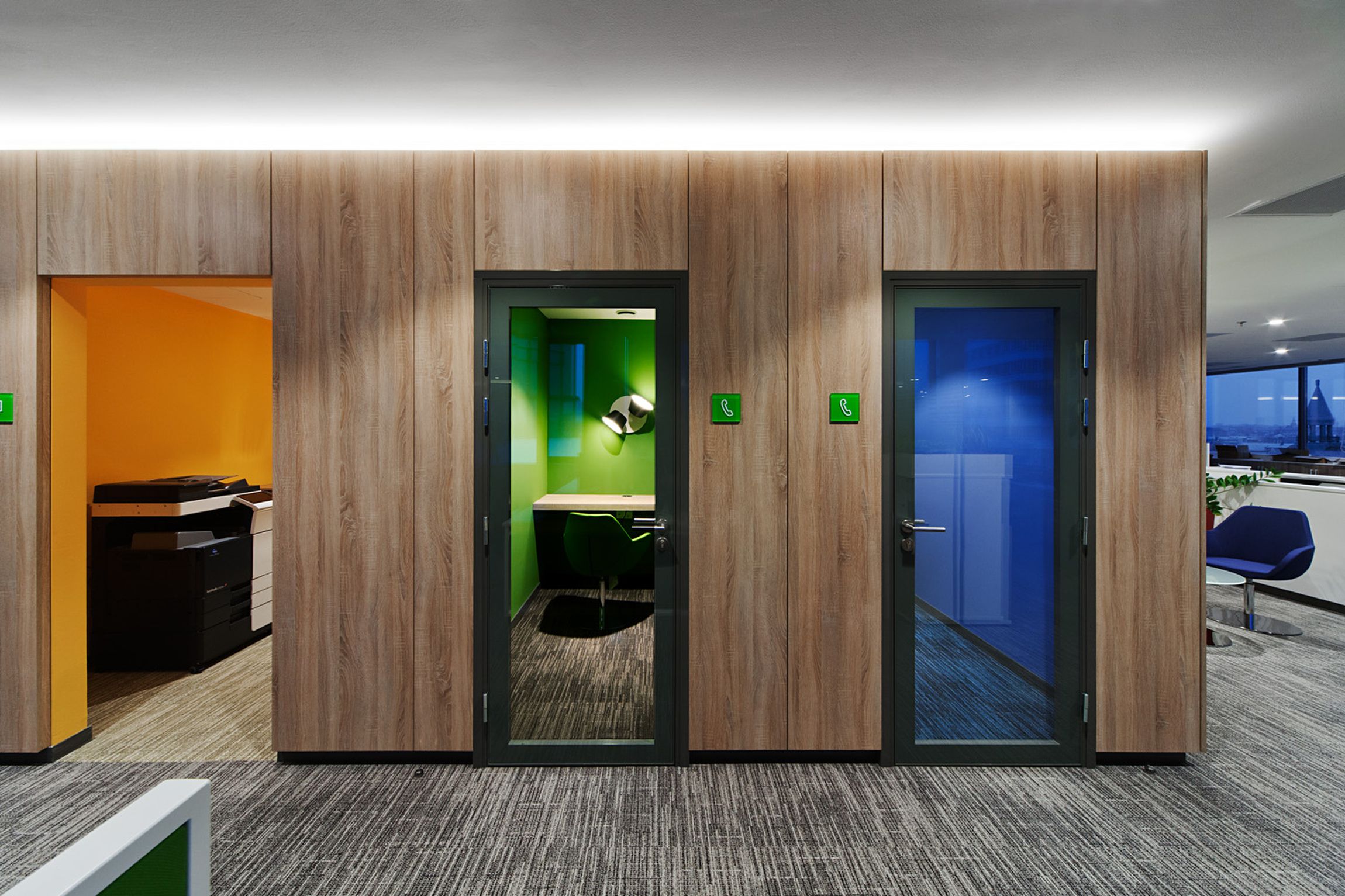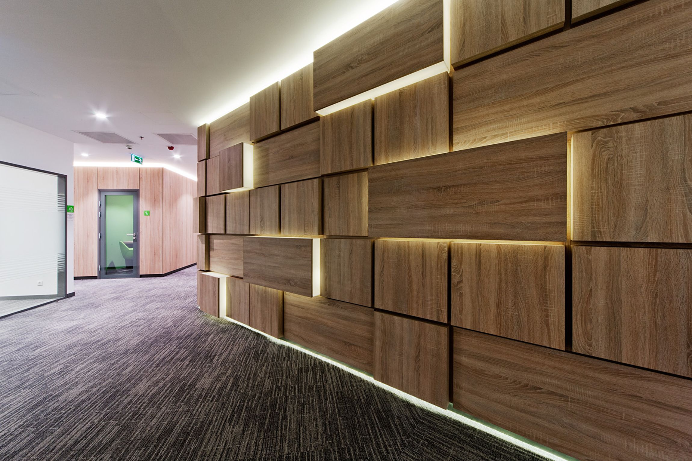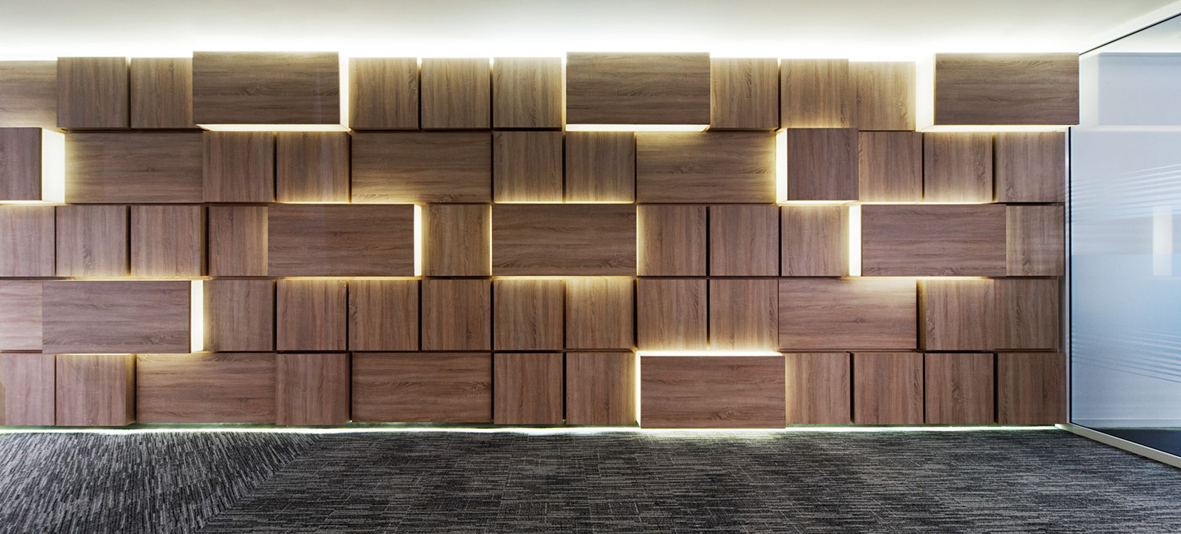 Ennek megformálásához az arculatban is megjelenő arányrendet és az irodában már máshol is megjelenő faanyagot használtuk fel: „fadobozok” jelennek meg, véletlenszerűen ismételve és forgatva, egyedi rejtett LED világítással kiemelve a falsíkból.