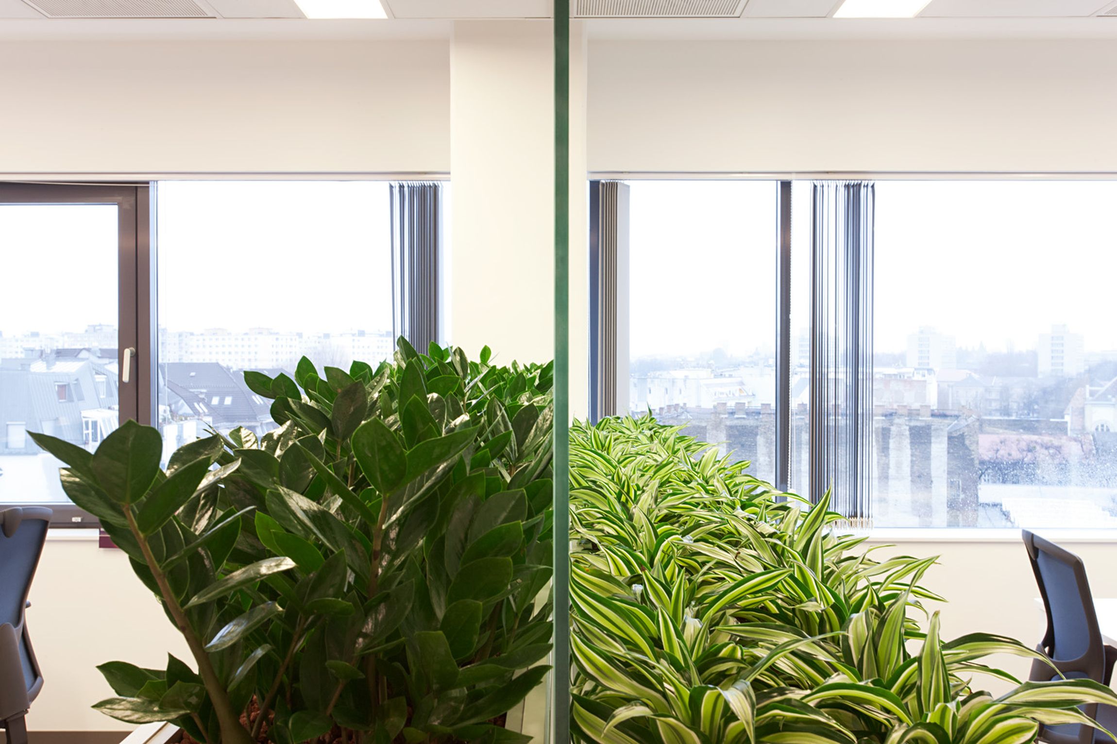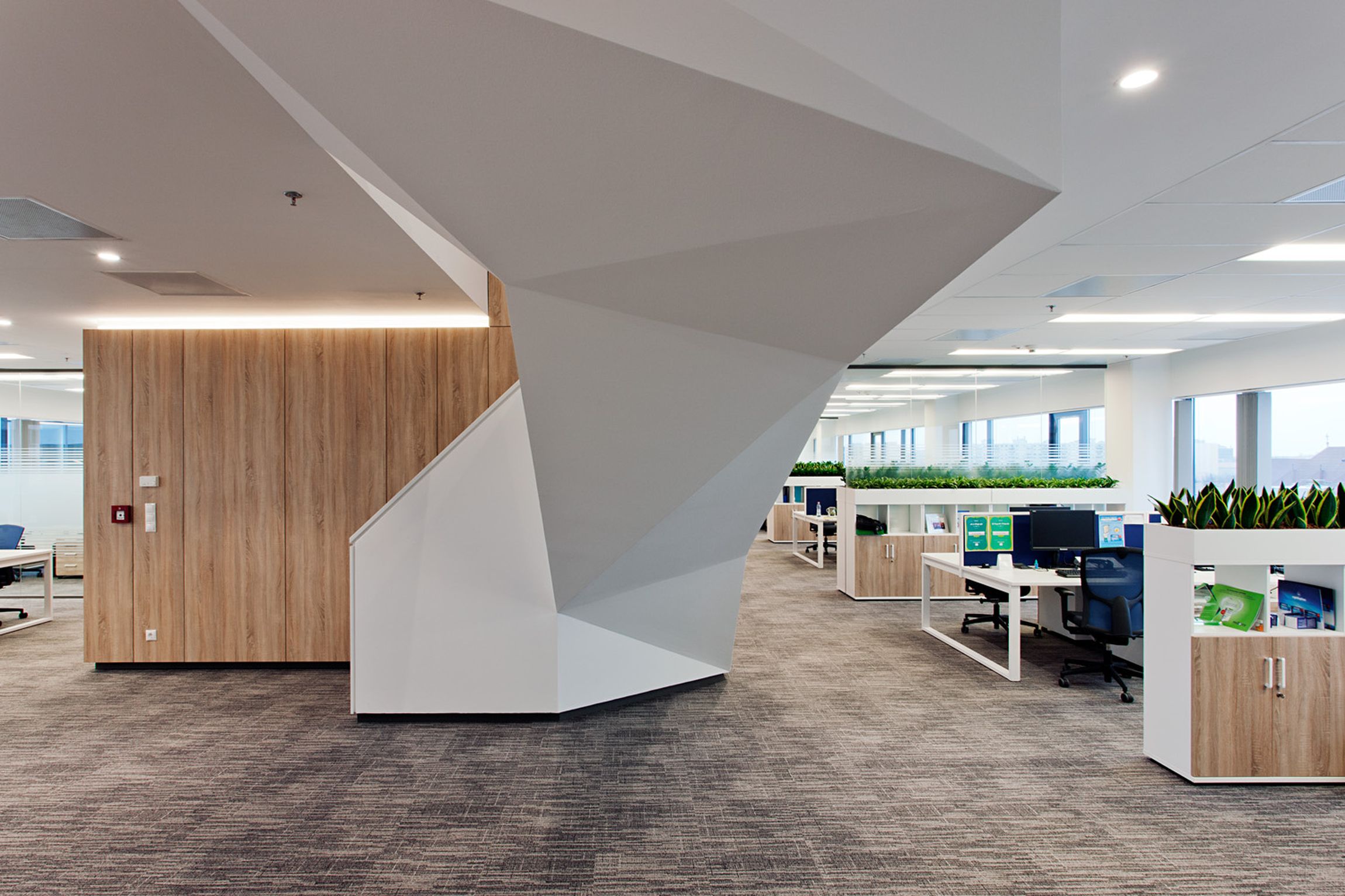 Az egymástól üvegfalakkal tagolt egyterű és cellás irodák esetében is igyekeztünk a lehetőségekhez mérten a természetes megjelenésre, így egyes bútorelemek, a középső zárt magon használt fa mintázatú burkolatot öltötték fel. Tovább humanizáltuk a teret azzal, hogy a munkacsoportok elválasztásánál, és egyes további pontokon élő növényeket telepítettünk. Az irodatérben megjelenő egységes növénybeültetést a tárgyalókban vegyes beültetésre cseréltük. A keretekbe foglalt növényzet a rendezettség érzetét hivatott meghozni a természet becsalogatásával.