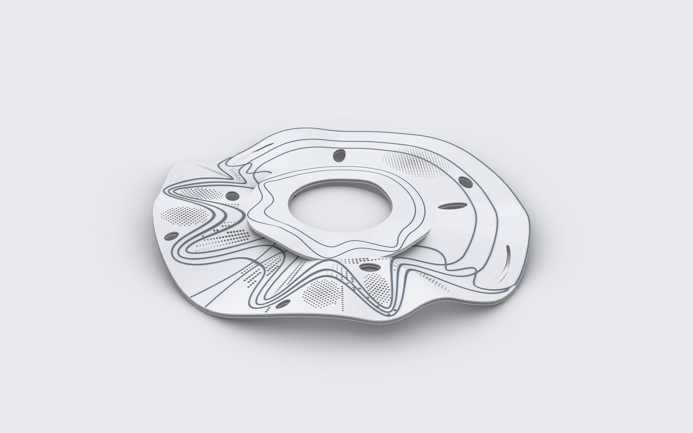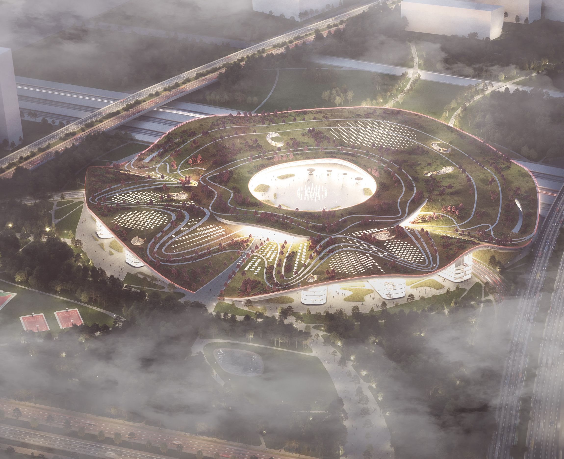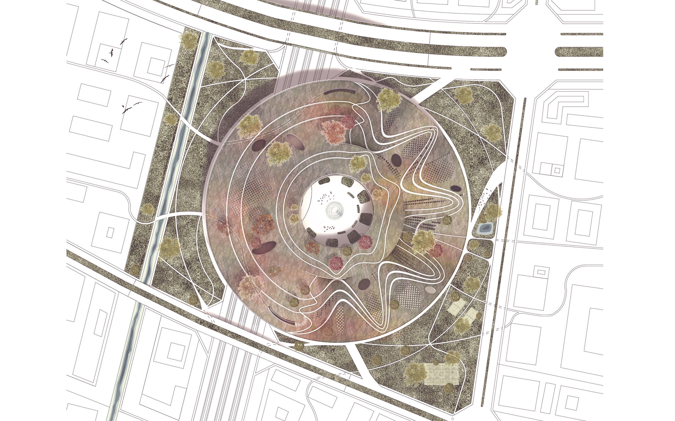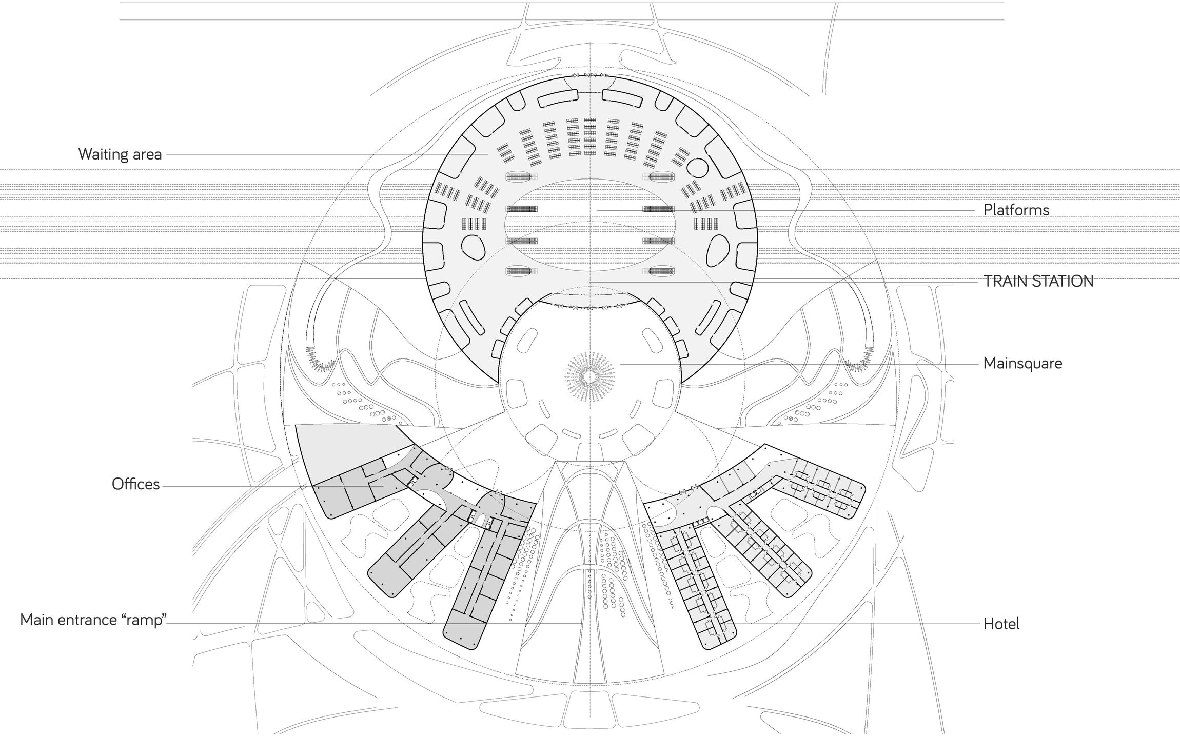A szíve egy találkozásra, időtöltésre is alkalmas köztér, melyet a talajszinttől jelentősen megemeltünk. Így ez egyrészt a vasútvonal, és kiszolgáló funkciók fölé kerül, ahonnan a környezetre rálátás nyílik, másrészt tág területen eltüntethető a teljes gépjármű forgalom. Innen minden kényelmesen, zöld rámpákon elérhető, lankás dombok közötti sétára emlékeztető módon. Nem csak a telken épülő iroda és hotel épületekhez is jó kapcsolatot biztosít, hanem a környék csapásirányaiba is beleszövődik. Ide lépnek ki a vasútállomásról és a metróból az utasok, ide érkeznek fel felvonókkal s lépcsőkön a buszokkal, autókkal érkezők. Nagy szabad tér, mely kerülete mentén fedett-nyitott térré alakul egy lebegő gyűrű segítségével, színes funkcióval szegélyezve, kisebb üzletekkel, éttermek teraszaival. Formája szabályos kör alaprajzú, ahonnan minden útirány egyenrangúnak számít.