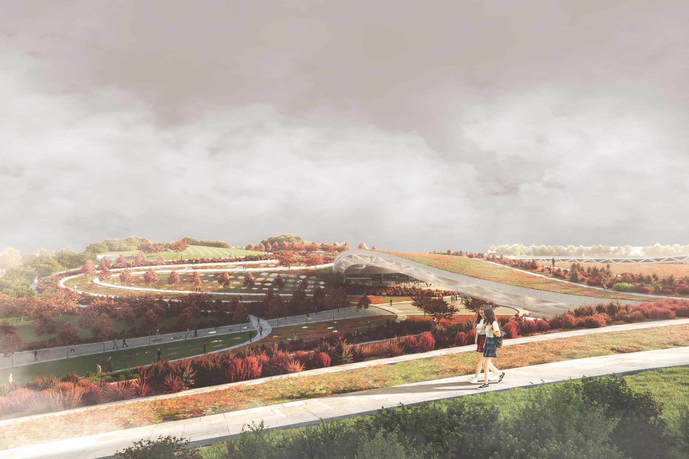 A szimbolikus elemek csak nagyobb léptékből válnak értelmezhetővé. A dombok a közelben található szent hegyek vonulatait idézik. Egyik nézetéből az építmény szimmetriát mutat, felelevenítve a kínai építészeti hagyományokat. A magasból a kör hasonlóan viselkedik, mint a piros pötty az információs táblák térképén, az utazó aktuális helyének jelölésére. Ön itt áll. Egyezményes jel – Keleten és Nyugaton is. Mély együttérzésünk a kínai űrhajósé, aki első útján csalódottan kereste a Nagy Fal görbéjét az ablakban – talán az esti földgömbön Xi’ant már megtalálja, amikor újra a csillagok közé4 emelkedik.